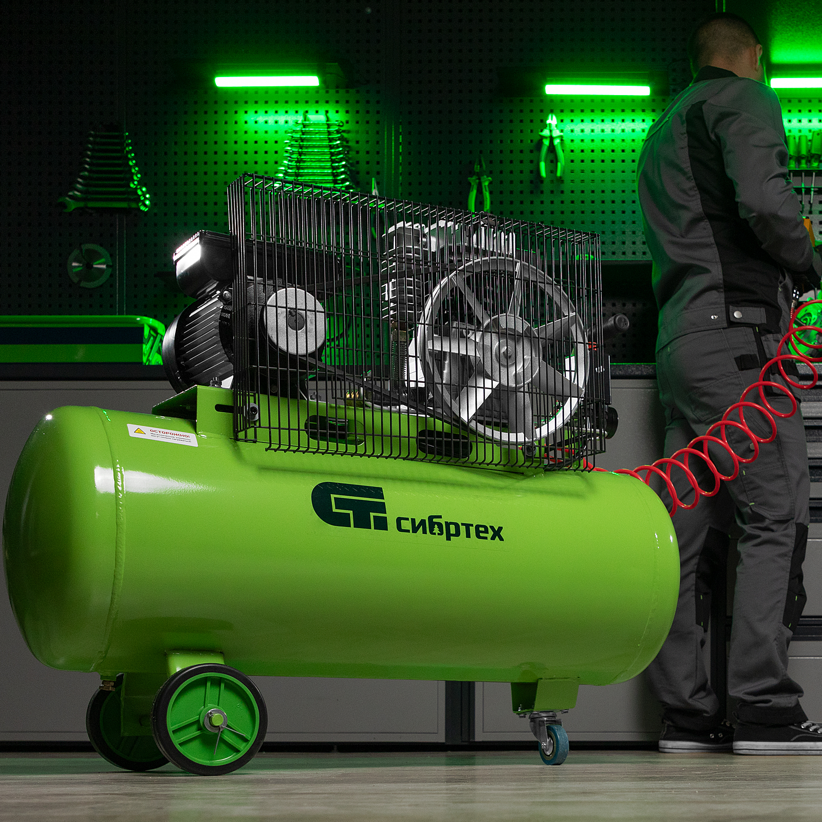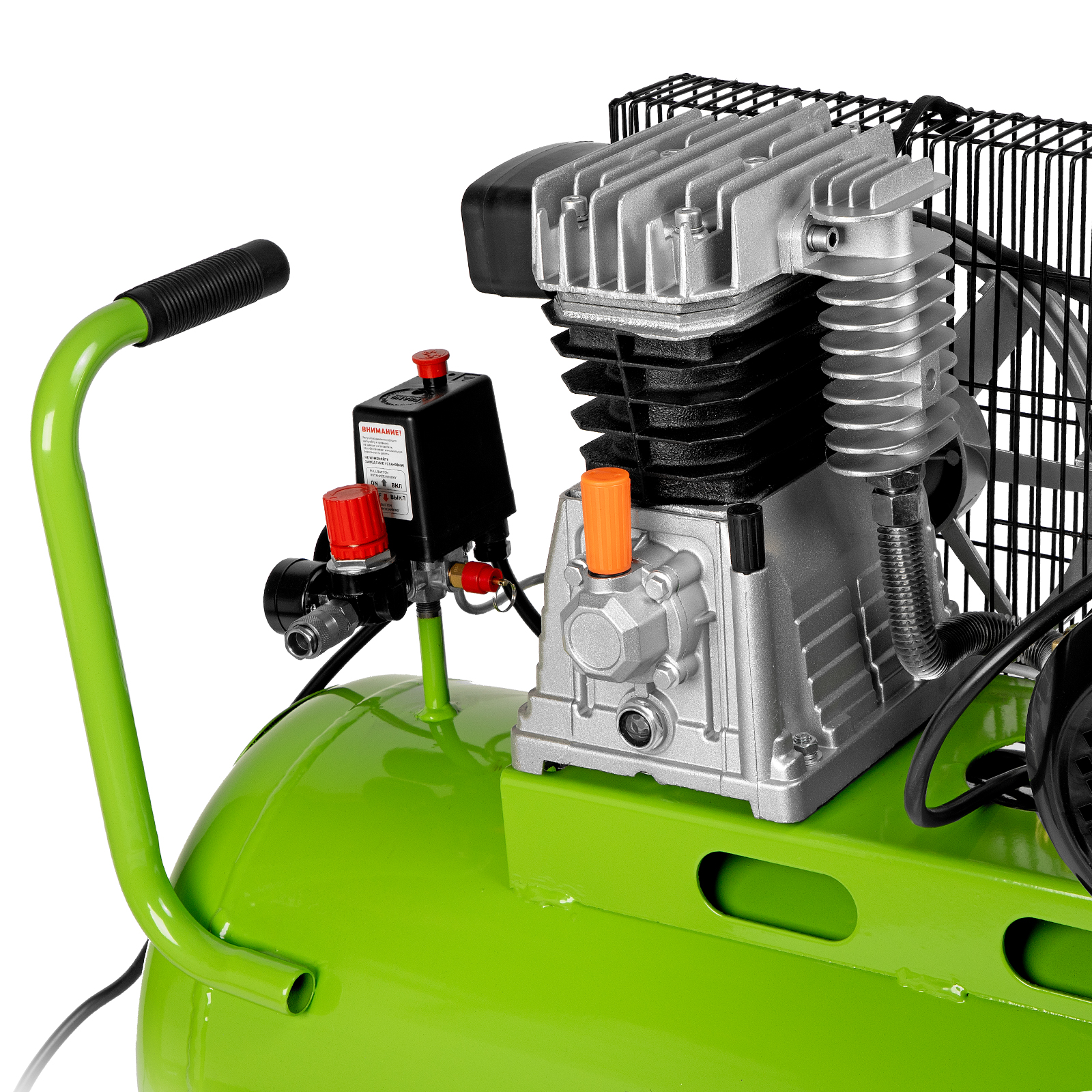 Масляный компрессор с ременным приводом относится к наиболее производительным моделям. Мощность 2.2 кВт, позволяет генерировать 350 л сжатого воздуха в минуту под давлением 10 бар. Такой производительности хватит для долговременных работ на небольших производствах, в автосервисах, на стройках или СТО. Перед сжатием воздух проходит через фильтр очистки, после — отправляется в ресивер объемом 100 л.,Чугунные цилиндры с большими ребрами охлаждения надежно защищают двигатель от перегрева. Встроенная защита от перегрузки отключит двигатель в случае необходимости, что позволит избежать поломки. Ременной привод защищен металлическим кожухом для безопасности оператора.