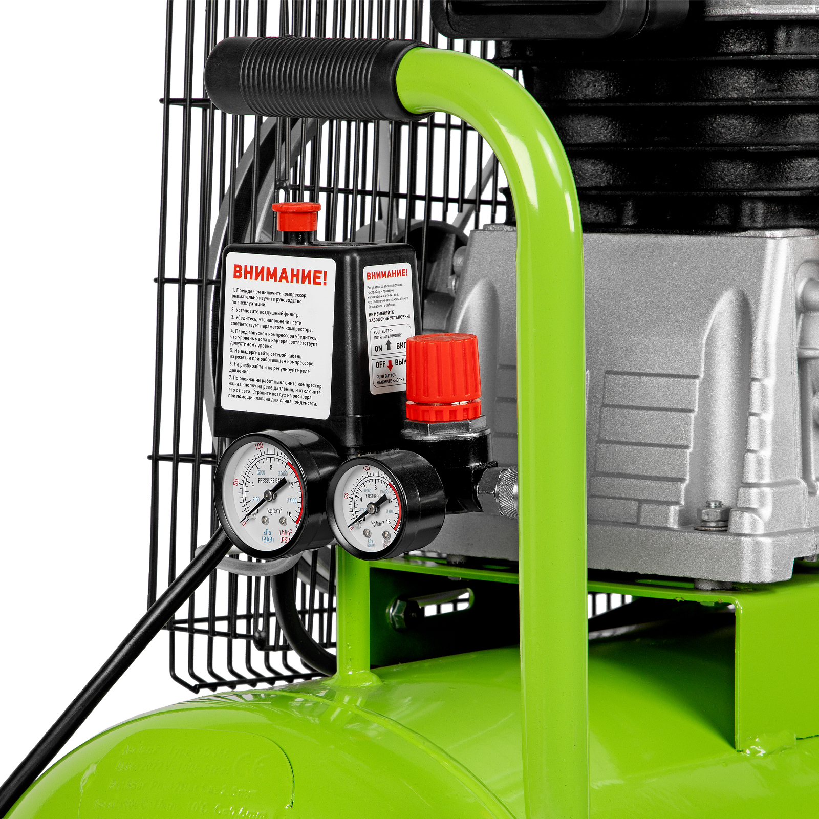 - Реле давления воздуха на выходе — регулятор обеспечивает подачу воздуха в диапазоне давления 6-8 бар и не дает компрессору работать с повышенной нагрузкой.