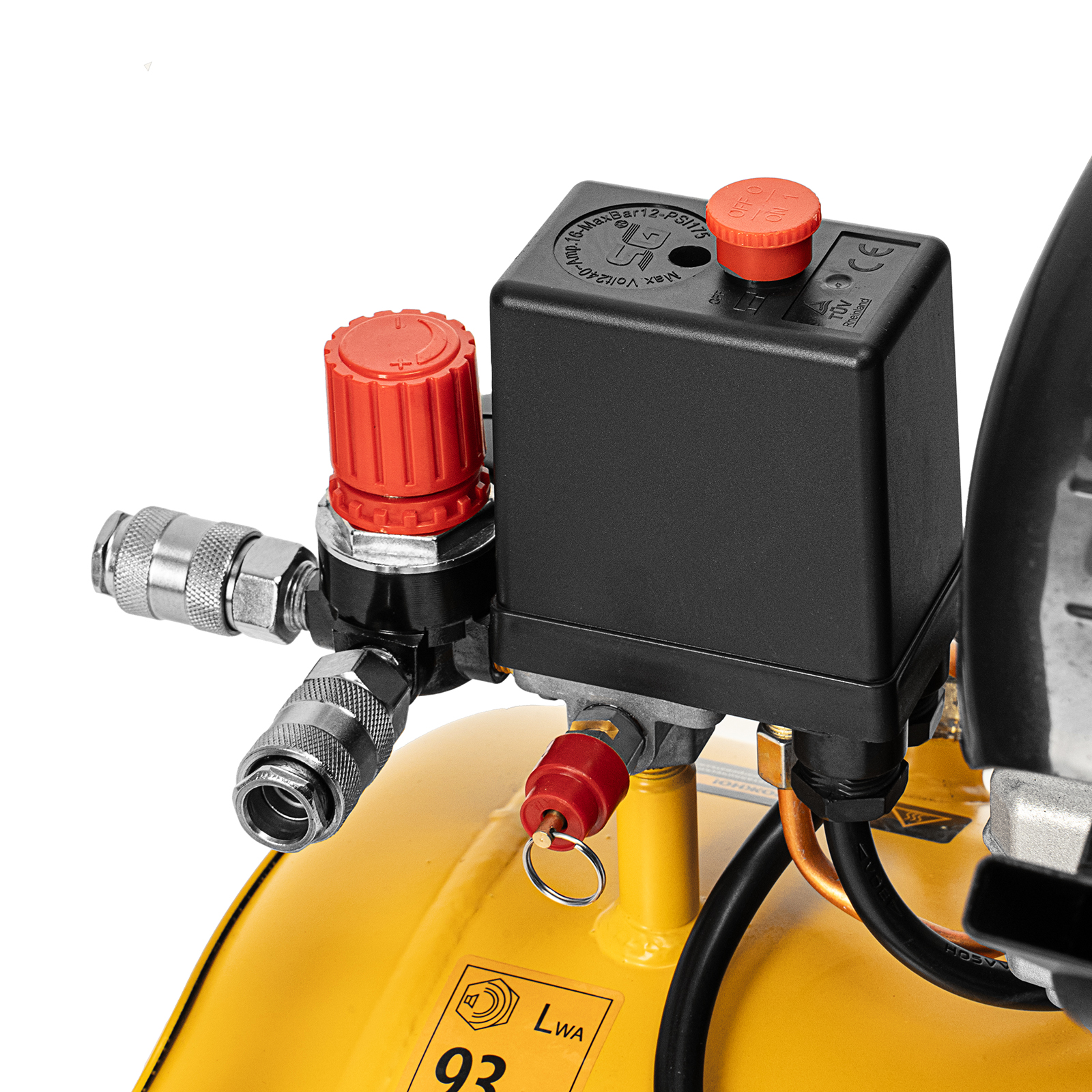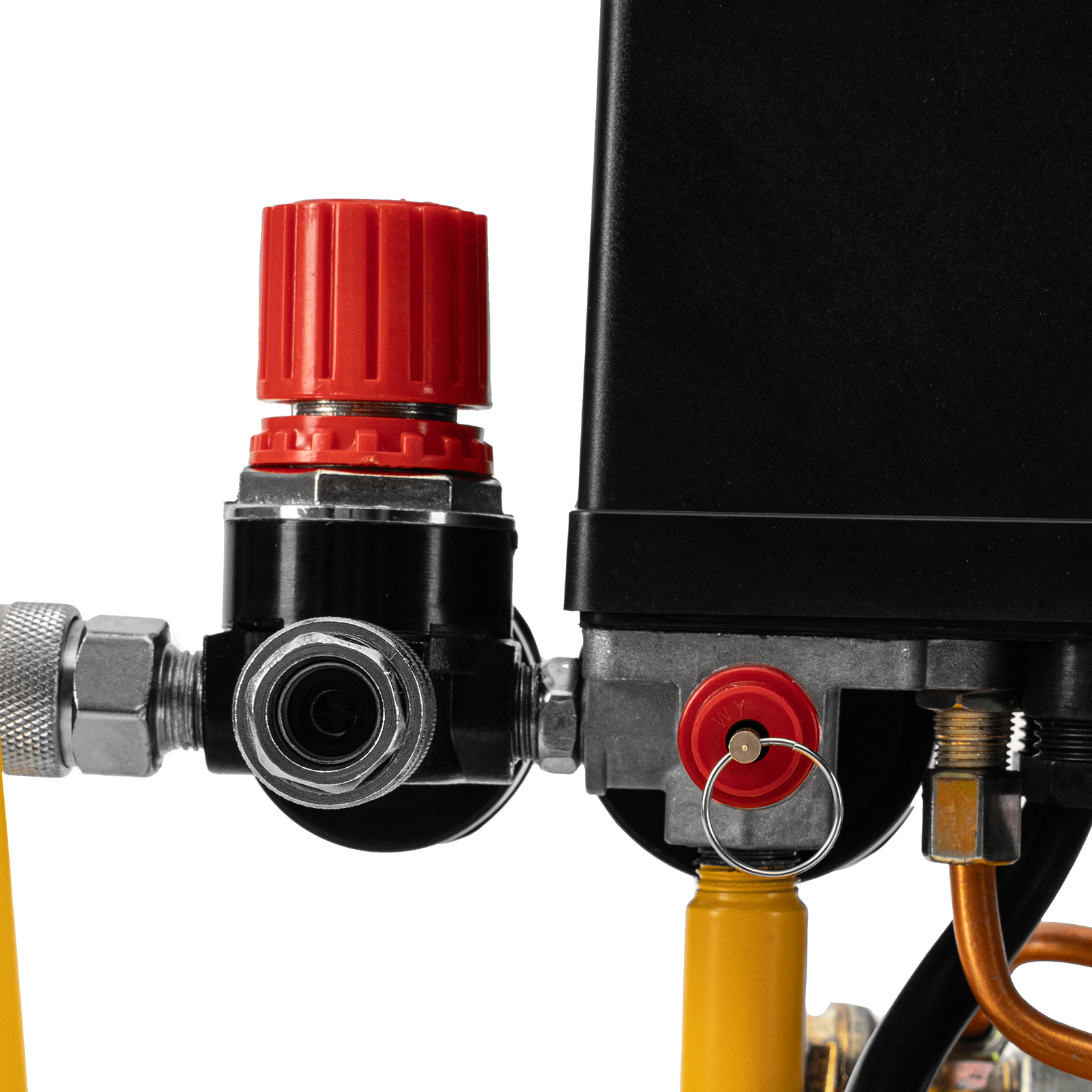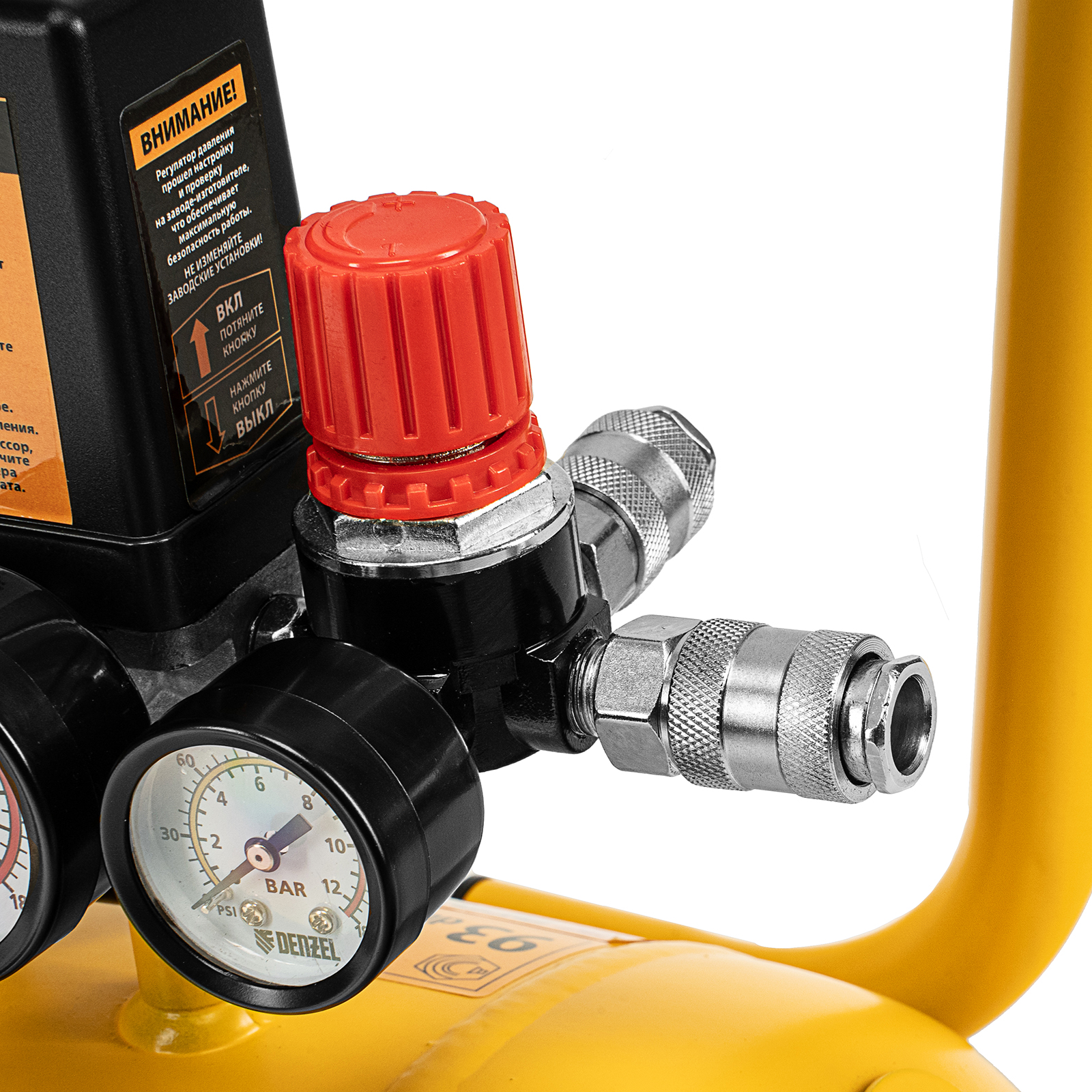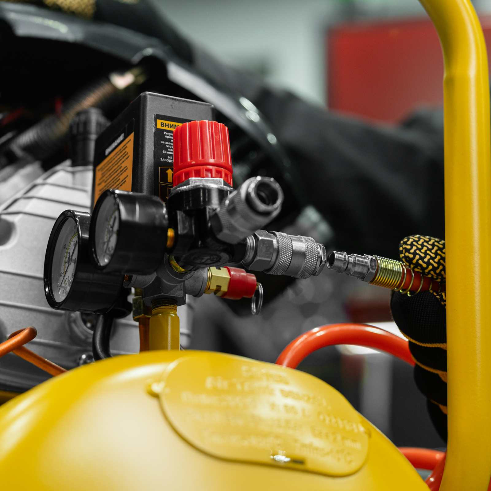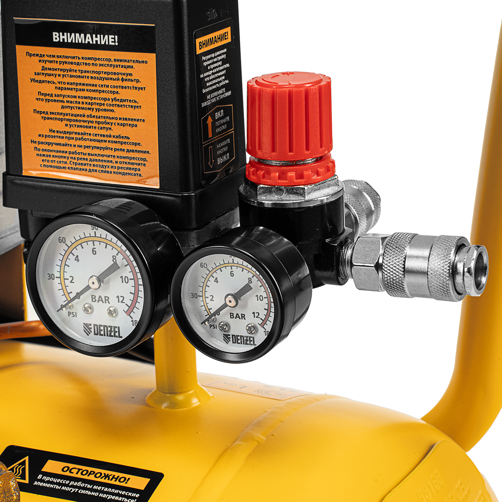 - Контроль давления и расхода воздуха — компрессор оснащен регулятором и двумя манометрами.