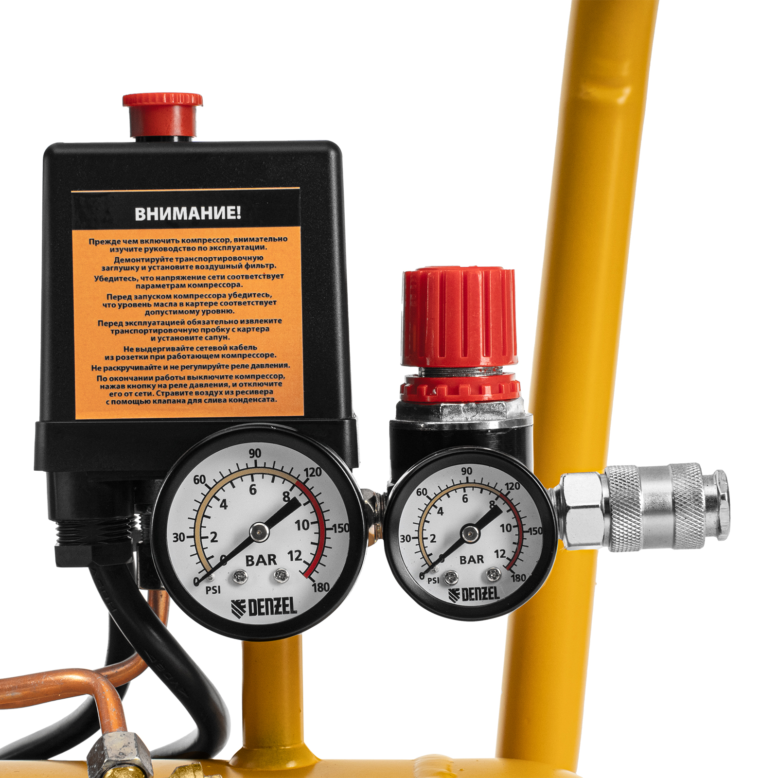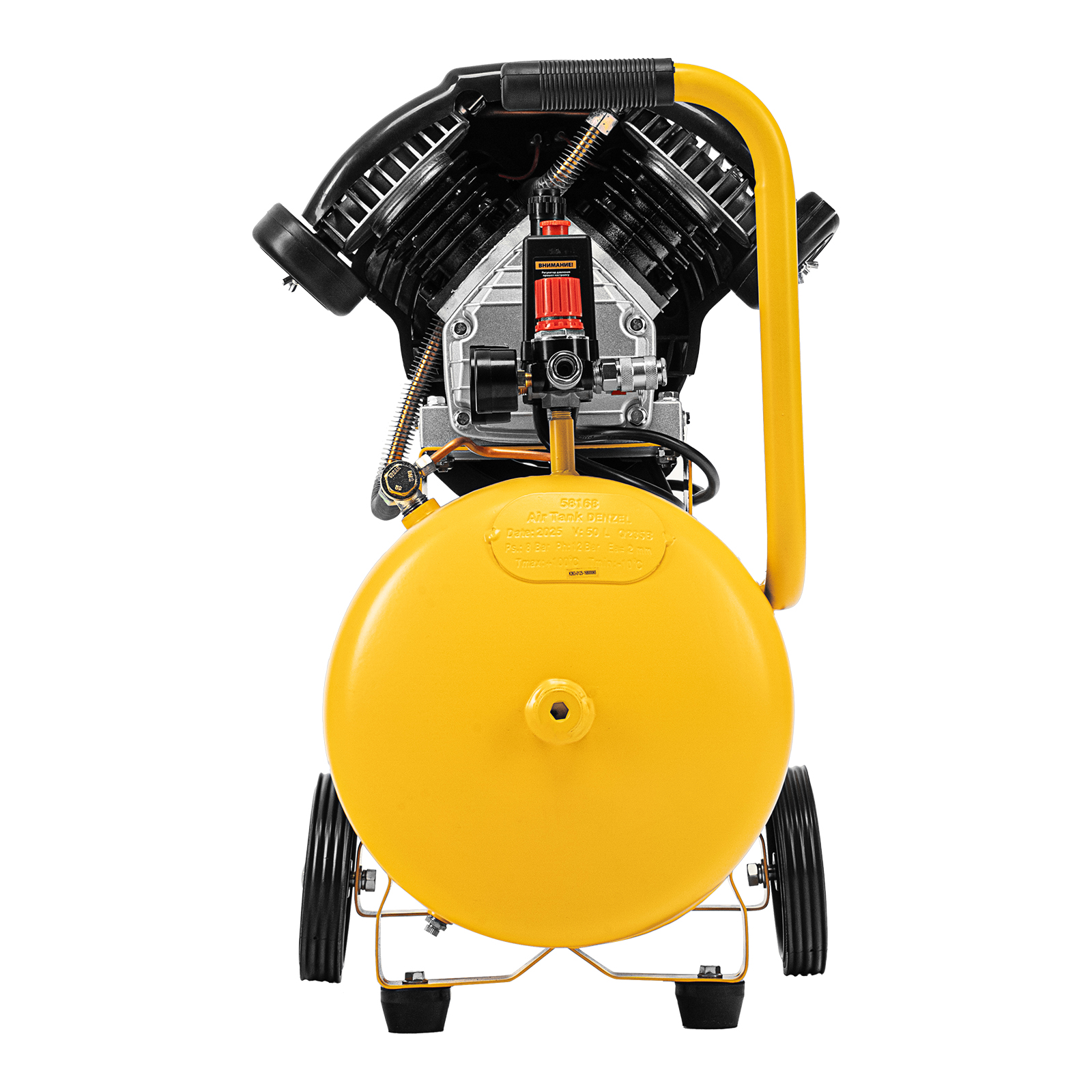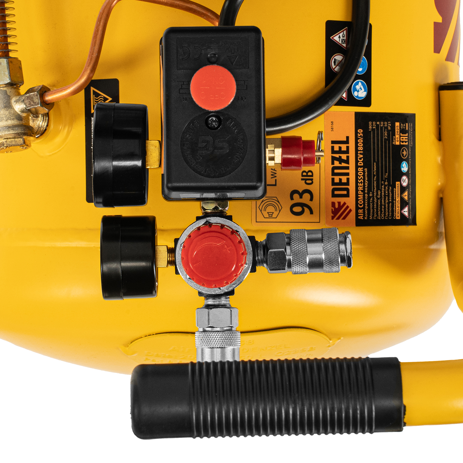 Воздушный компрессор с прямым приводом Denzel DCV1800/50 58168 мощностью 1,8 кВт и производительностью на входе 320 л/мин, с объемом ресивера 50 л, подходит для обеспечения длительной работы пневмогайковерта, пневмозубила, пневмодрели, пневмомолотка или другого пневмоинструмента. Быстроразъемные коннекторы Рапид (Евро) облегчают подключение пневмомагистралей. Эффективная система смазки снижает износ деталей и уменьшает нагрузку на двигатель, что позволяет использовать компрессор в профессиональной сфере.