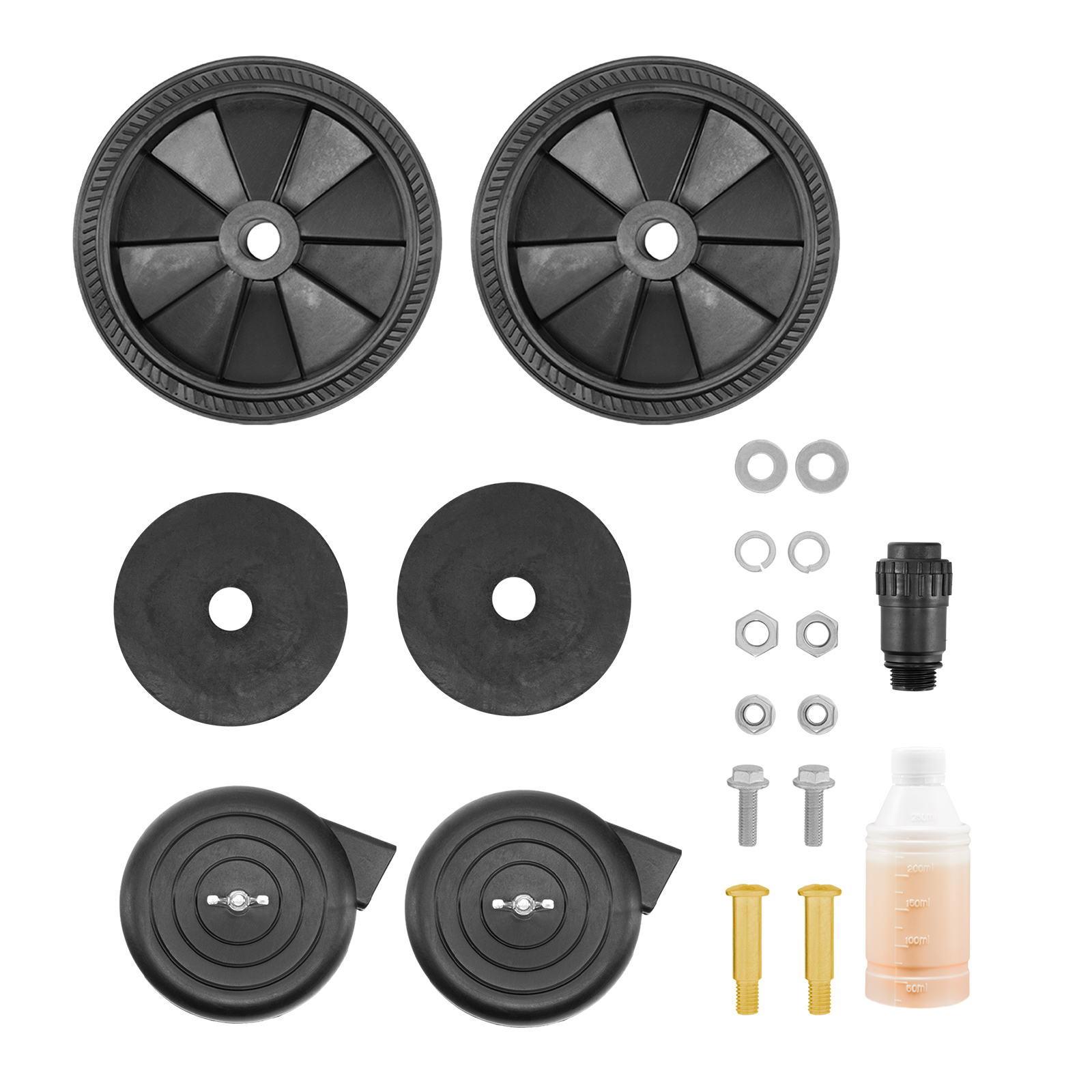 Компрессор - 1 штКолесо с крепежом - 2 штВоздушный фильтр - 2 штВиброопора с крепежом - 2 штСапун - 1 штМасло компрессорное минеральное, марка DAB 100 - 360 млРуководство по эксплуатации с гарантийным талоном - 1 шт |