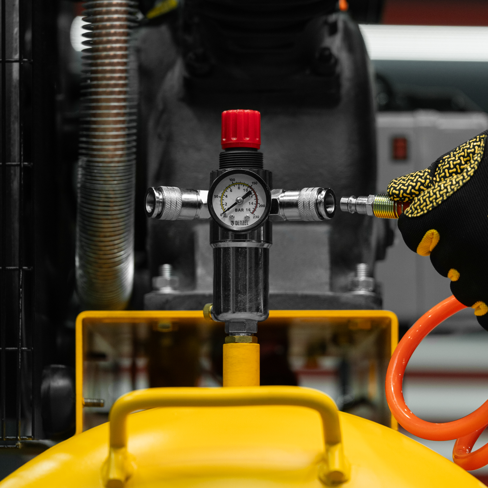 - Регулировка давления на выходе — можно установить оптимальное значение для подключения пневмоинструмента.