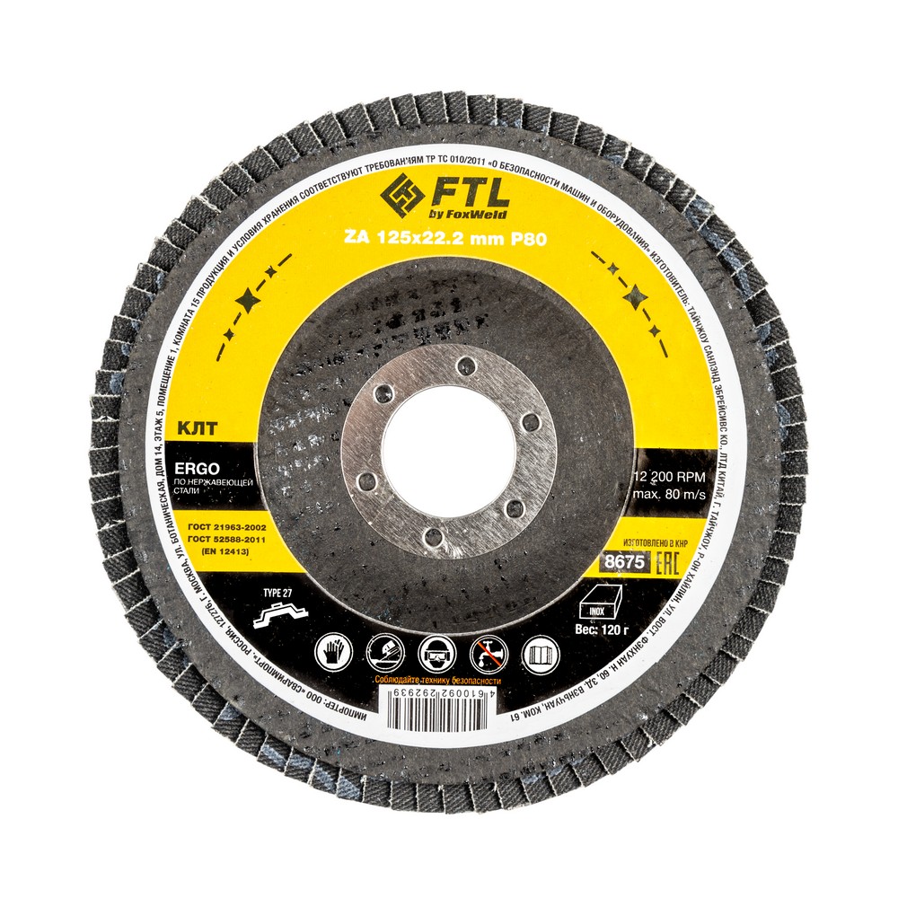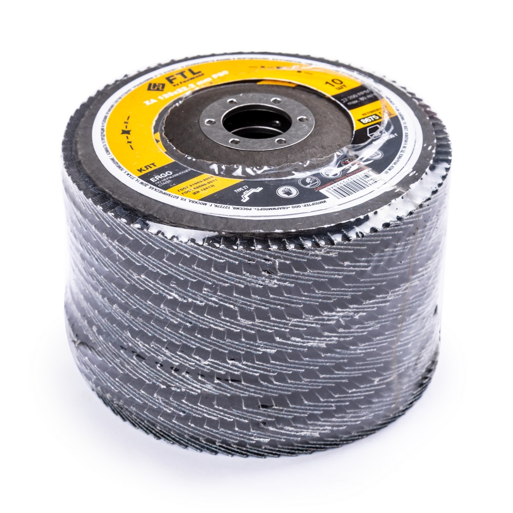 Лепестковый диск для шлифования по нержавеющей стали FTL Ergo 27 125 х 22,2 мм P80 – это расходный материал для ручной угловой шлифовальной машины при работе с изделиями из нержавеющей стали, черных и цветных металлов. Также подходит для обработки твёрдых пород дерева, пластика и полиуретана. Диск предназначен для зачистки и шлифовки сварных швов и кромок стальных заготовок, обработки изделий из нержавеющей стали и полиуретана, шлифовки твёрдых пород дерева. Рабочая поверхность плоского диска ровная и в основном применяется для обработки плоскости и внешних угловых соединений. Оптимальный угол работы для плоского КЛТ – от 0° до 15°. Плоские КЛТ лучше всего подходят для подготовки поверхности и финишной обработки. Удаление материала и финиш происходят за один шаг, что снижает время обработки. Серия ERGO — это универсальный состав из оксида циркония для работы с изделиями из нержавеющей стали. Оксид циркония с лучшей теплопроводностью эффективно отводит тепло из зоны реза, противостоит прижогу и перегреву, сохраняя легирующие свойства нержавеющей стали. Оптимальная формула абразива обеспечивает хороший зацеп с неплохой износостойкостью.ИЗНОСОСТОЙКОСТЬ: Благодаря премиальной формуле режущая и шлифовальная способность абразива снижается в процессе работы значительно медленнее, позволяя выполнить больше работы.ЭФФЕКТИВНАЯ РАБОТА С СИЛЬНЫМ ПРИЖИМОМ: Машинная сборка при производстве исключает ошибки при наклеивании лепестков на основание диска, а плотная набивка обеспечивает более сильный прижим во время работы.САМОЗАТАЧИВАЮЩИЙСЯ АБРАЗИВ: Оксид циркония (циркониевый электрокорунд, цирконий) – это вид абразивного зерна, которое имеет свойство самозатачивания благодаря кристаллической «чешуйчатой» структуре. Зерно циркония в процессе работы постоянно скалывается, из-за чего на поверхности шлифовальной бумаги грани всё время остаются острыми. При этом поверхность заготовки однородна, а зерно скалывается вплоть до момента полного износа, что и обеспечивает высокий ресурс работы инструмента.ВЫСОКОКАЧЕСТВЕННЫЙ ОКСИД ЦИРКОНИЯ: Оптимальное соотношение корунда и самозатачивающихся зёрен оксида циркония позволяют эффективно работать с металлом, деревом и пластиком.ДВОЙНОЕ МЕТАЛЛИЧЕСКОЕ КОЛЬЦО: Двойное металлическое кольцо на диске обеспечивает плотную посадку на фланец УШМ, исключая биения и вибрацию при работе.ПРЕИМУЩЕСТВА:Универсальный (по нержавеющей стали и чёрному металлу)Оксид цирконияМинимальное содержание железа, серы, хлора (не окисляет стали)Тип 27 (куполообразный, с плоской поверхностью)Электростатический метод нанесения абразиваЭффект самозатачиванияВозможность работы с большим прижимом (требуется мощная УШМ)Фибергласс – прочное стекловолоконное основание дискаДвойное металлическое кольцо для плотной посадки на фланец УШМВлагозащитная упаковкаФУНКЦИОНАЛЬНЫЕ ОСОБЕННОСТИ:ГЕРМЕТИЧНОСТЬ УПАКОВКИ: Диски упакованы в специальную термоусадочную герметичную плёнку, которая предохраняет от пыли и влаги при длительном хранении в условиях повышенной влажности, на строительных объектах и крупных промышленных производствах.КОМПЛЕКТАЦИЯ: Круг лепестковый для шлифования по нержавеющей стали FTL Ergo 27 125 х 22,2 мм P80 в термоусадочной плёнке со вкладышем в дополнительном ПЭ пакете – 10 шт.