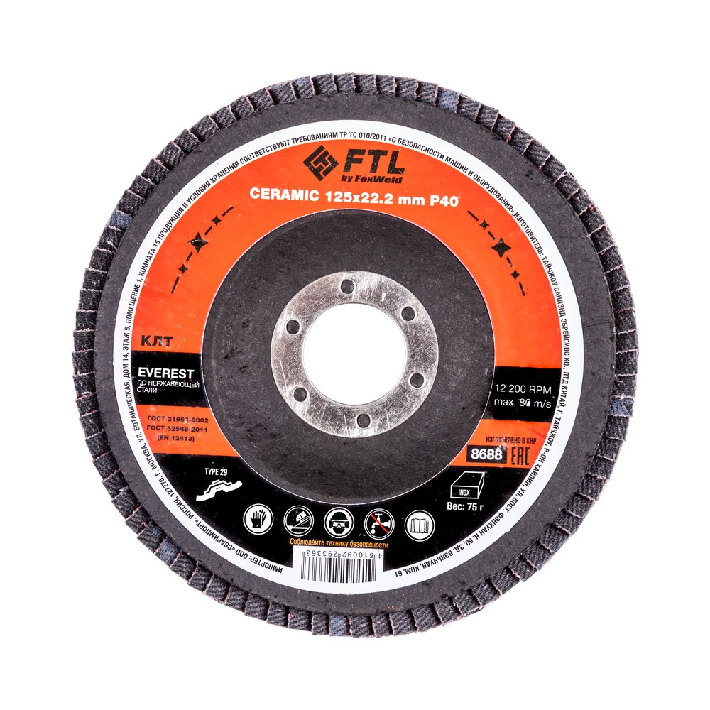 Лепестковый диск для шлифования по нержавеющей стали FTL Everest 29 125 х 22,2 мм P40 – это расходный материал для ручной угловой шлифовальной машины при работе с изделиями из нержавеющей стали, твёрдых сплавов, легированной стали. Диск предназначен для зачистки и шлифовки стальных заготовок, снятия усиления сварного шва, съёма металла, удаления окалины и заусенцев. Коническая форма обеспечивает большое пятно контакта с поверхностью и более агрессивный съём материала. Оптимальный угол работы для конического КЛТ - от 15 до 25 градусов к поверхности. Серия EVEREST — это премиальный инновационный керамический абразив для работы исключительно по изделиям из нержавеющей стали. Электростатический метод нанесения обеспечивает расположение всех абразивных зёрен острыми режущими кромками вверх, перпендикулярно основе. В процессе работы керамические зёрна постоянно сохраняют острую режущую кромку, а отличная теплопроводность керамики наиболее эффективно предотвращает перегрев, что также увеличивает время работы абразива.ИЗНОСОСТОЙКОСТЬ: Благодаря премиальной формуле режущая и шлифовальная способность абразива снижается в процессе работы значительно медленнее, позволяя выполнить больше работы.ЭФФЕКТИВНАЯ РАБОТА С СИЛЬНЫМ ПРИЖИМОМ: Машинная сборка при производстве исключает ошибки при наклеивании лепестков на основание диска, а плотная набивка обеспечивает более сильный прижим во время работы.САМОЗАТАЧИВАЮЩИЙСЯ АБРАЗИВ: Зёрна керамики состоят из ещё более многочисленных и мелких кристаллов по сравнению с оксидом циркония, что обеспечивает ярко выраженный эффект самозатачивания и скалывания в процессе работы. Керамические зёрна постоянно сохраняют острую режущую кромку, а отличная теплопроводность керамики предотвращает перегрев, что также увеличивает время работы абразива. По некоторым исследованиям, керамическое зерно работает в 2 раза агрессивнее, и в 10 раз дольше. чем оксид алюминия.ПРЕМИАЛЬНЫЙ КЕРАМИЧЕСКИЙ АБРАЗИВ: Премиальный компаунд на базе керамического абразива сохраняет остроту режущих кромок до полного износа, не перегревается даже при сильном прижиме и обладает эффектом самозатачивания.ДВОЙНОЕ МЕТАЛЛИЧЕСКОЕ КОЛЬЦО: Двойное металлическое кольцо на диске обеспечивает плотную посадку на фланец УШМ, исключая биения и вибрацию при работе.ПРЕИМУЩЕСТВА:По нержавеющей стали (!)Керамический абразив (лучший по износостойкости и теплопроводности)Минимальное содержание железа, серы, хлораТип 29 (куполообразный, конический)Электростатический метод нанесения абразиваНаилучший эффект самозатачиванияВозможность работы с большим прижимом (требуется мощная УШМ)Двойное металлическое кольцо для плотной посадки на фланец УШМДвойная влагозащитная упаковкаФУНКЦИОНАЛЬНЫЕ ОСОБЕННОСТИ:ГЕРМЕТИЧНОСТЬ УПАКОВКИ: Диски упакованы в специальную термоусадочную герметичную плёнку, которая предохраняет от пыли и влаги при длительном хранении в условиях повышенной влажности, на строительных объектах и крупных промышленных производствах.КОМПЛЕКТАЦИЯ: Круг лепестковый для шлифования по нержавеющей стали FTL Everest 29 125 х 22,2 мм P40 в термоусадочной плёнке со вкладышем в дополнительном ПЭ пакете – 10 шт.
