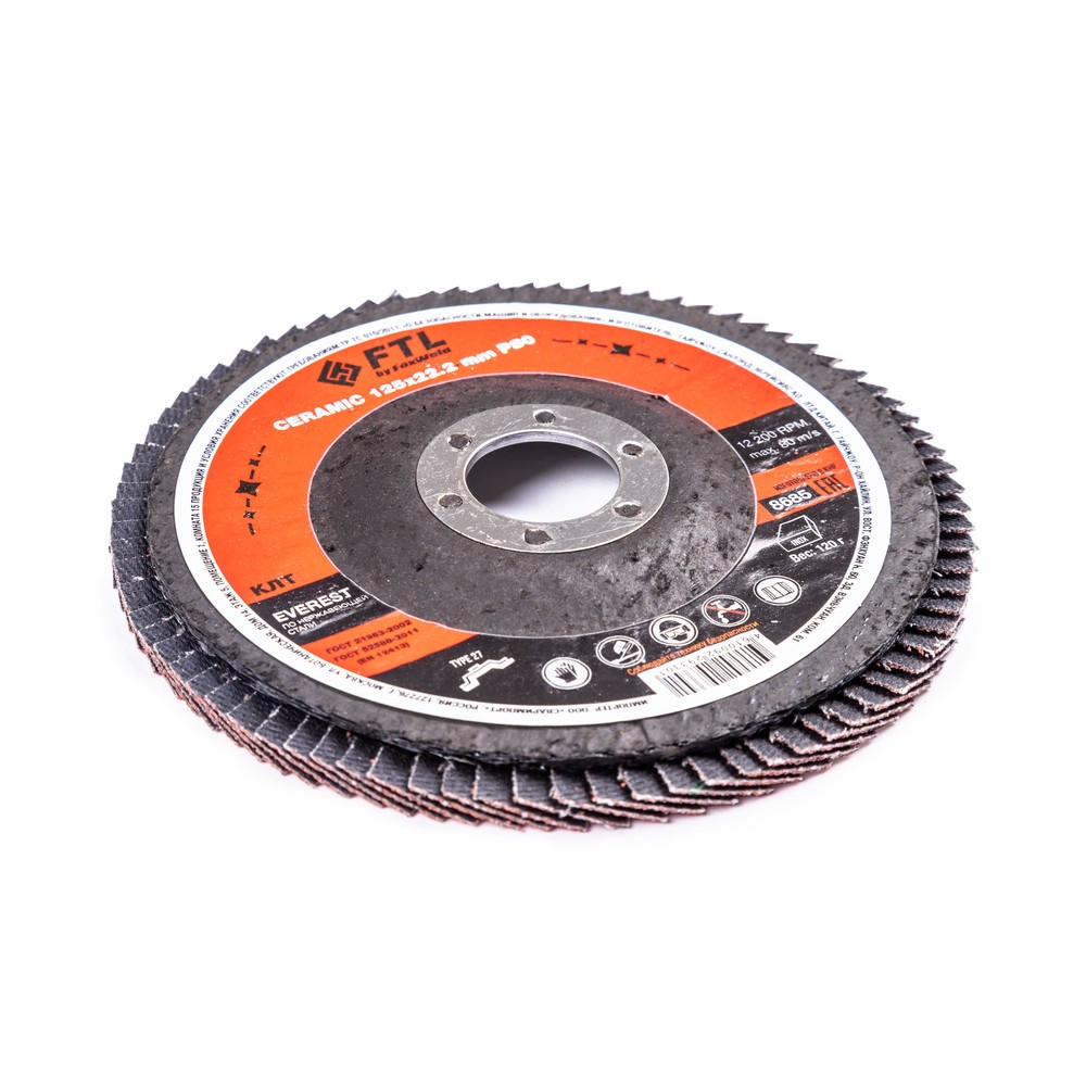Круг лепестковый с керамическим абразивом для шлифования по нержавеющей стали FTL Everest 27 125 х 22,2 мм P80