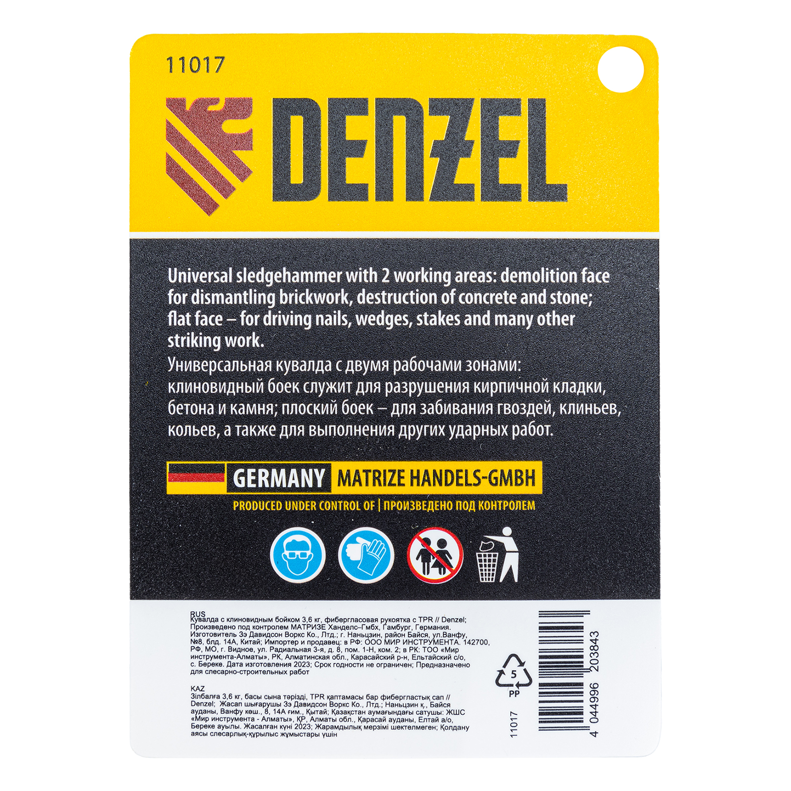 Кувалда Denzel 11017 с клиновидным бойком весом 3,6 кг и фибергласовой рукояткой с TPR-покрытием предназначена для проведения демонтажных работ. Удлиненная рукоятка позволяет наносить удары большой силы. Две рабочие зоны делают инструмент универсальным в работе: клиновидный боек позволяет разрушать кирпичную кладку, конструкции из бетона и камня, а плоский боек — забивать большие гвозди, колья, клинья и выполнять другие ударные работы. Кувалда также подходит для правки автомобильных дисков и проведения сборочных работ. Рекомендована для профессионального применения.