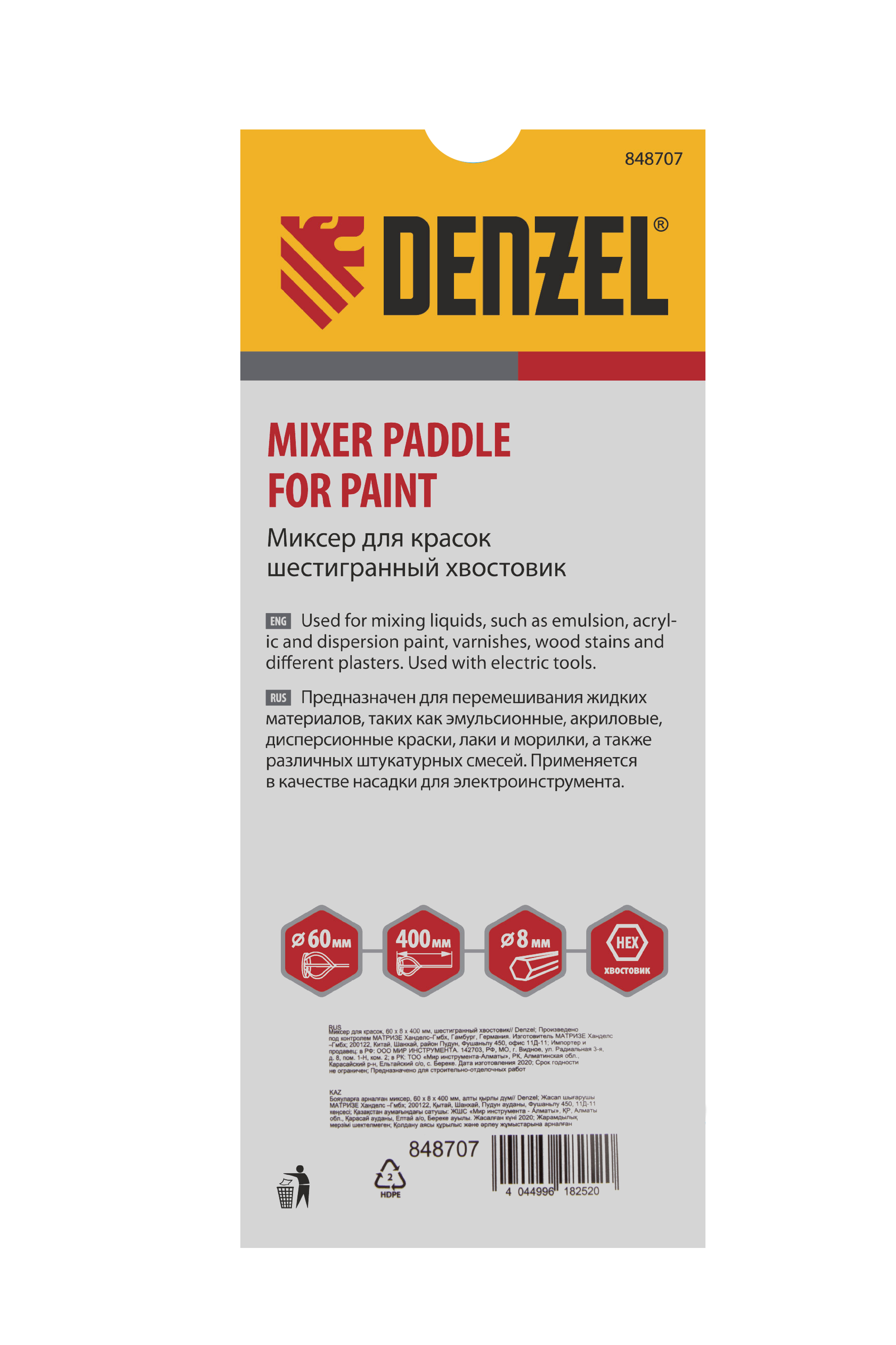 Миксер для красок, 60 х 8 х 400 мм, шестигранный хвостовик Denzel в Санкт-Петербурге