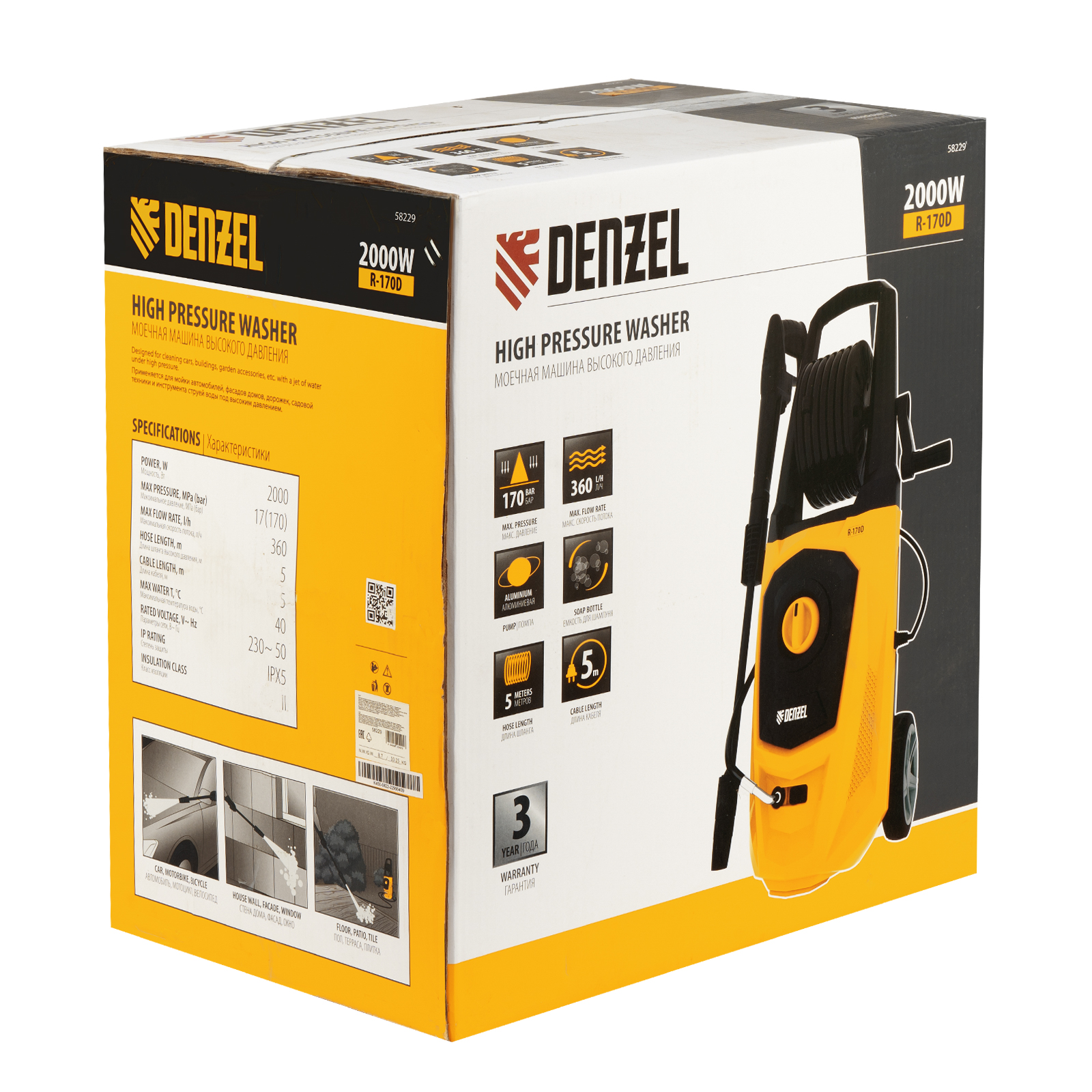 Моечная машина высокого давления R-170, 2000 Вт, 170 бар, 360 л/ч, колесная Denzel
