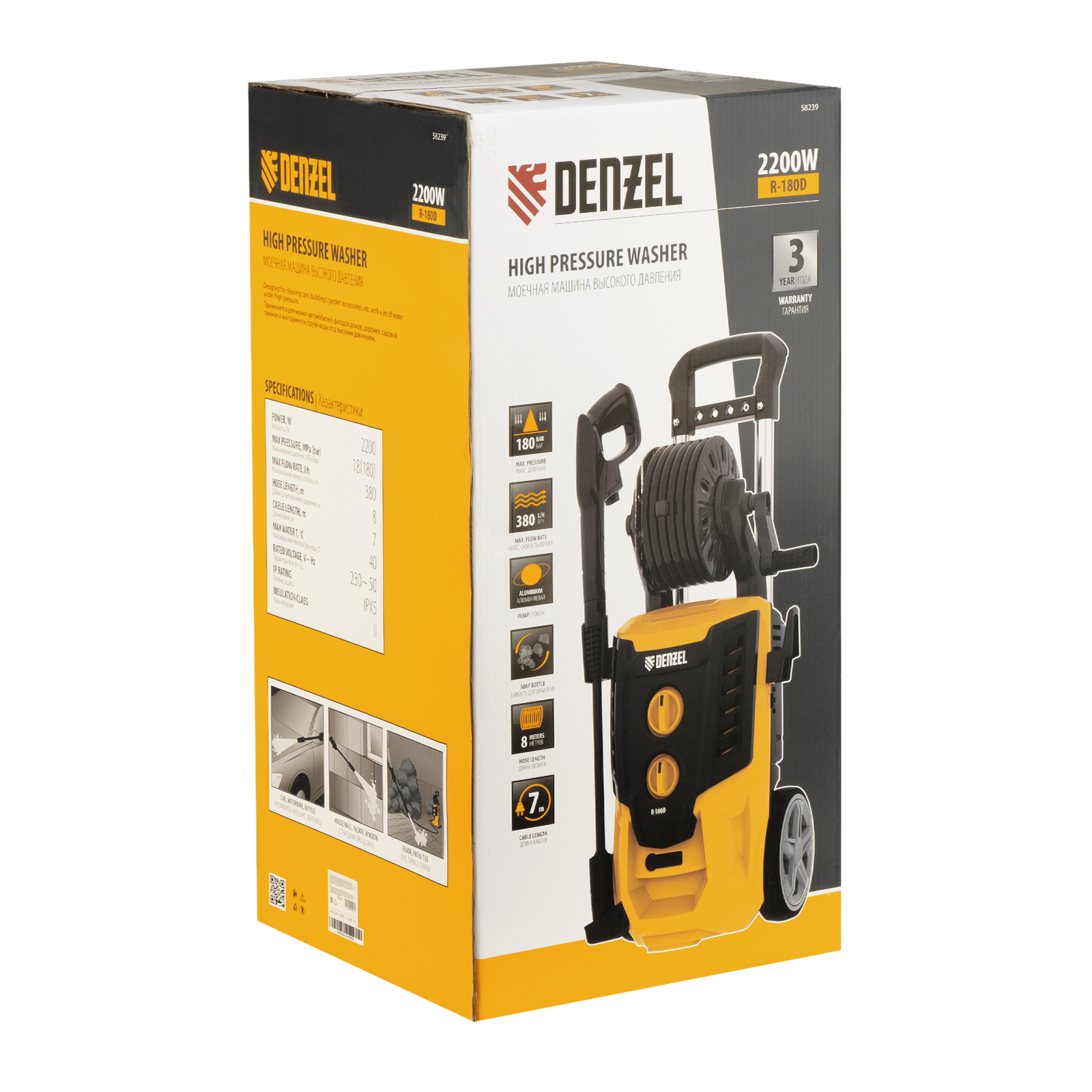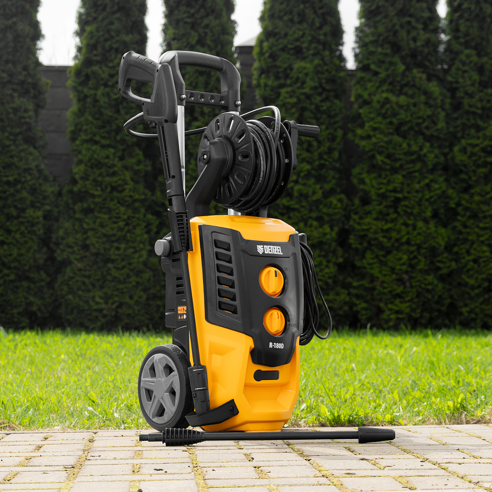 Моечная машина высокого давления Denzel R-180D 58239 с барабаном, мощностью 2200 Вт и производительностью 380 л/ч подает струю воды под давлением 180 бар и используется для очищения поверхностей. Позволяет быстро привести в порядок садовые дорожки, удалить пыль и грязь с фасада здания, автомобиля, велосипеда или мотоцикла, отмыть садовый инвентарь. Моечная машина подключается к водопроводу, а при его отсутствии может забирать воду из любого резервуара, работая в режиме самовсасывания. Устройство пригодится для поддержания порядка на загородном участке.