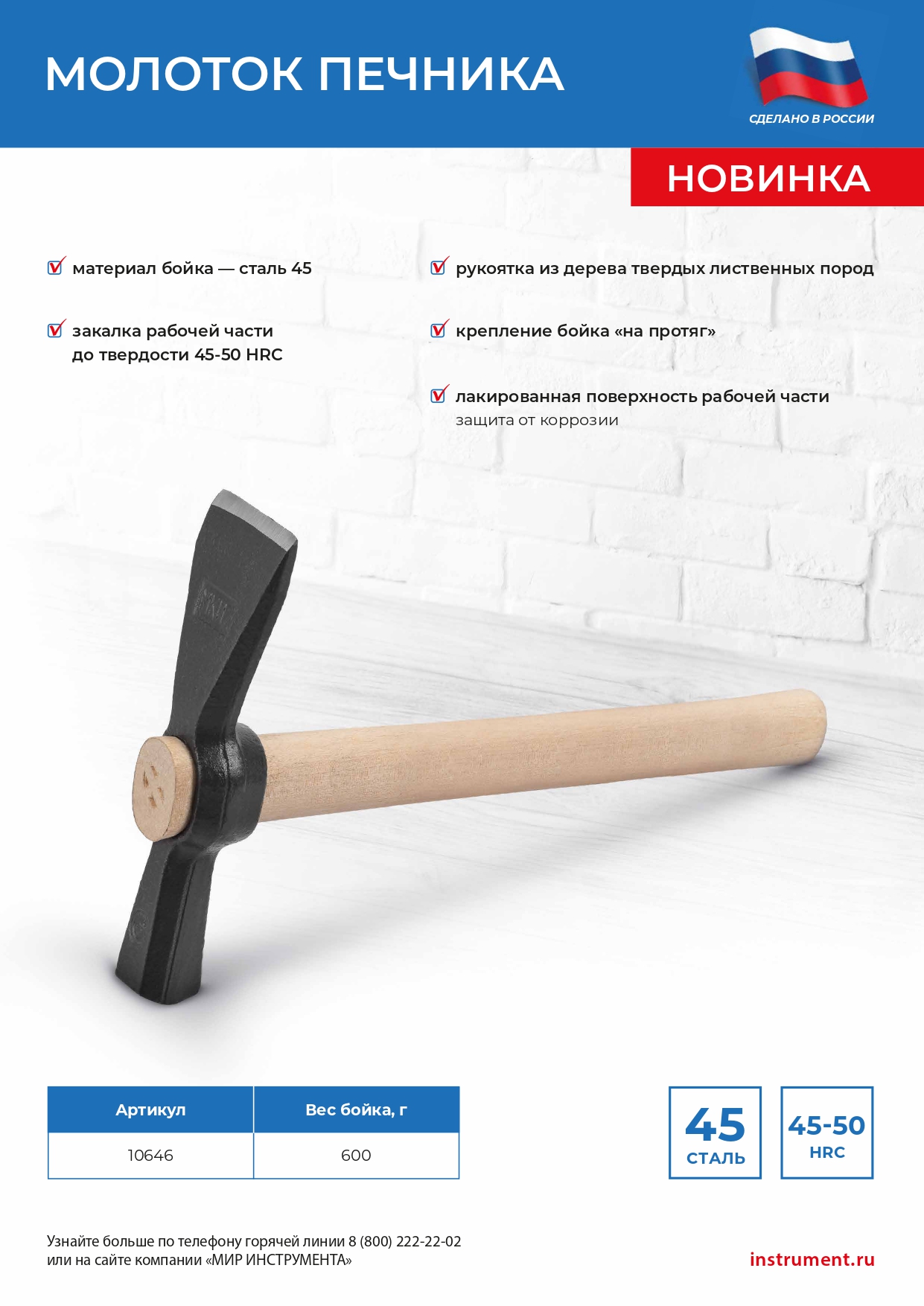 • Надежность — рукоятка изготовлена из древесины твердых пород и покрыта бесцветным лаком.