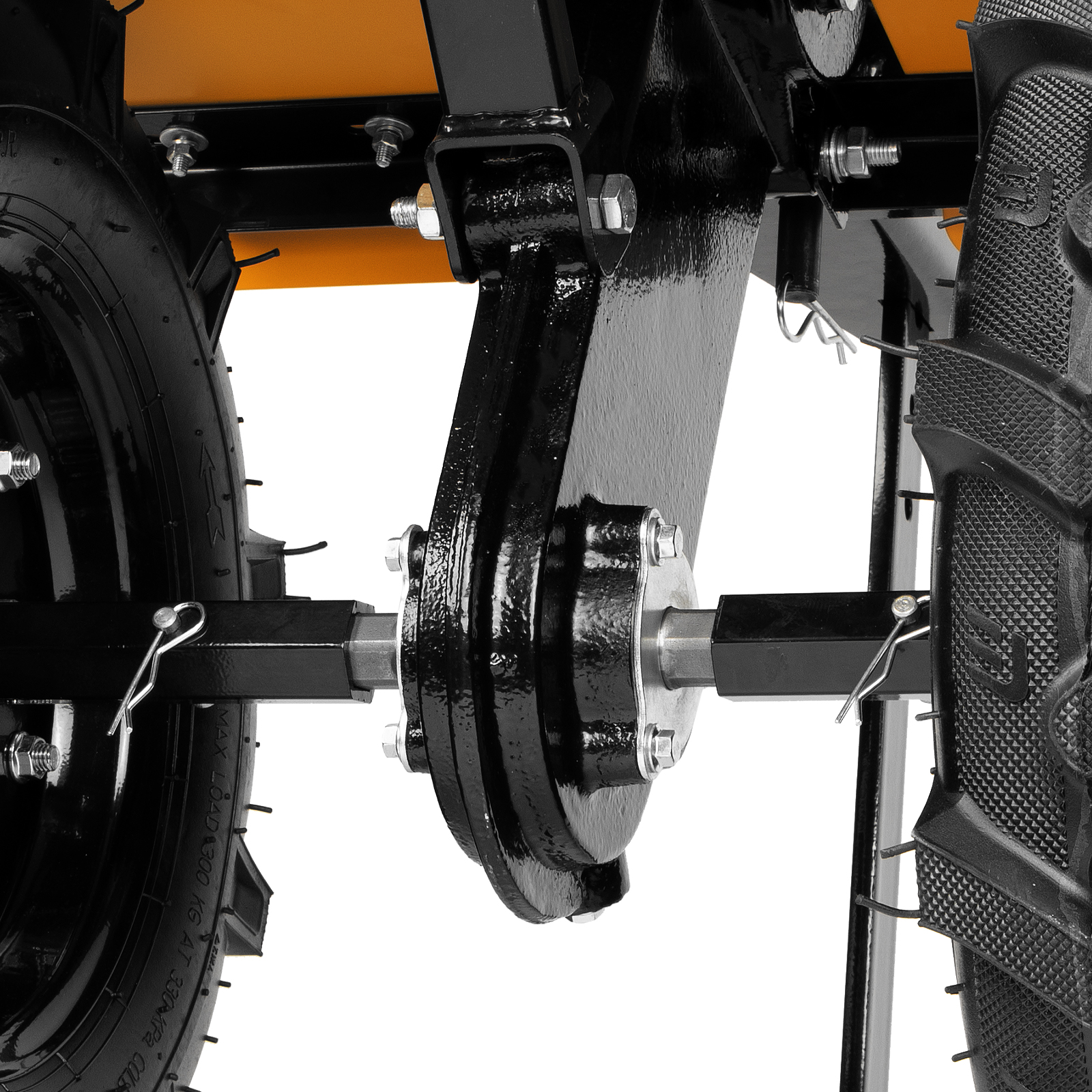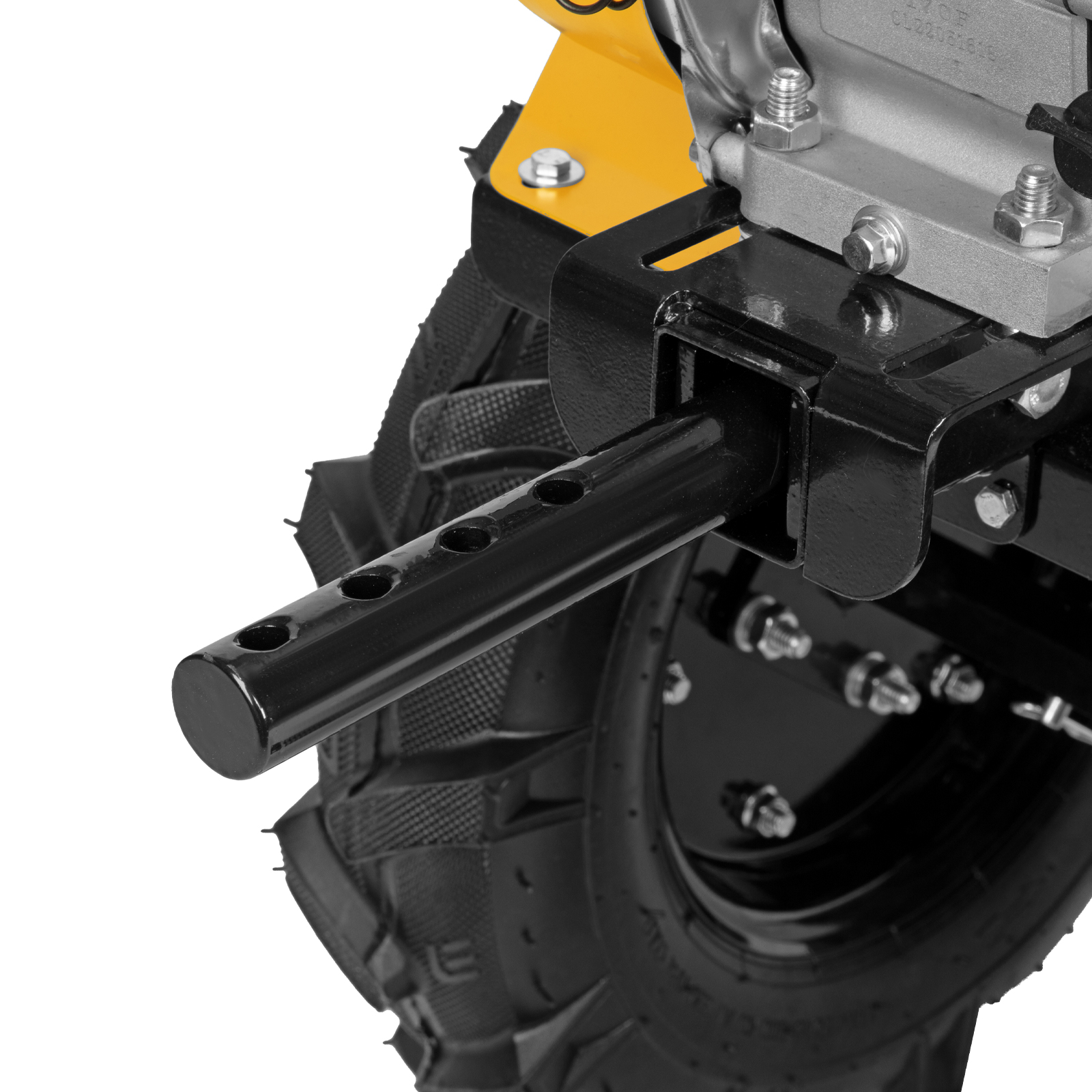 - Свобода движений — большие пневматические колеса входят помогают перевозить мотоблок в нужное место даже по неровной земле и не боятся повреждений.