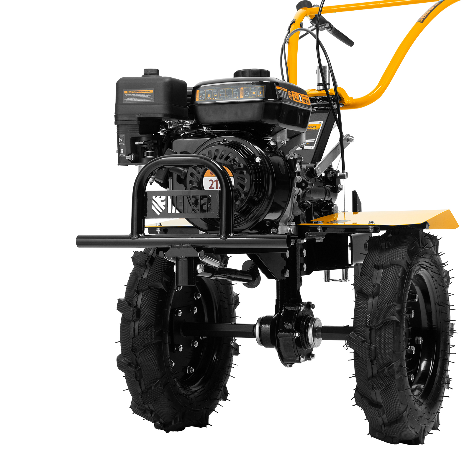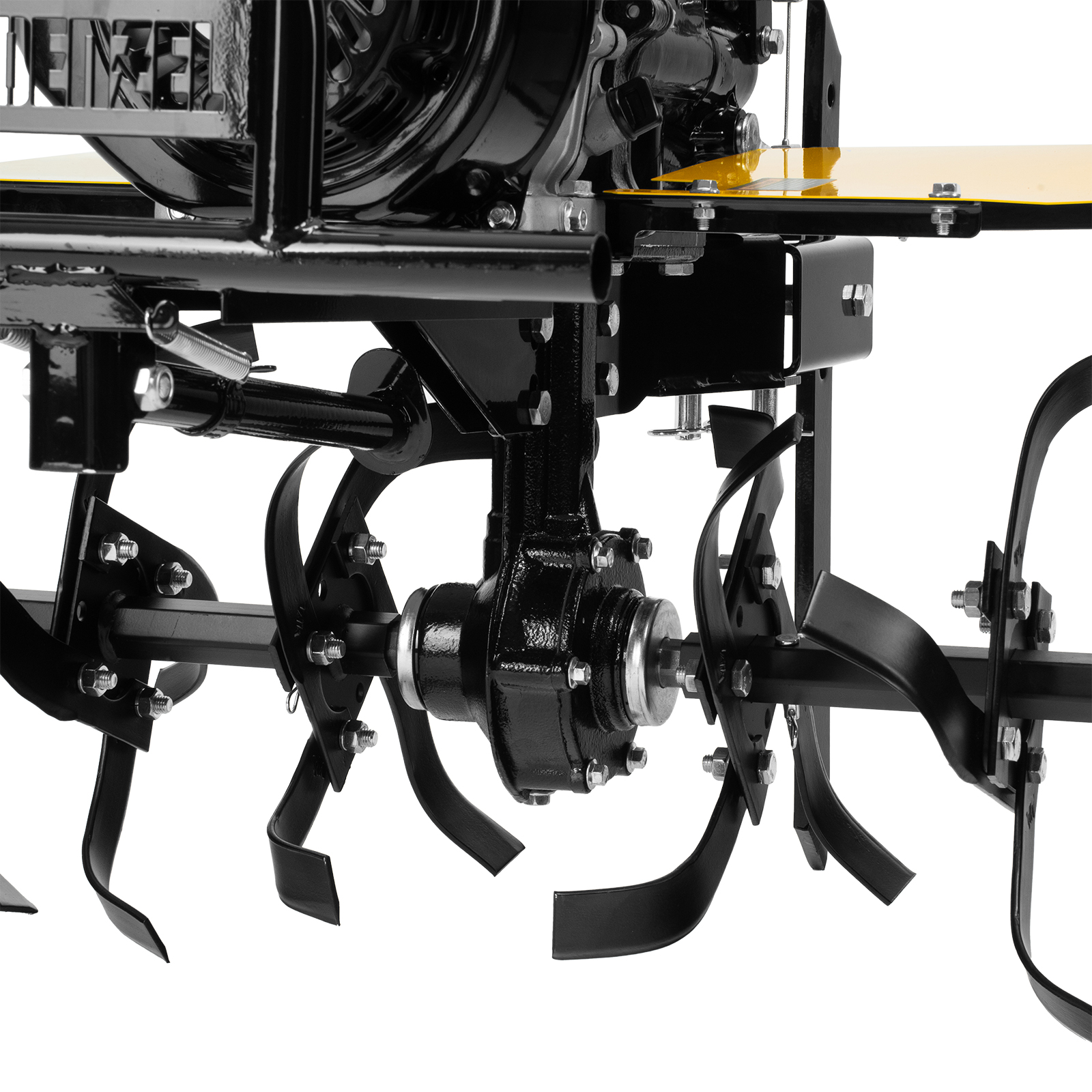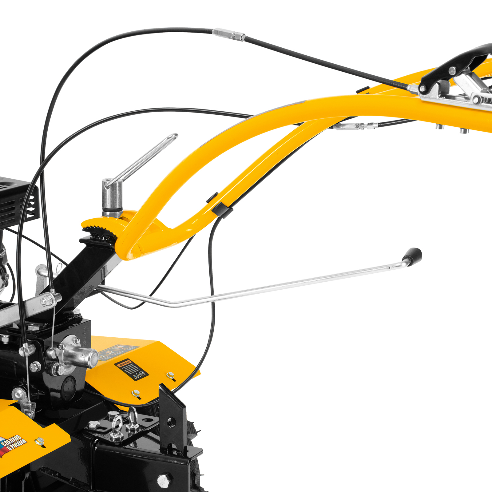 - Комфортное управление — регулятор оборотов двигателя и кнопка пуска выведены на рукоятку перед оператором, поэтому можно оперативно менять режим вспашки, не наклоняясь.