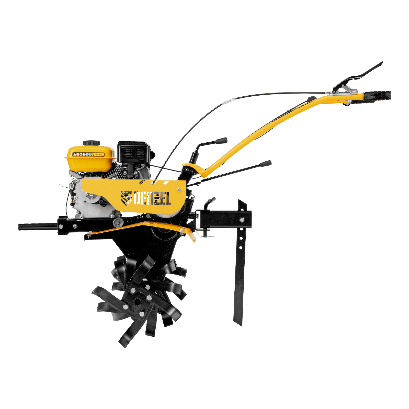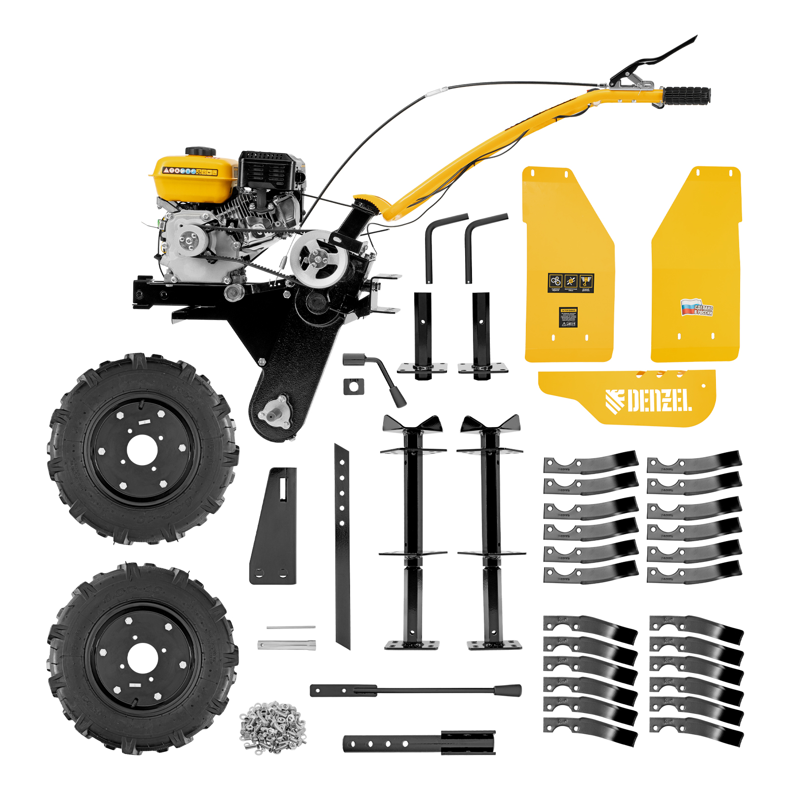 Мотоблок Denzel DPT-370S 56443 мощностью 7 л. с., с 24 фрезами (3 х 4 с каждой стороны), шкивом отбора мощности (ШОМ), количеством передач 3 вперед/1 назад, предназначен для рыхления, боронования, выравнивания почвы, прополки и выполнения других сельскохозяйственных работ на огородных и садовых участках при температуре от -15 до +40 ℃. Максимальная ширина обработки достигает 1000 мм, максимальная глубина — 350 мм.