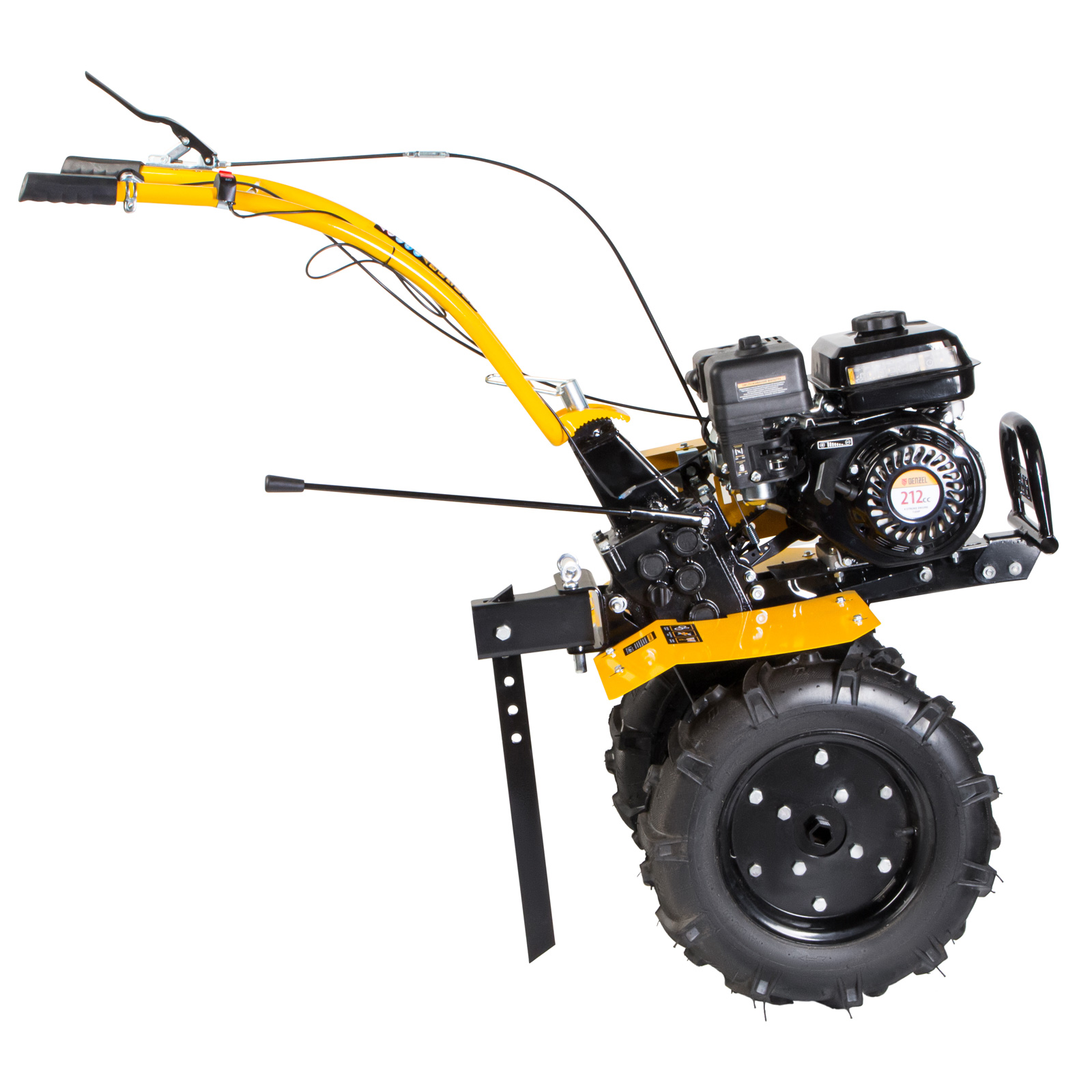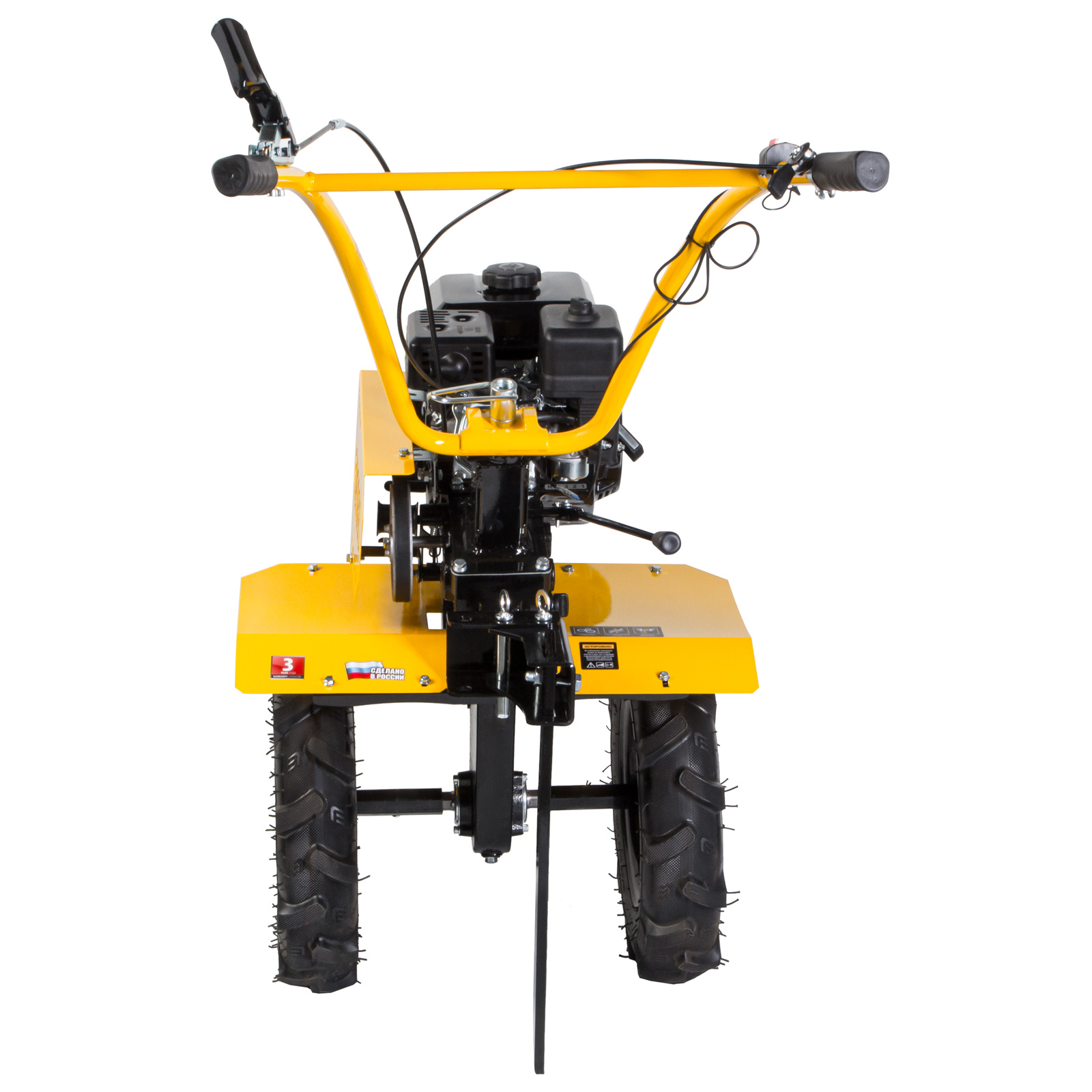 - Комфортная транспортировка — усиленная рукоятка-бампер и большие колеса с глубоким протектором позволяют с легкостью перемещать мотоблок до нужного места.