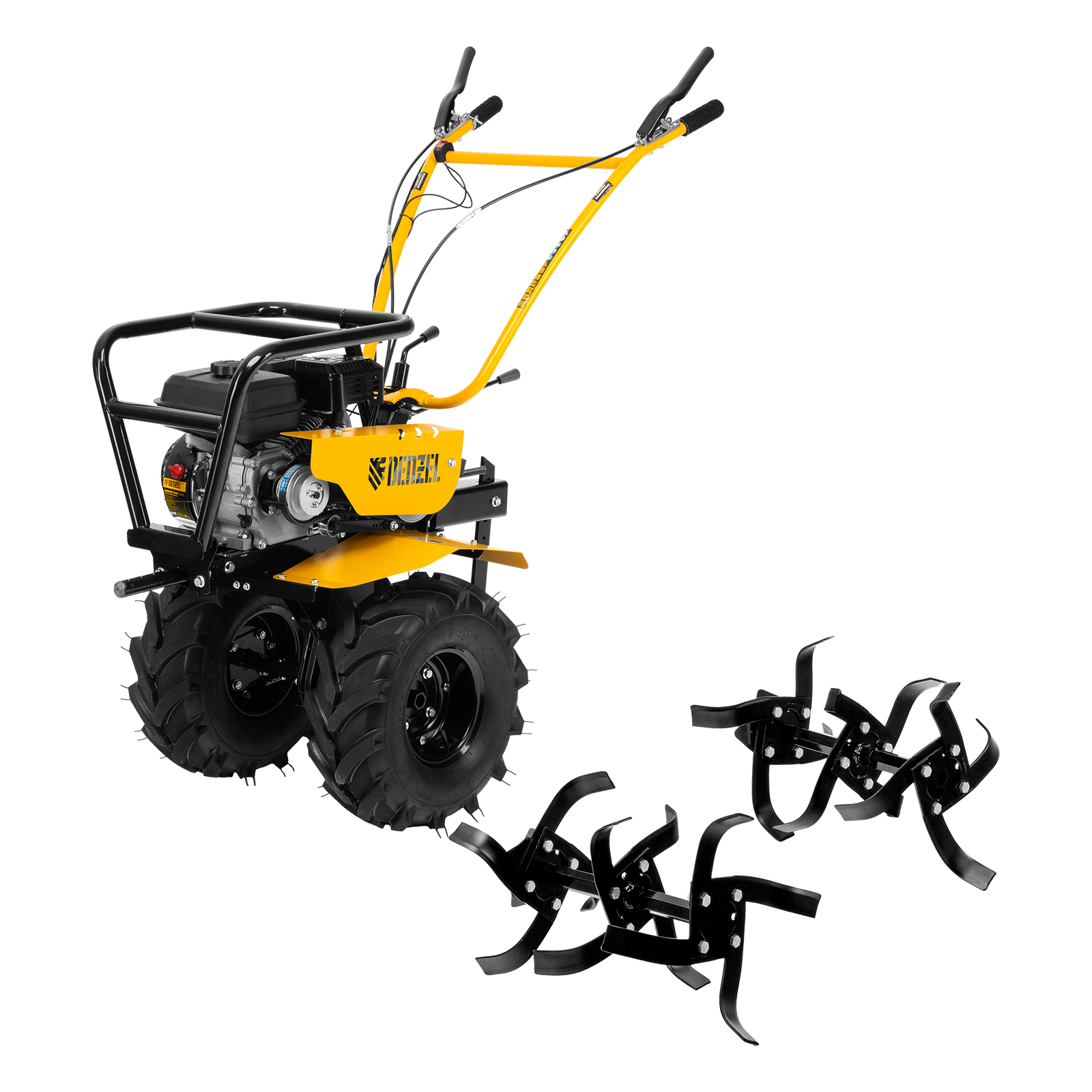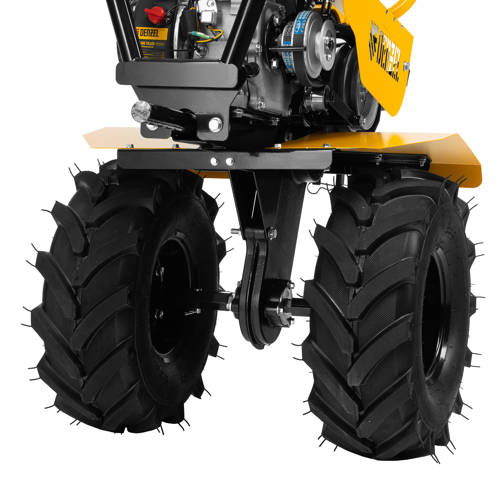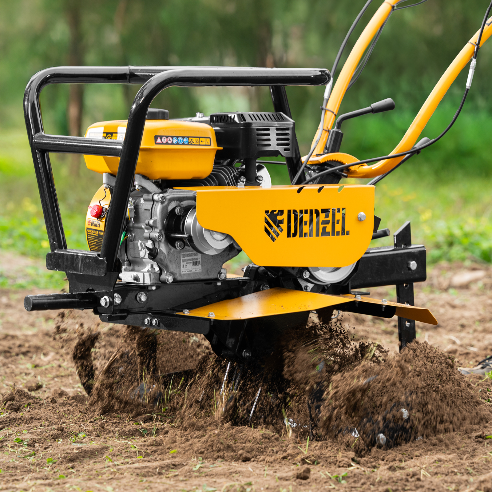Мотоблок Denzel DPT-670S-PRO 56446 с ременным сцеплением, двигателем объемом 212 см3 и мощностью 7 л.с., с коробкой передач 6 вперед/2 назад и шкивом отбора мощности, комплектуется 24 фрезами (3х4). Предназначен для выполнения земляных работ: прополки, вспахивания, боронования грунта, перевозки грузов и т.д.