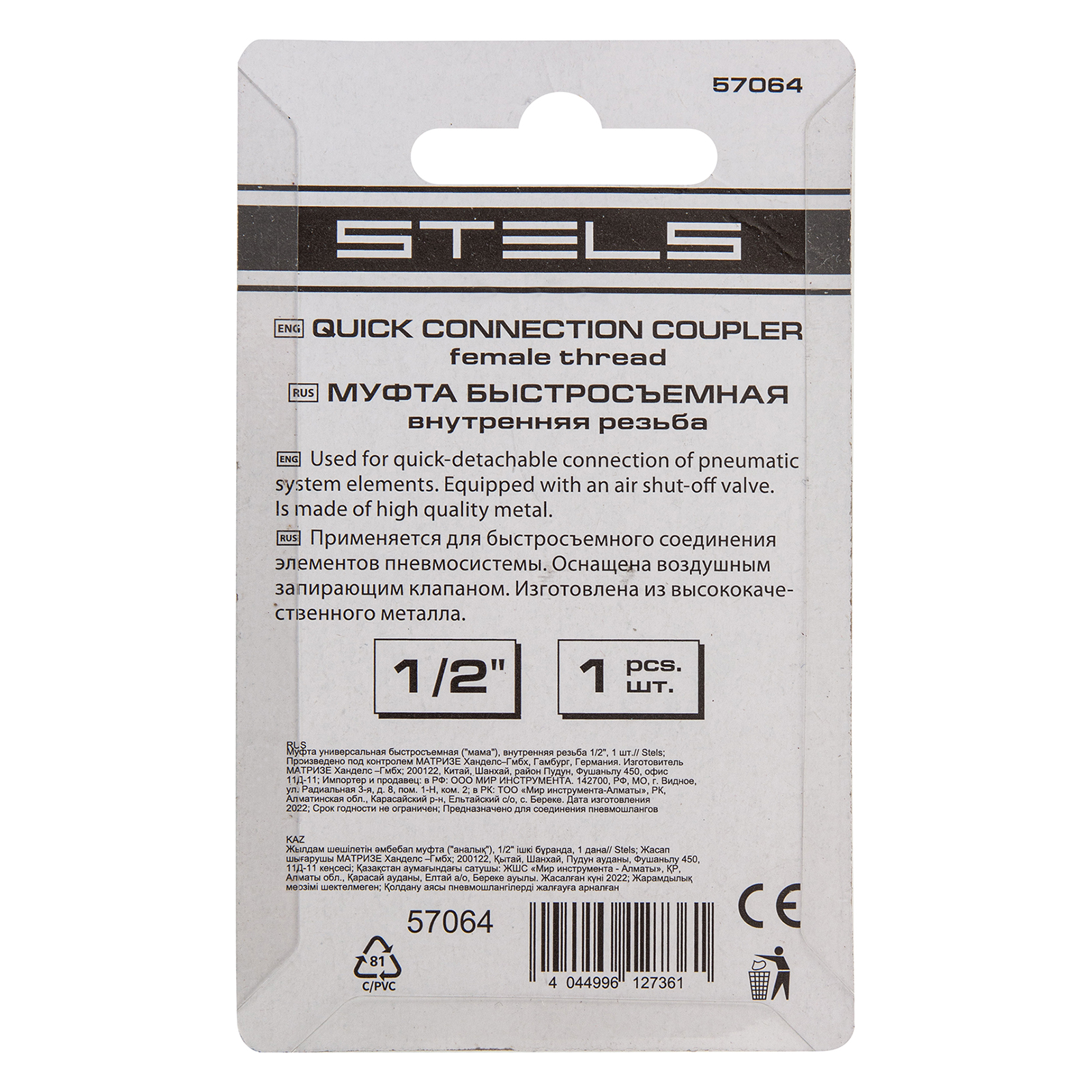 Универсальная муфта Stels 57064 с внутренней резьбой 1/2 дюйма, 1 шт. в упаковке, рассчитана на присоединение шланга пневмоинструмента к компрессору с быстросъемным рапидом «мама». Пригодится во время строительства, ремонта, также будет полезна в автосервисе и гараже.