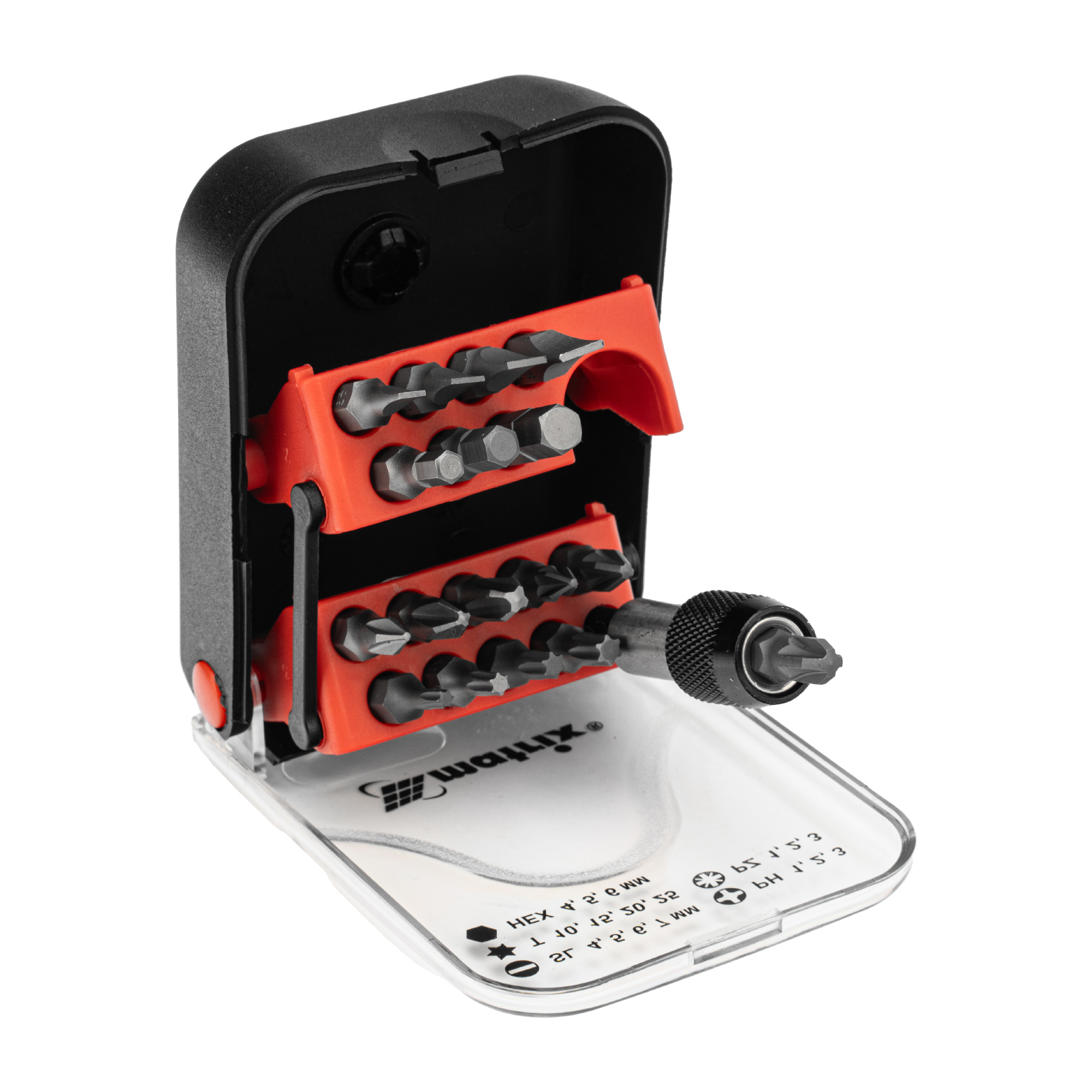 Пластиковый кейс - 1 штБиты: PH1, PH2, PH3, PZ1, PZ2, PZ3, SL4, SL5, SL6, SL7, T10, T15, T20, T25, H4, H5, H6 - 17 штБитодержатель с быстрозажимным механизмом - 1 штДержатель бит - 1 шт |