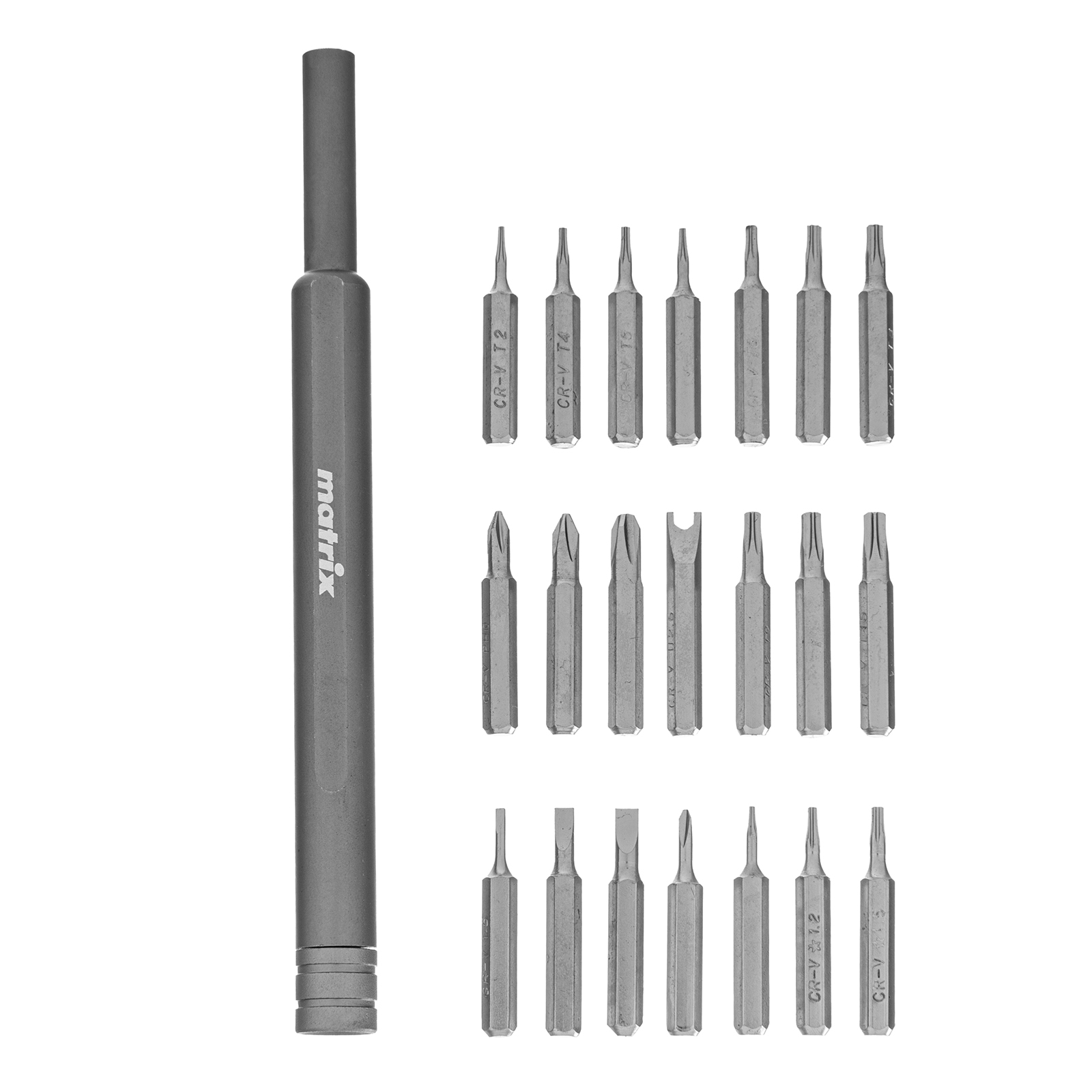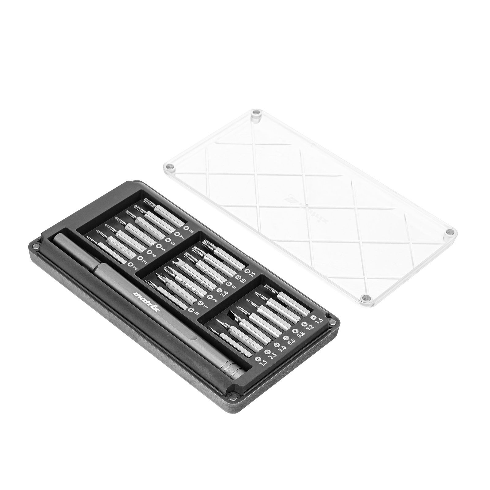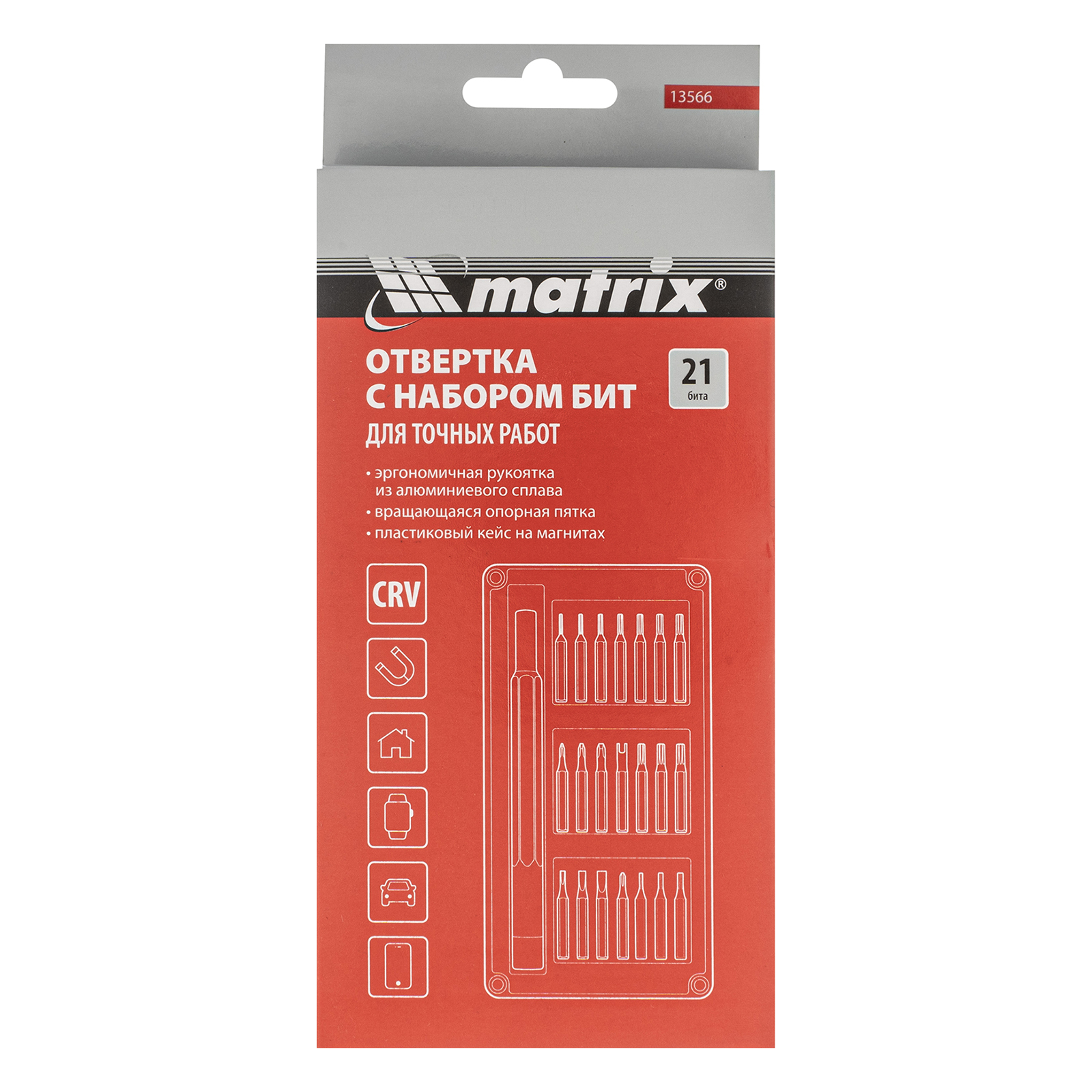 Универсальный набор для точных работ Matrix 13566 22 в 1 содержит 21 биту под шлицы PH, SL,T, H, Str, Y и U, а также отвертку-держатель. Вращающийся затыльник позволяет поворачивать отвертку перебором пальцев, что упрощает работу с мелким крепежом. При помощи входящих в набор инструментов можно отремонтировать очки, игрушки, портативную и бытовую технику и т.д.