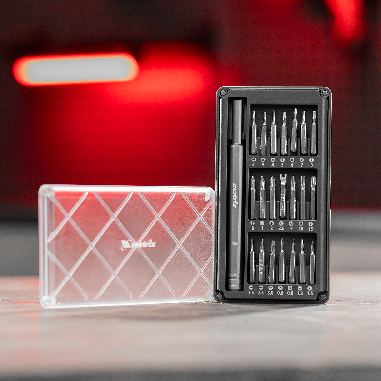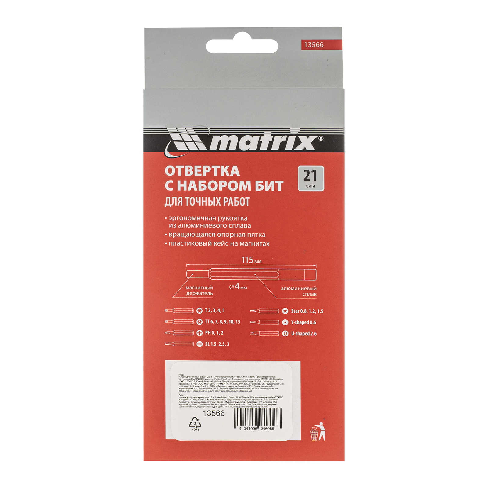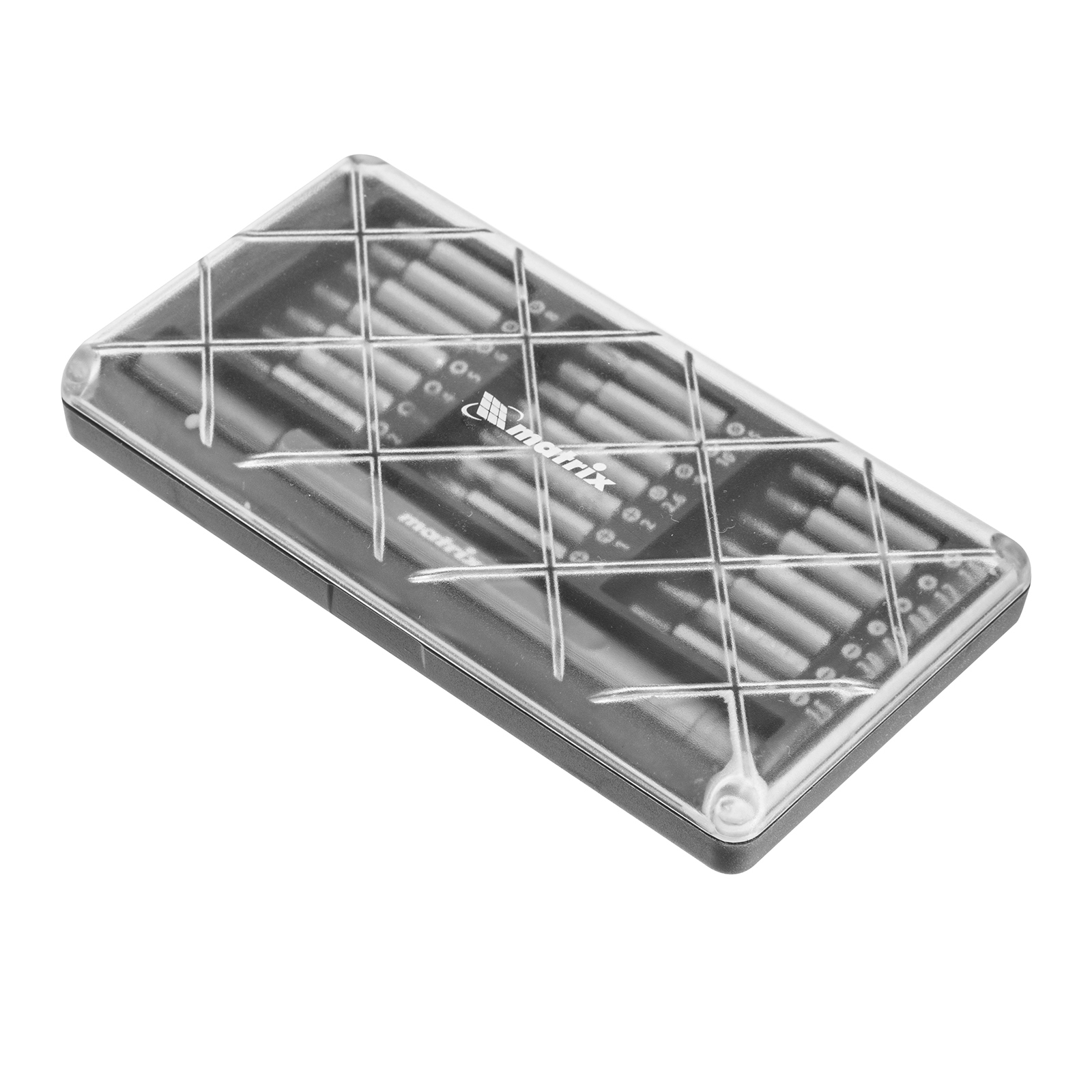 Универсальный набор для точных работ Matrix 13566 22 в 1 содержит 21 биту под шлицы PH, SL,T, H, Str, Y и U, а также отвертку-держатель. Вращающийся затыльник позволяет поворачивать отвертку перебором пальцев, что упрощает работу с мелким крепежом. При помощи входящих в набор инструментов можно отремонтировать очки, игрушки, портативную и бытовую технику и т.д.