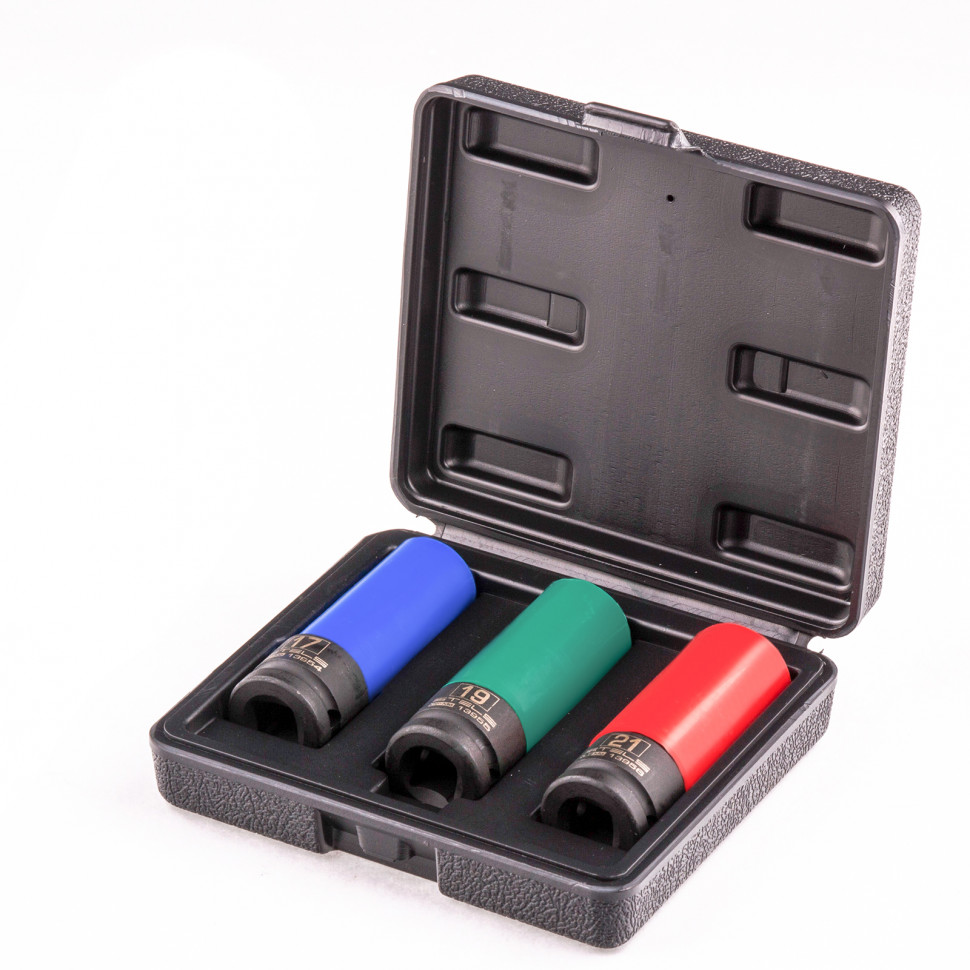 Головка ударная удлиненная для колесных дисков, 17 мм - 1 штГоловка ударная удлиненная для колесных дисков, 19 мм - 1 штГоловка ударная удлиненная для колесных дисков, 21 мм - 1 штПластиковый кейс - 1 шт |