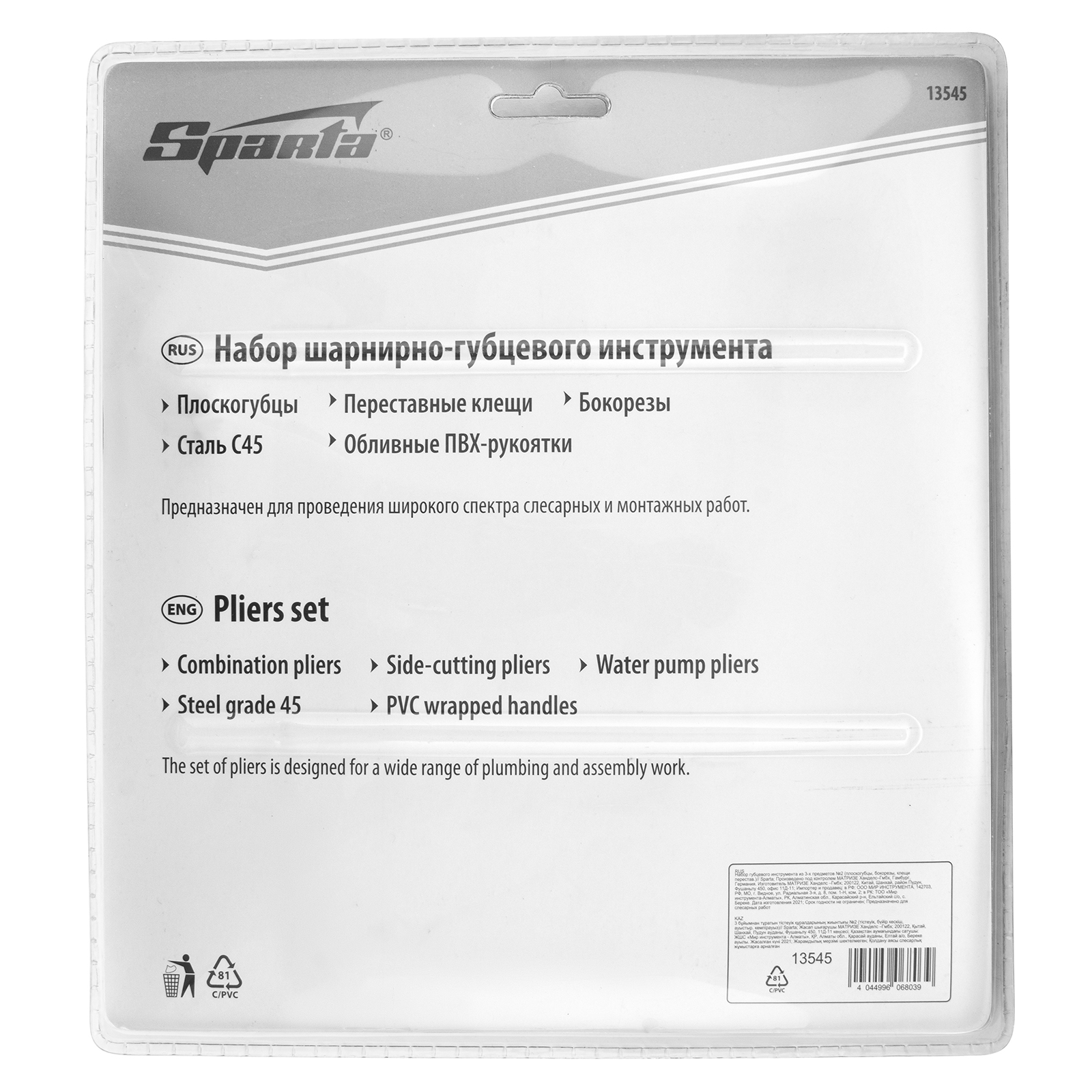 Набор губцевого инструмента №2 Sparta 13545 включает 3 предмета — бокорезы, переставные клещи и плоскогубцы. Их используют для перекусывания проводов и проволоки, а также для зажима и удержания заготовок с целью их соединения или обработки. Переставные клещи позволяют удерживать детали разных форм и размеров, поскольку величина раствора губок у них регулируется. Набор будет полезен для проведения слесарных, монтажных, сантехнических работ, а также пригодится во время ремонта электроники или бытовой техники.