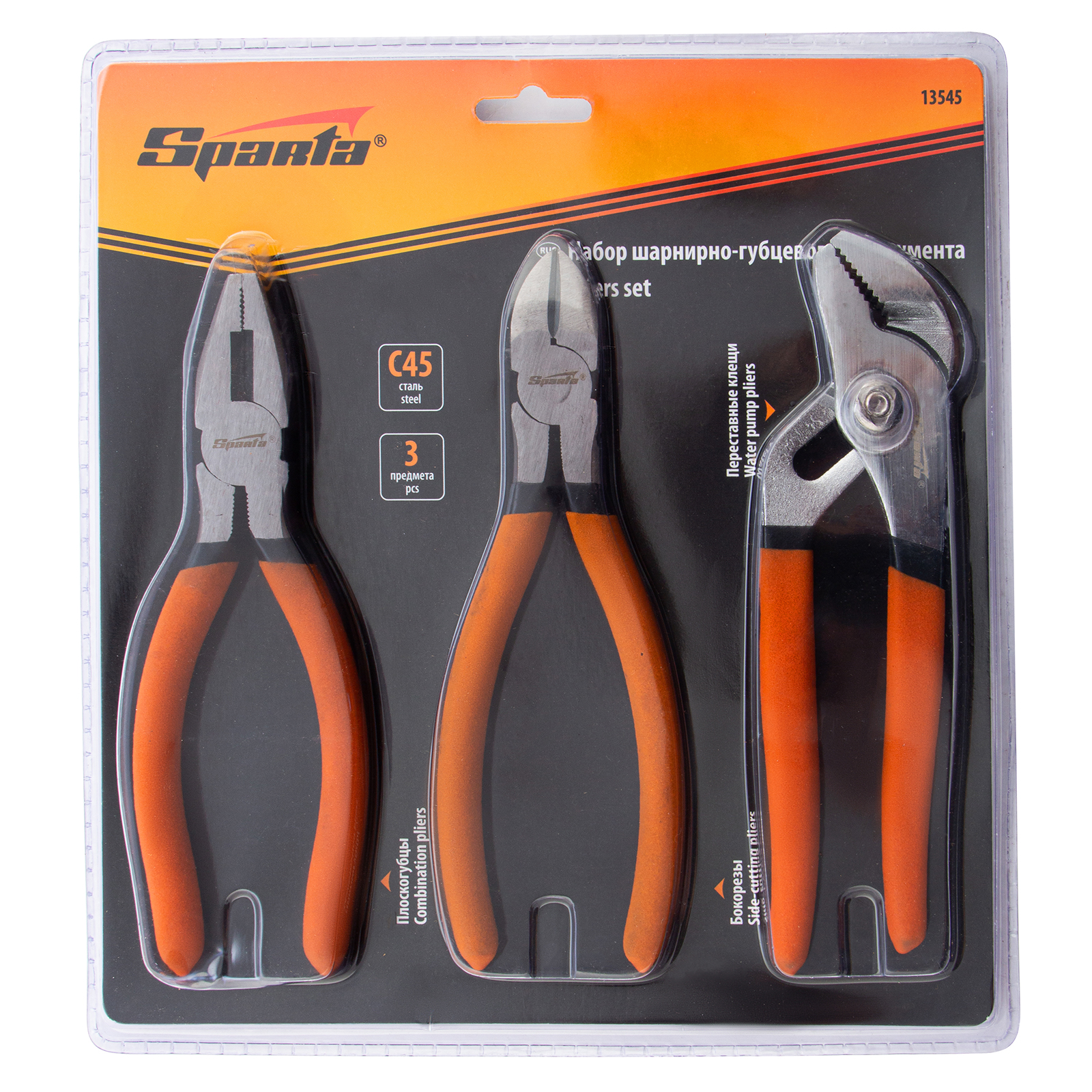 Набор губцевого инструмента №2, 3 предмета: плоскогубцы, бокорезы, клещи переставные Sparta