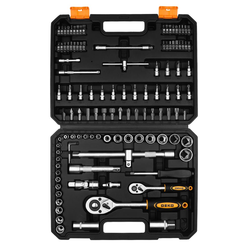 Набор инструментов для авто в кейсе DEKO DKMT112 предназначен для обслуживания автомобилей, а также подойдет для проведения ремонта бытовых конструкций, садовой техники дома и на даче. Все инструменты набора выполнены из стали, что обеспечивает их долгий срок службы.В комплект набора входит:Торцевые головки 1/4": 4, 4.5, 5, 5.5, 6, 7, 8, 9, 10 ,11, 12, 13, 14 мм; Е4, Е5, Е6, Е7, Е8 - 18 штТорцевые головки 1/2": 14, 15, 16, 17, 18, 19, 21, 24 мм - 8 штОтвертка-держатель - 1 штШестигранные ключи: 1.5, 2, 2.5 мм - 3 штУдлинители: 1/4"х2", 1/4"х4", 1/2"х5" - 3 штТ-образный вороток 1/4" - 1 штГибкий удлинитель 1/4" - 1 штУдлинитель с адаптером для головок 1/2" - 1 штБиты 6.35 мм: TT: 10, 20; PZ: 0, 1, 2, 3; PH: 0, 1, 2, 3; SL: 3, 4, 5, 5.5, 6, 6.5, 7, 8; H:2, 2.5, 3, 4, 5, 5.5, 6, 7, 8; T:8, 9, 10, 15, 20, 25, 27, 30, 40; AD - 36 штБиты 8 мм: T: 40, 45, 50, 55; H:8, 10, 12, 14; SL:8, 10, 12; PH: 3, 4; PZ:3, 4 - 16 штКарданный шарнир: 1/4", 1/2" - 2 штБиты-головки: PH:1, 2; PZ: 1, 2; H: 3, 4, 5, 6; SL: 4, 5.5, 7; T:8, 10, 15, 20, 25, 30 - 17 штТрещотки: 1/4", 1/2" - 2 штСвечные головки: 1/2"х16, 21 мм - 2 штДержатели для бит: 1/4", 1/2" - 2 штРуководство по эксплуатации - 1 шт