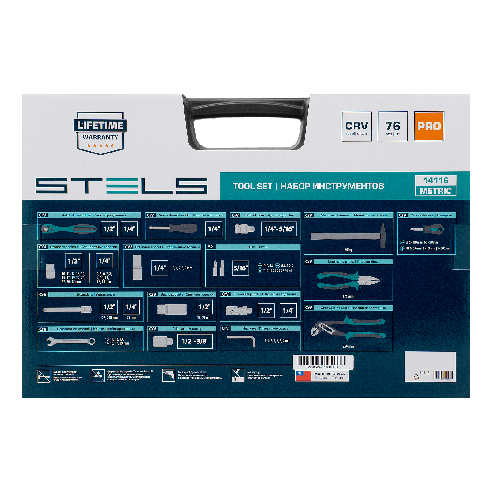 Набор инструментов, 1/2", 1/4", CrV, 12 гранные головки, пластиковый кейс, 76 предметов Stels