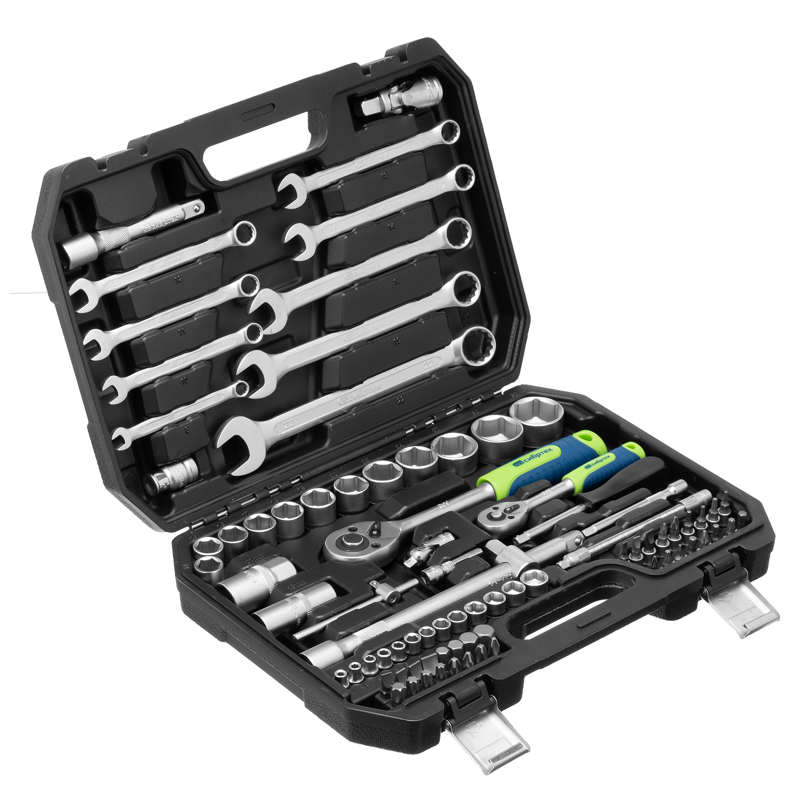 Набор инструментов Сибртех 13391 упакован в пластиковый кейс и состоит из 82 предметов с присоединительным размером 1/2" и 1/4", предназначенных для слесарных работ, преимущественно монтажа и демонтажа резьбового крепежа с разными типами шлицев. В комплект поставки входят карданы, удлинители и переходники, облегчающие работу в труднодоступных местах. Набор используется для ремонта автомобилей, а также полезен в быту.