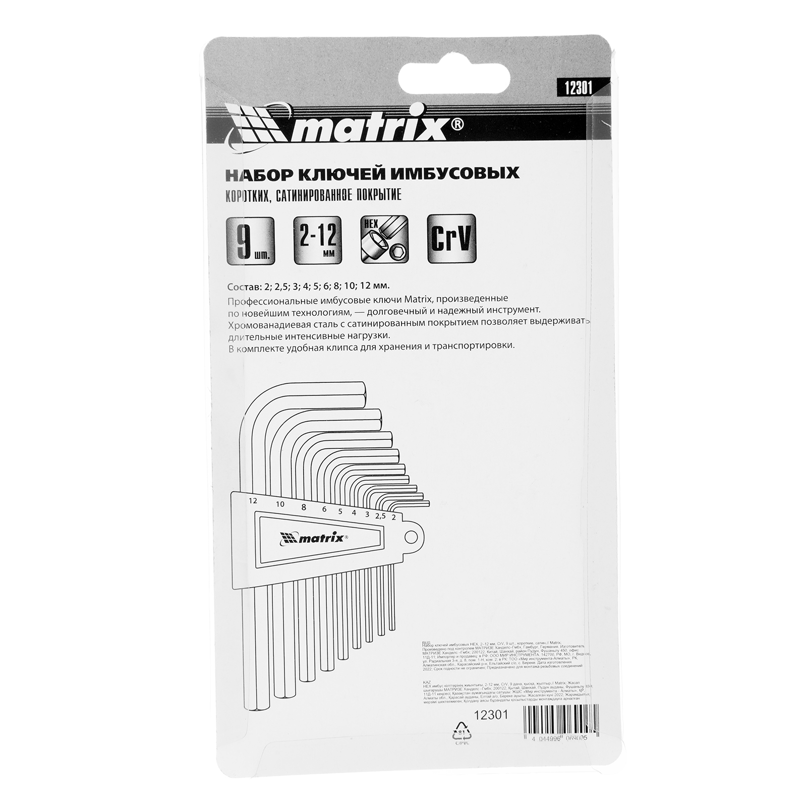 Набор ключей имбусовых HEX, 2-12 мм, CrV, 9 шт, короткие с сатинированным покрытием Matrix в Санкт-Петербурге