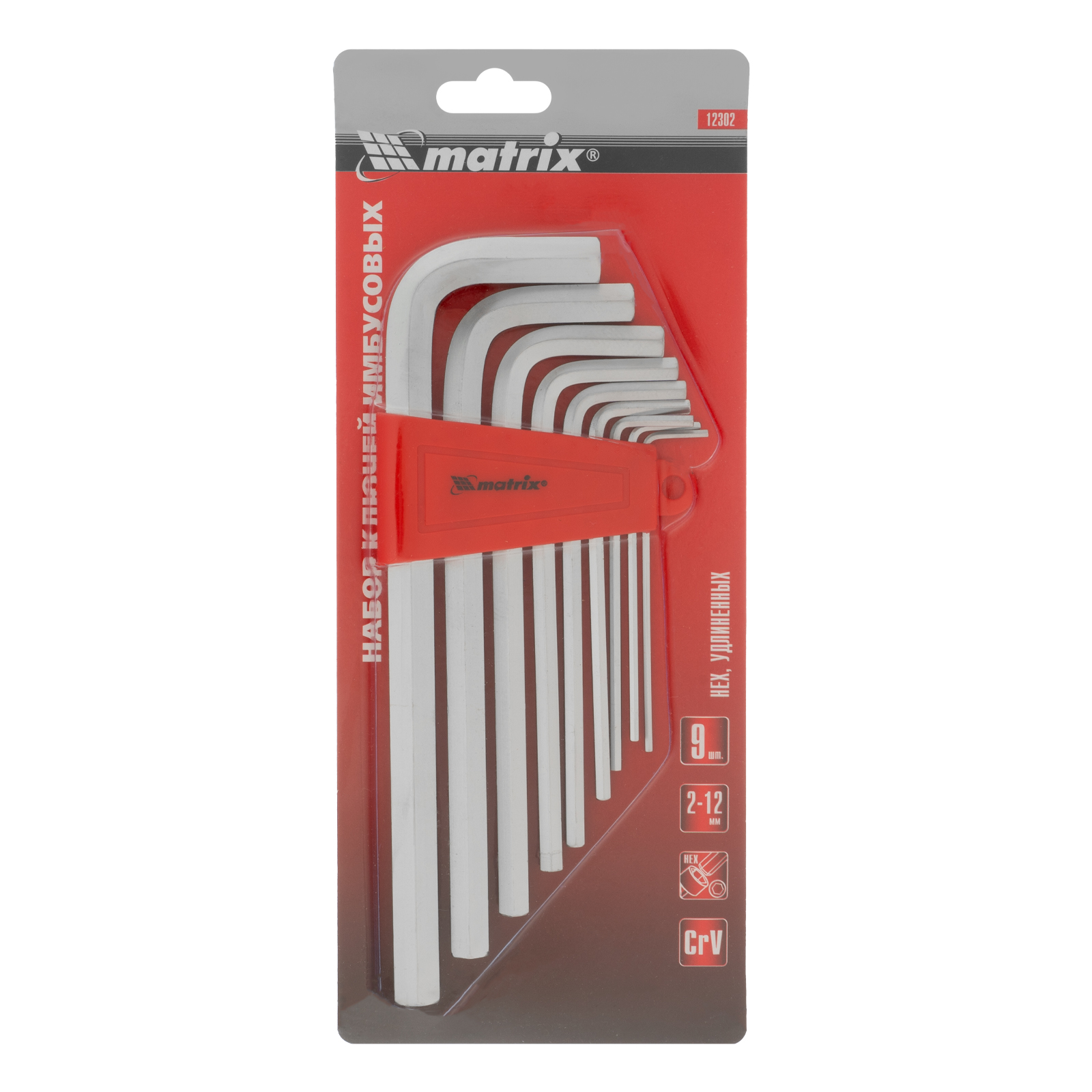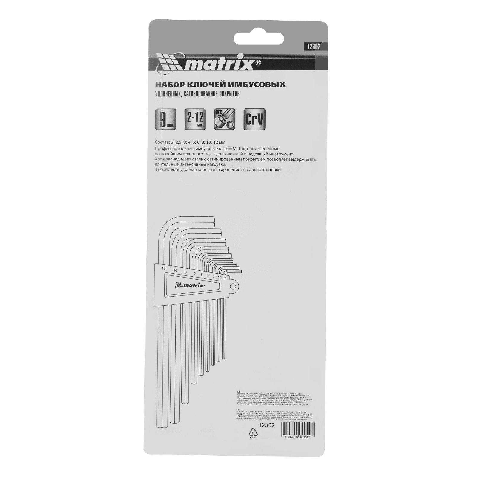 Набор удлиненных имбусовых ключей HEX Matrix 12302, 2-12 мм, сатинированный, 9 шт. из стали CrV, пригодится как начинающему мастеру, так и профессионалу. Ключи применяются при работе с крепежом, имеющим внутренний шестигранник. С их помощью можно собрать мебель или решить мелкие бытовые задачи. Удлиненные ключи удобны для работы в труднодоступных местах.