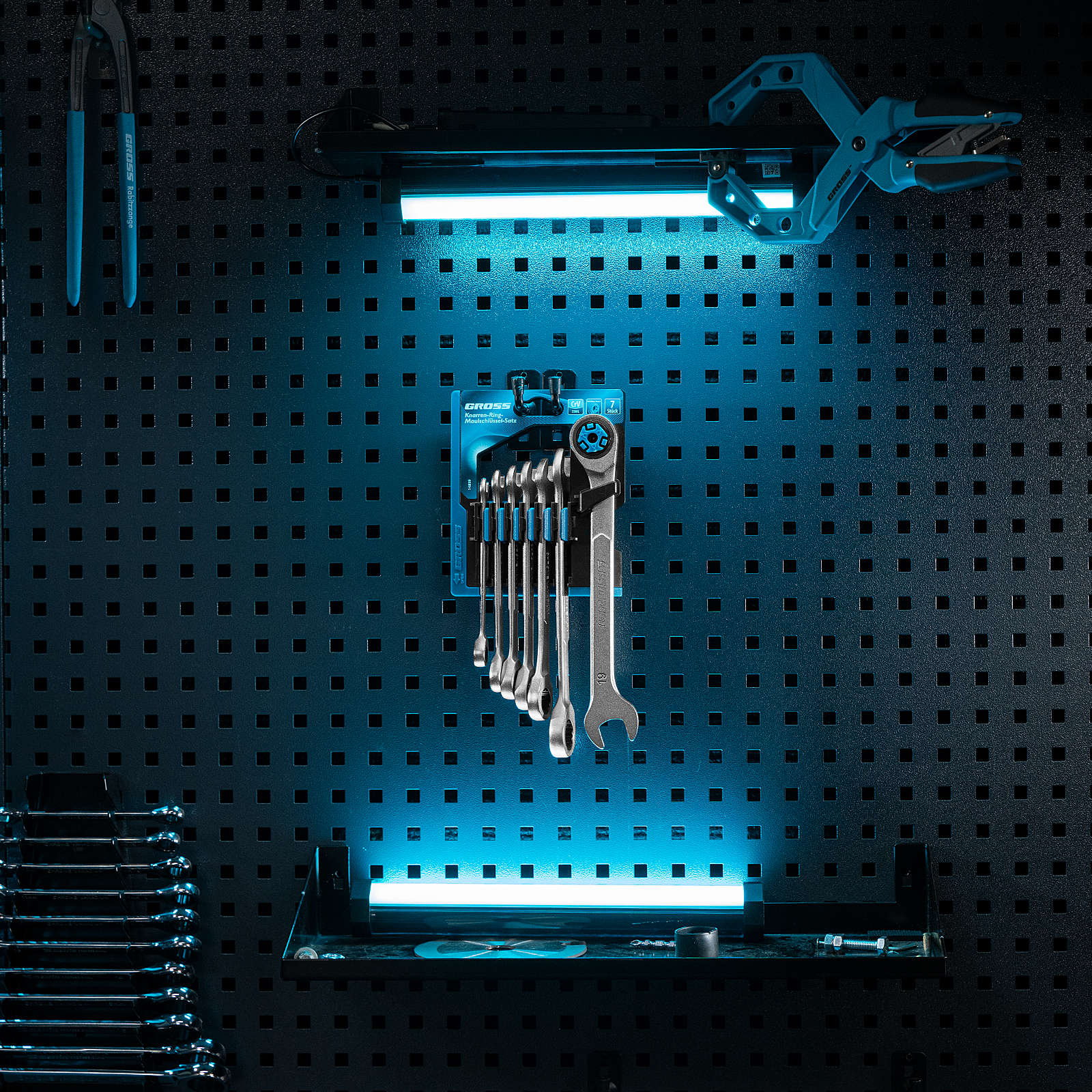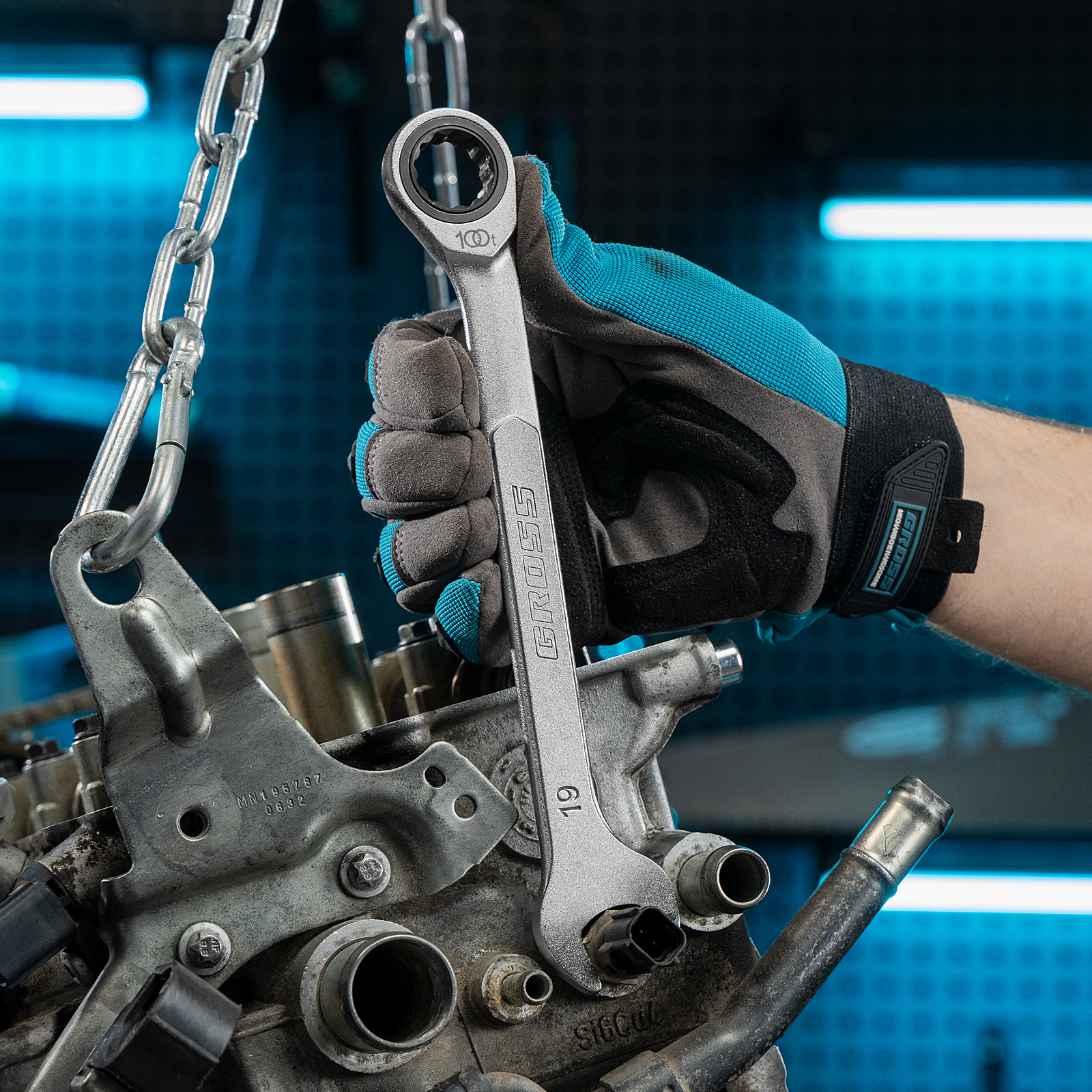 Набор комбинированных трещоточных ключей Gross 14859 включает в себя 7 инструментов из стали CrV и используется для монтажа и демонтажа резьбовых соединений диаметром от 8 до 19 мм. Ключи имеют как рожковую, так и накидную часть, что повышает их функциональность. У накидной части 12 внутренних граней, что увеличивает площадь соприкосновения с головкой крепежа и снижает риск ее деформации. Ключи применяются как в автосервисах, так и для самостоятельного ремонта автомобилей.