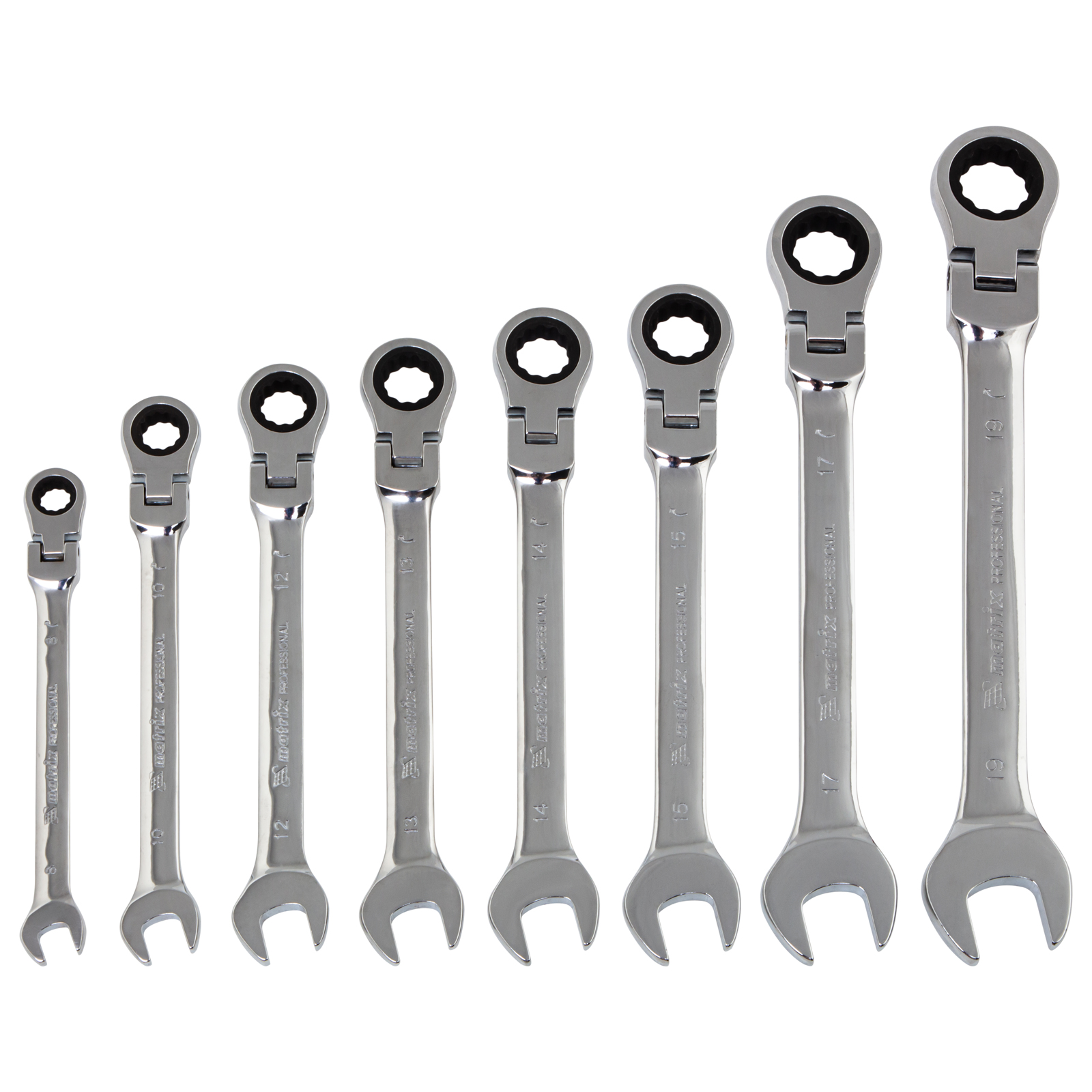 Набор ключей комбинированных трещоточных шарнирных - 8 шт, типоразмеры - 8, 10, 12, 13, 14, 15, 17, 19 |
