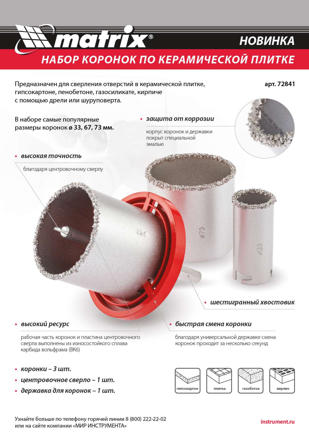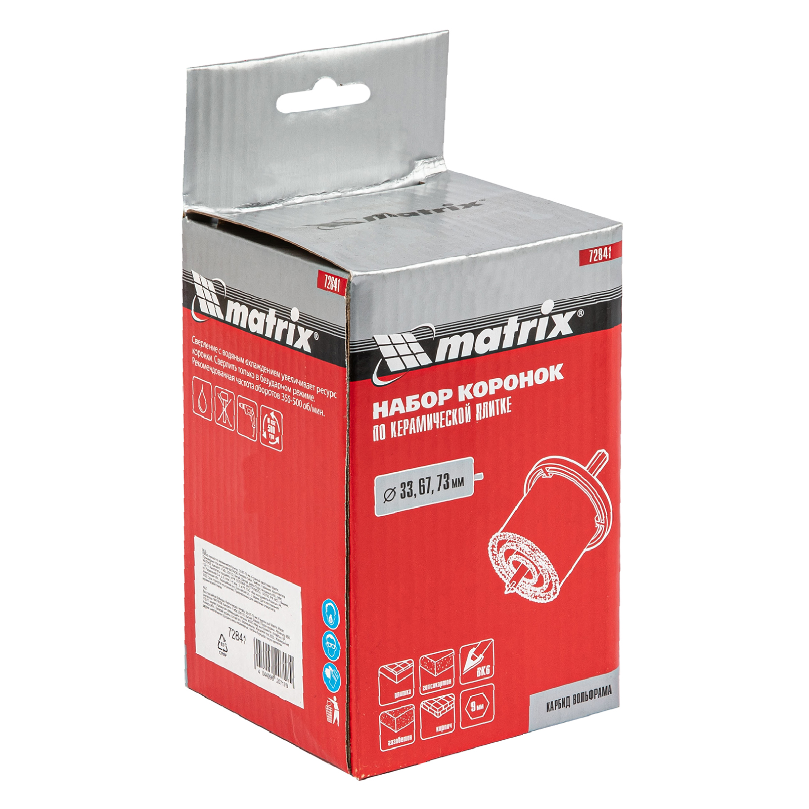 Набор коронок по керамической плитке, 33-67-73 мм, шестигранный хвостовик Matrix