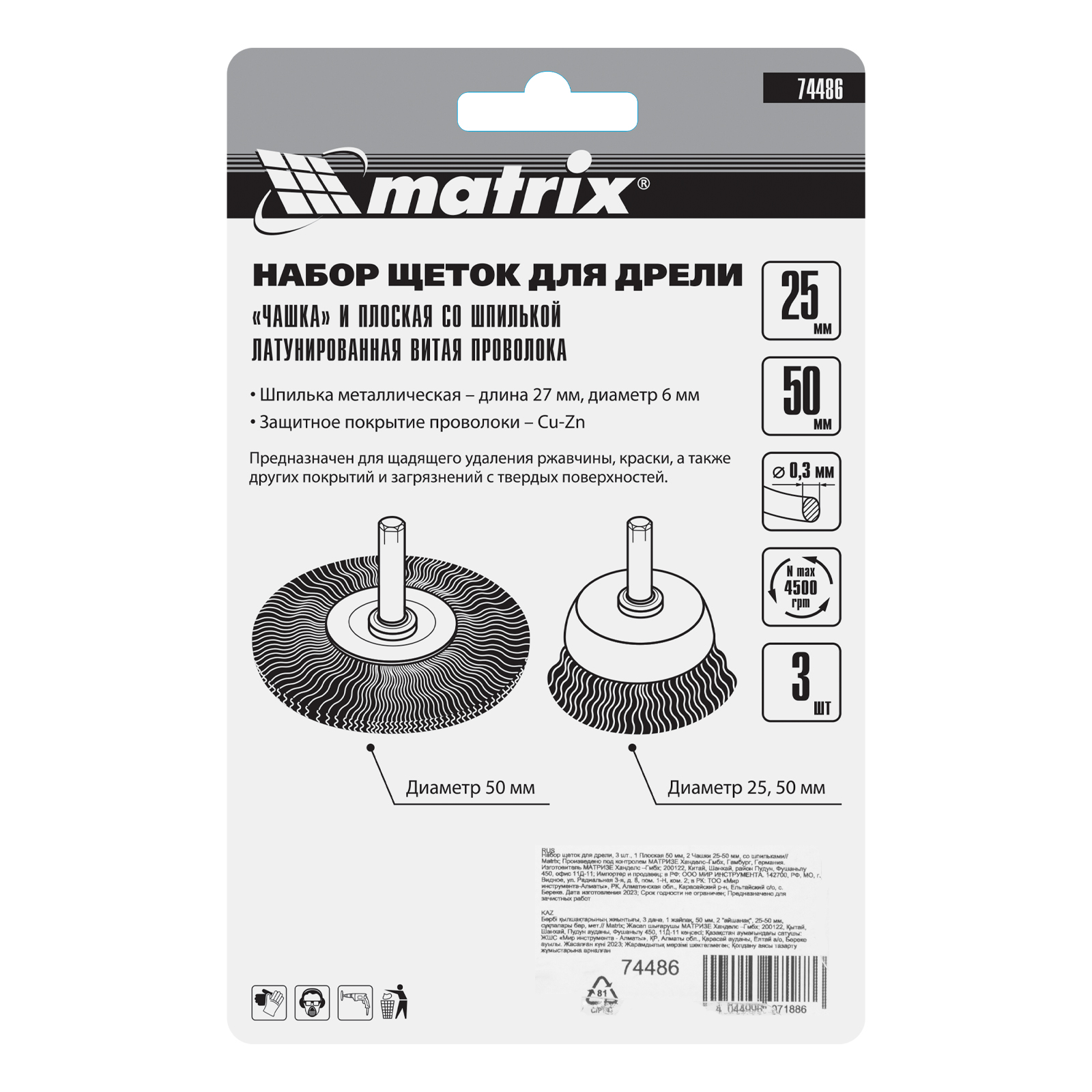Набор щеток для дрели Matrix 74486 включает 3 насадки со шпильками 6 мм: одну плоскую диаметром 50 мм и две «чашки» диаметром 25 и 50 мм. Рекомендованная скорость вращения шпинделя — до 4500 об/мин. Щетки позволяют снять с поверхностей тонкий старый слой ЛКМ, удалить загрязнения и избавиться от ржавчины. «Чашкой» удобно обрабатывать плоские поверхности, а плоская насадка используется для зачистки труднодоступных мест.