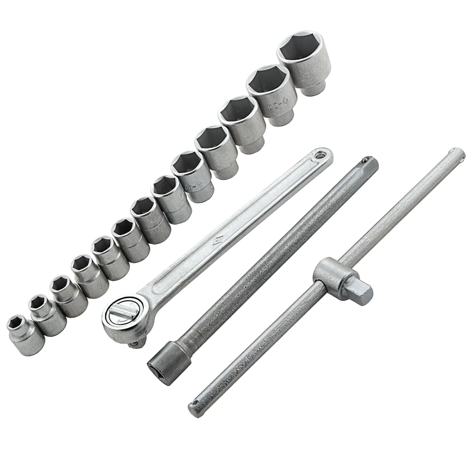 Головки 10, 11, 12, 13, 14, 15, 17, 19, 22, 24, 27, 30, 32 - 13 штКлюч трещотка - 1 штВороток Т-образный - 1 штУдлинитель - 1 штКейс - 1 штТрещотка - 1 шт |