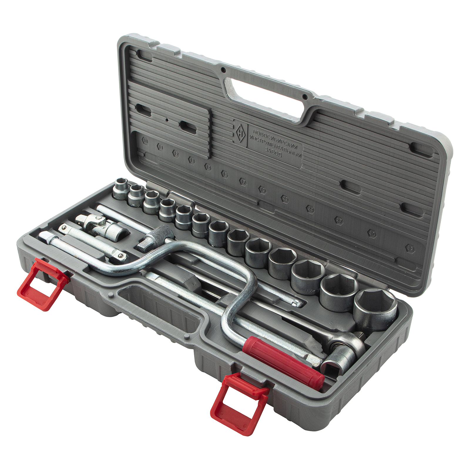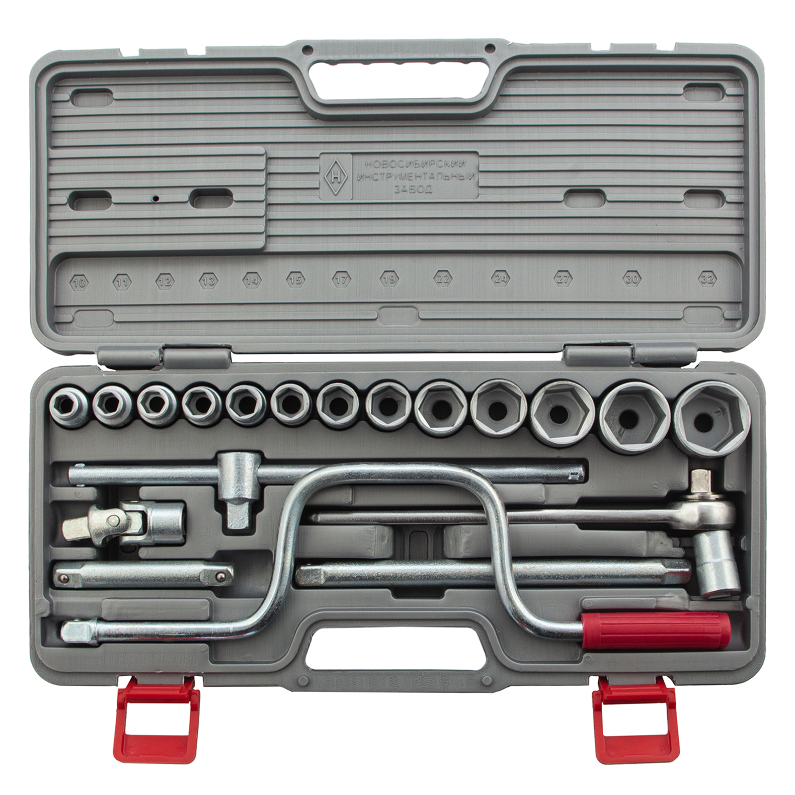 Головки 10, 11, 12, 13, 14, 15, 17, 19, 22, 24, 27, 30, 32 - 13 штКлюч трещотка - 1 штВороток Т-образный - 1 штУдлинители 125, 250 - 2 штШарнир - 1 штКоловорот - 1 штКейс - 1 штТрещотка - 1 шт |