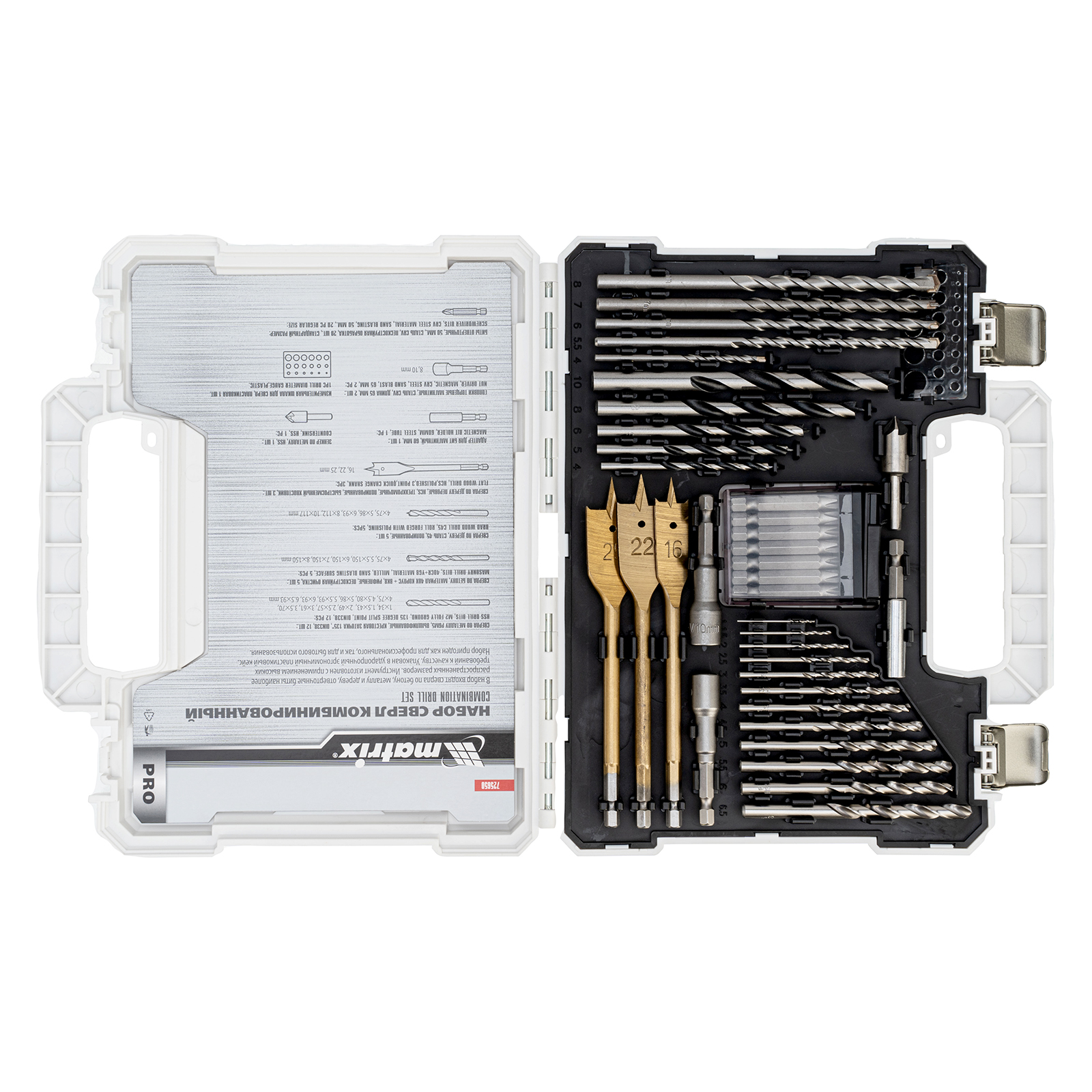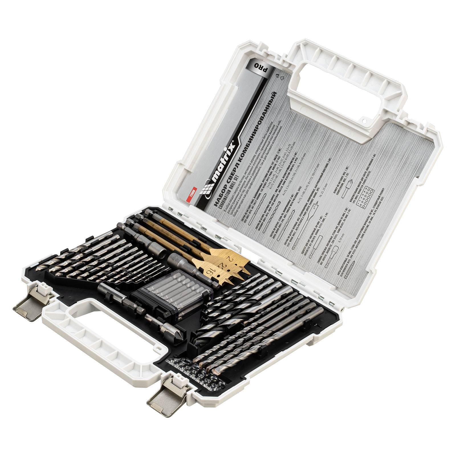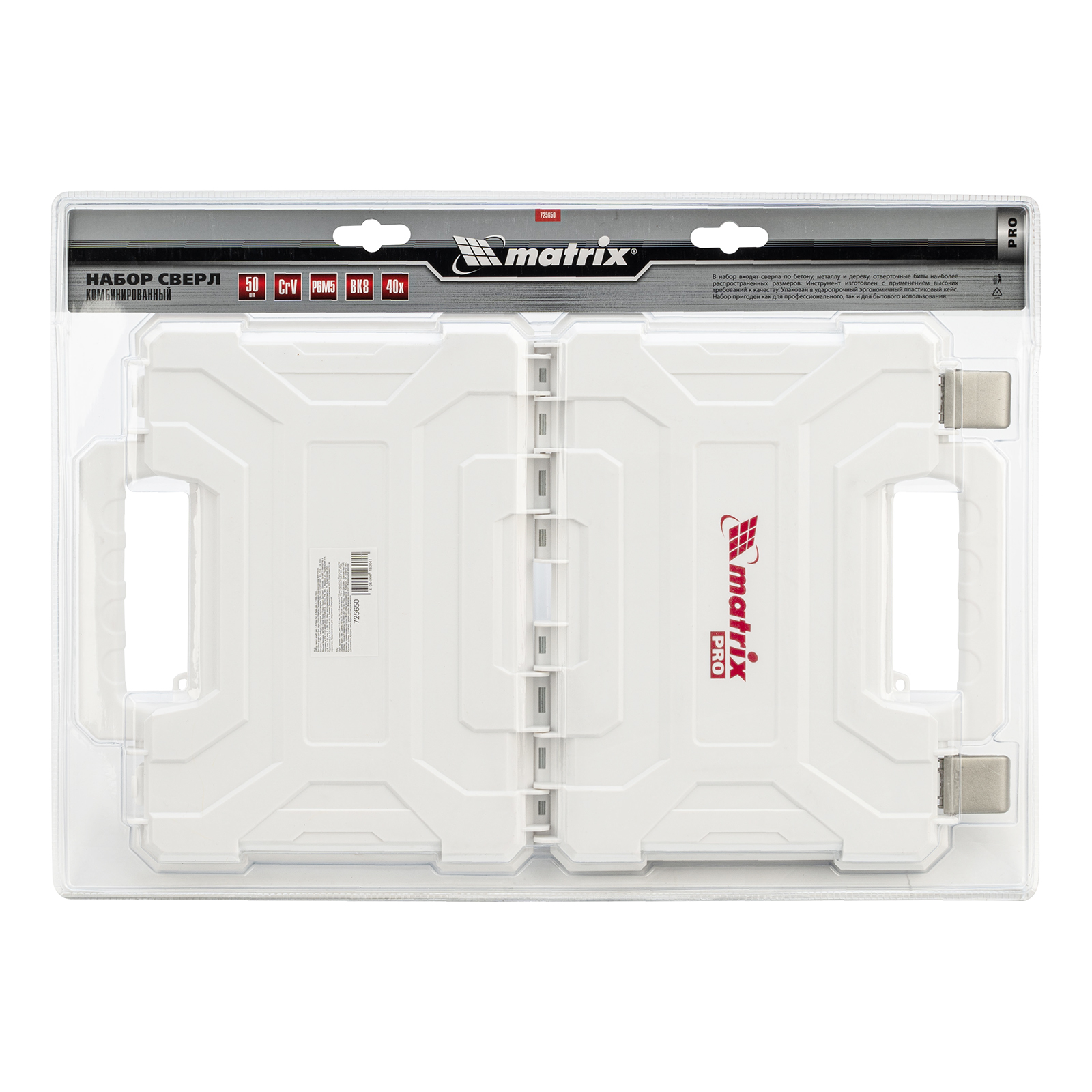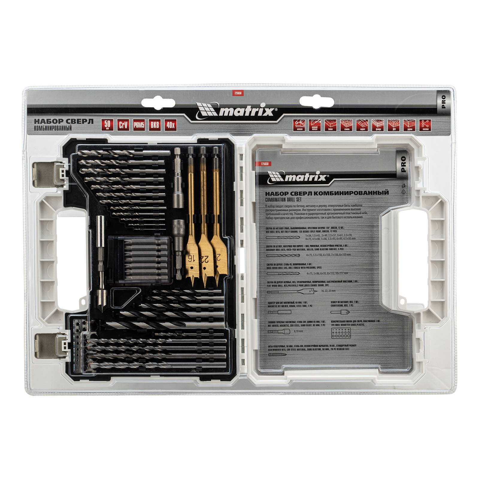 Набор сверл комбинированный, сверла по металлу 1-6.5 мм, бетону 4-8 мм, дереву 4-10 мм, перовые 16,22,25 мм, биты 20 шт, адаптер, головки 2 шт, зенковка, 50 предметов Pro Matrix