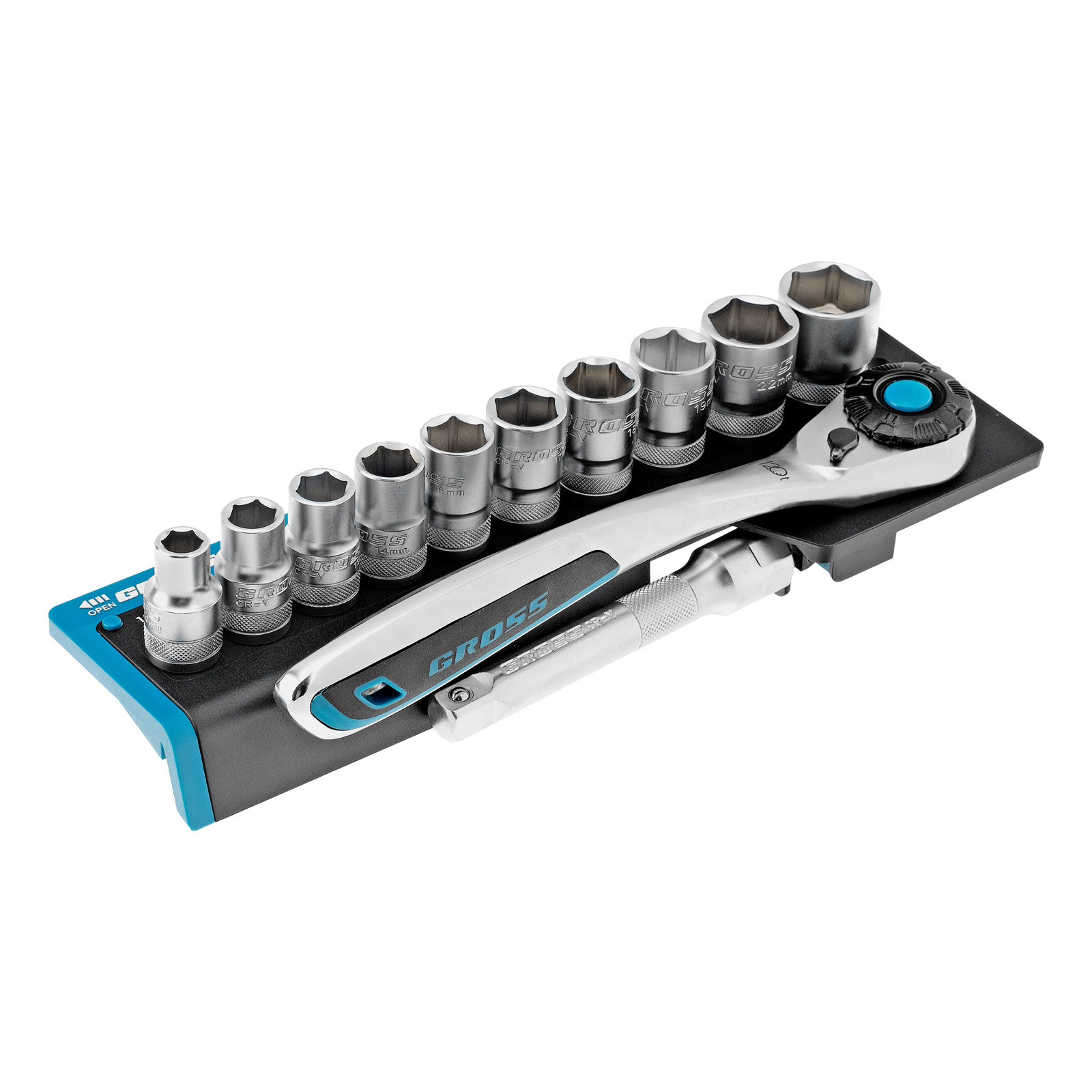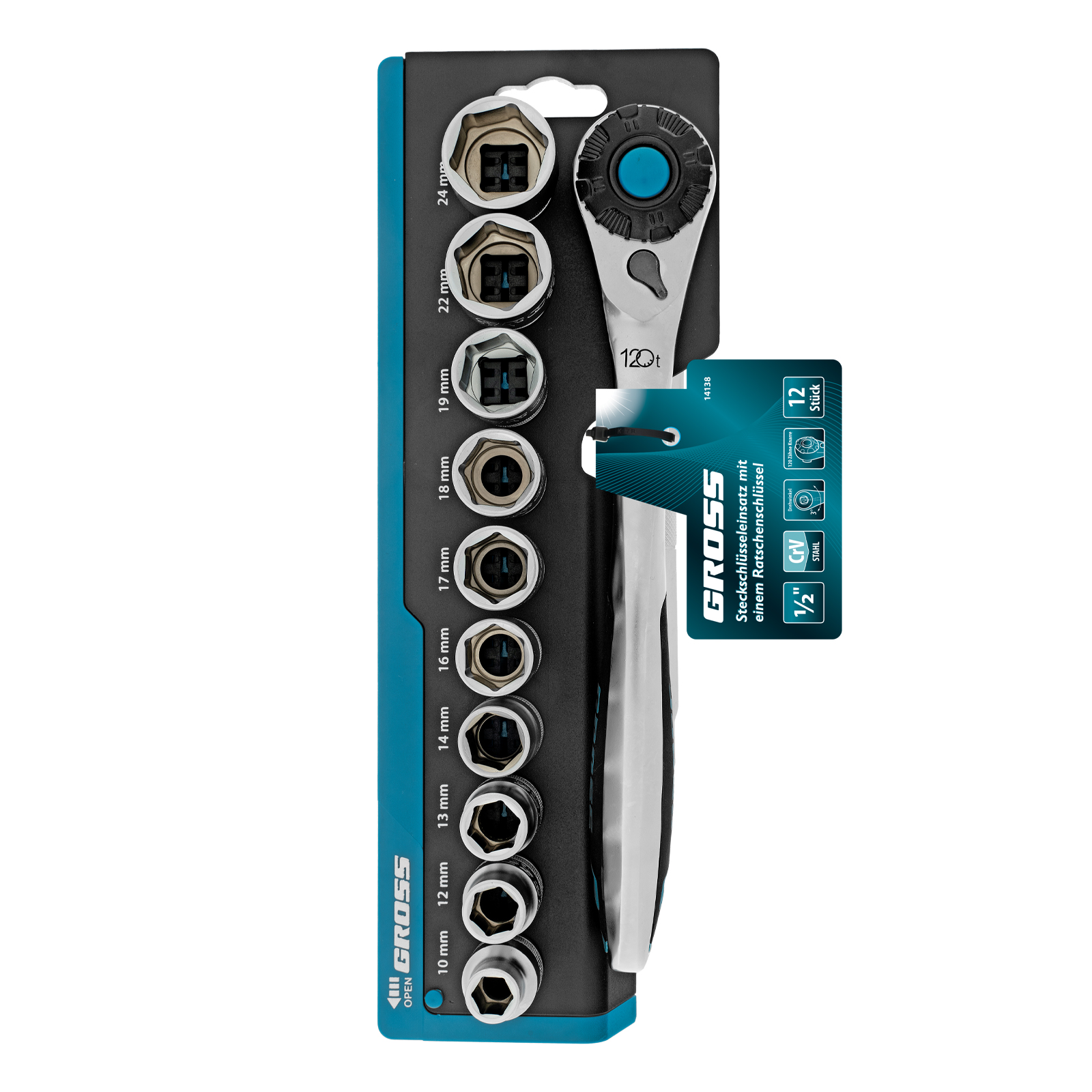 Набор торцевых головок, трещотка 120 зубьев, 1/2", CrV, 12 предметов Gross
