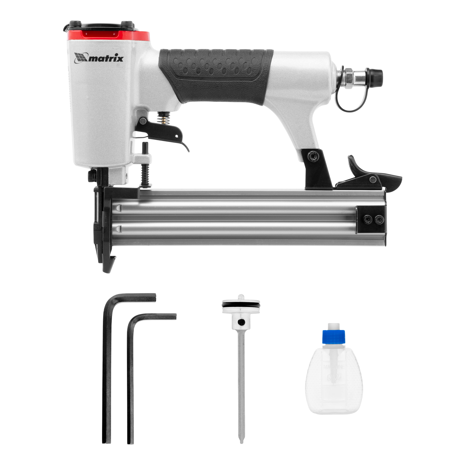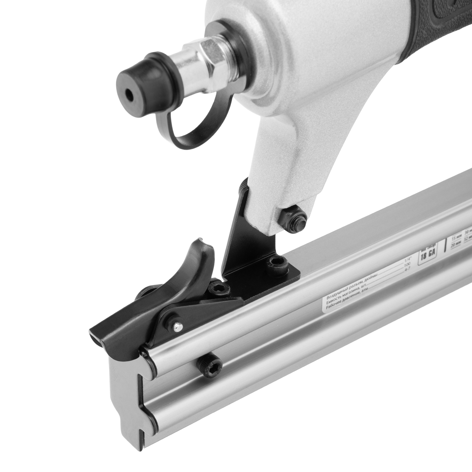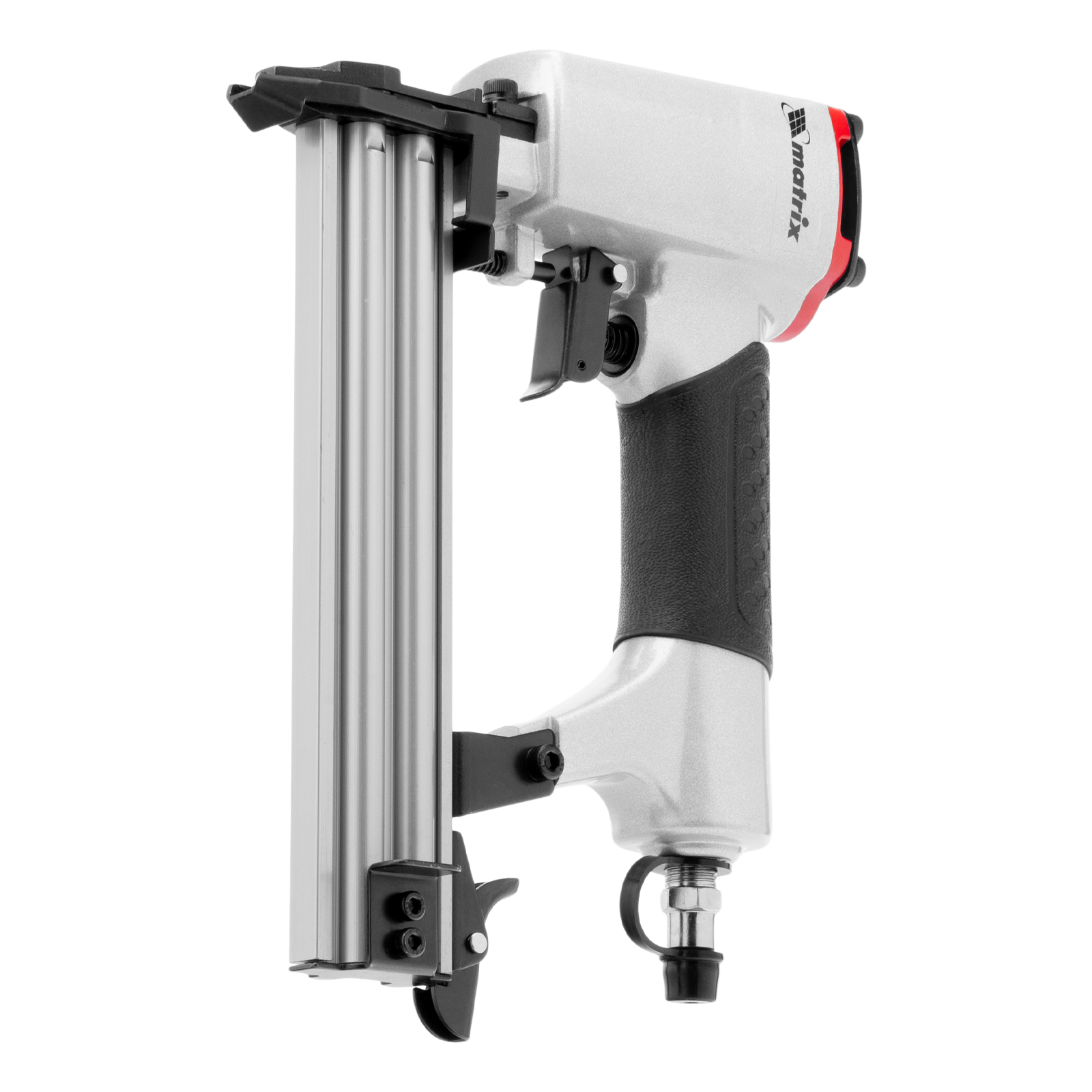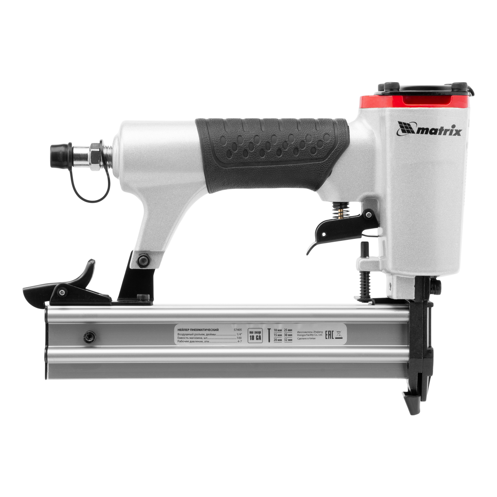 Пневматический нейлер Matrix 57405 предназначен для гвоздей 18GA длиной от 10 до 32 мм. Применяется во время строительства и ремонта, кровельных работ и производства мебели. С помощью нейлера можно закрепить паркетную доску, фанеру, ДВП, шифер, гипсокартон, ткань и бумагу.