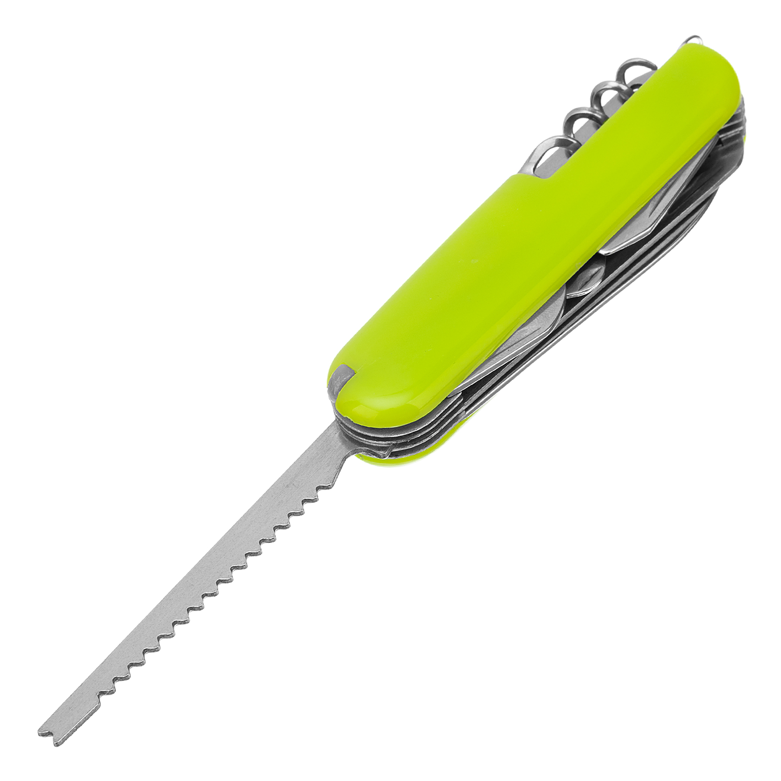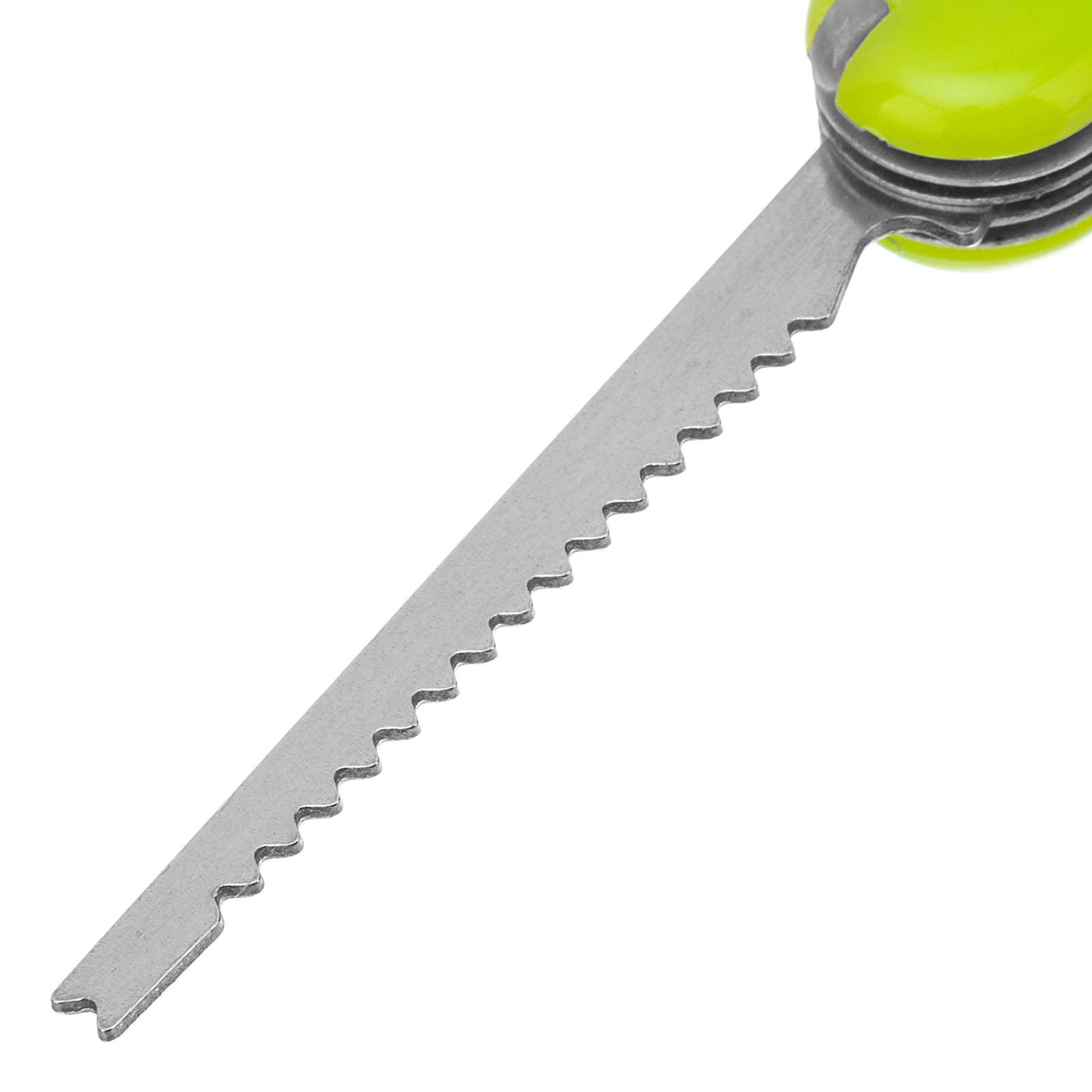 - Резка картона, бумаги, веревок, пиление тонких веток — производитель предусмотрел нож, ножницы и пилу.