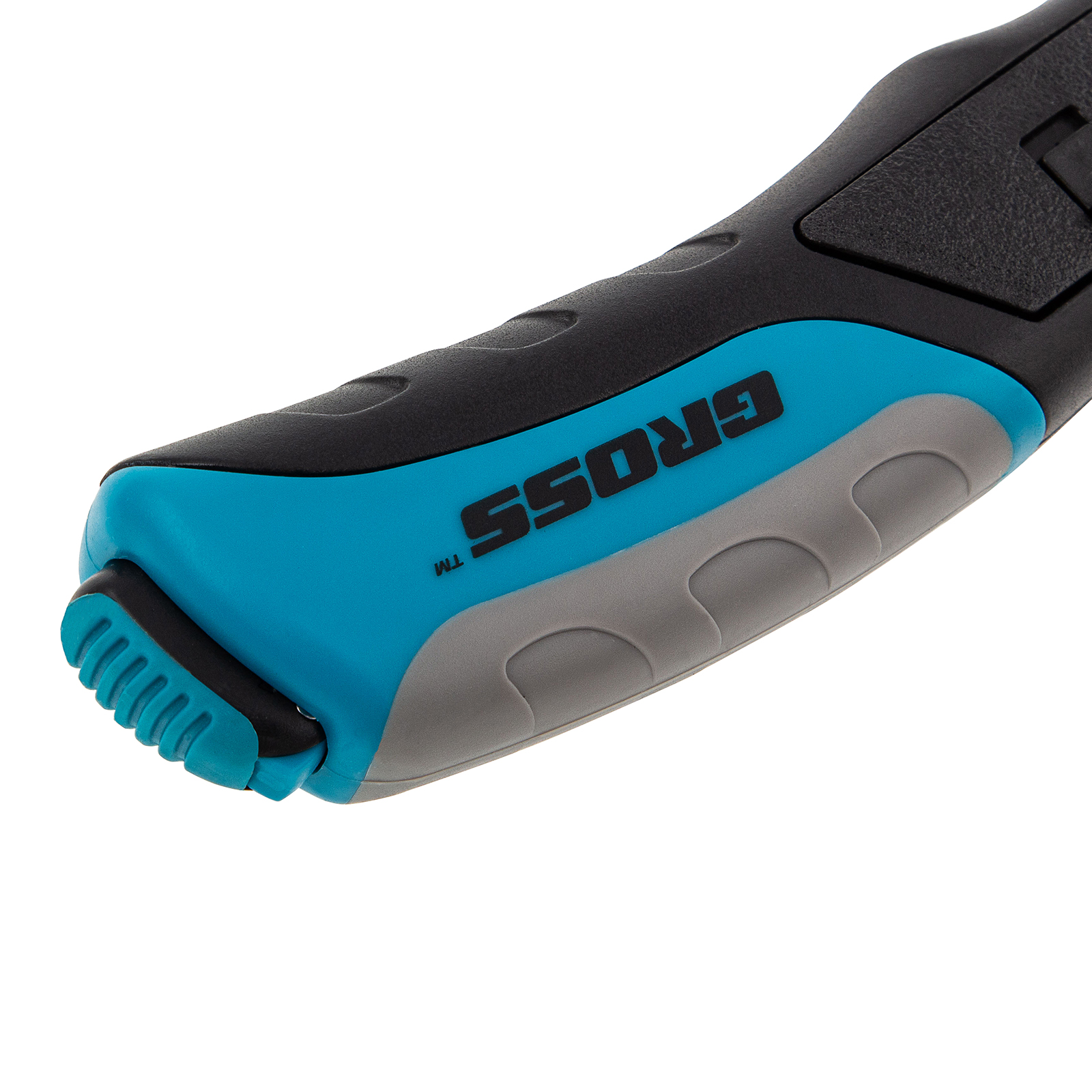 Нож ремонтно-монтажный, трехкомпонентная рукоятка, кнопочный автовыброс, возврат лезвия, 175 мм, 5 запасных лезвий Gross