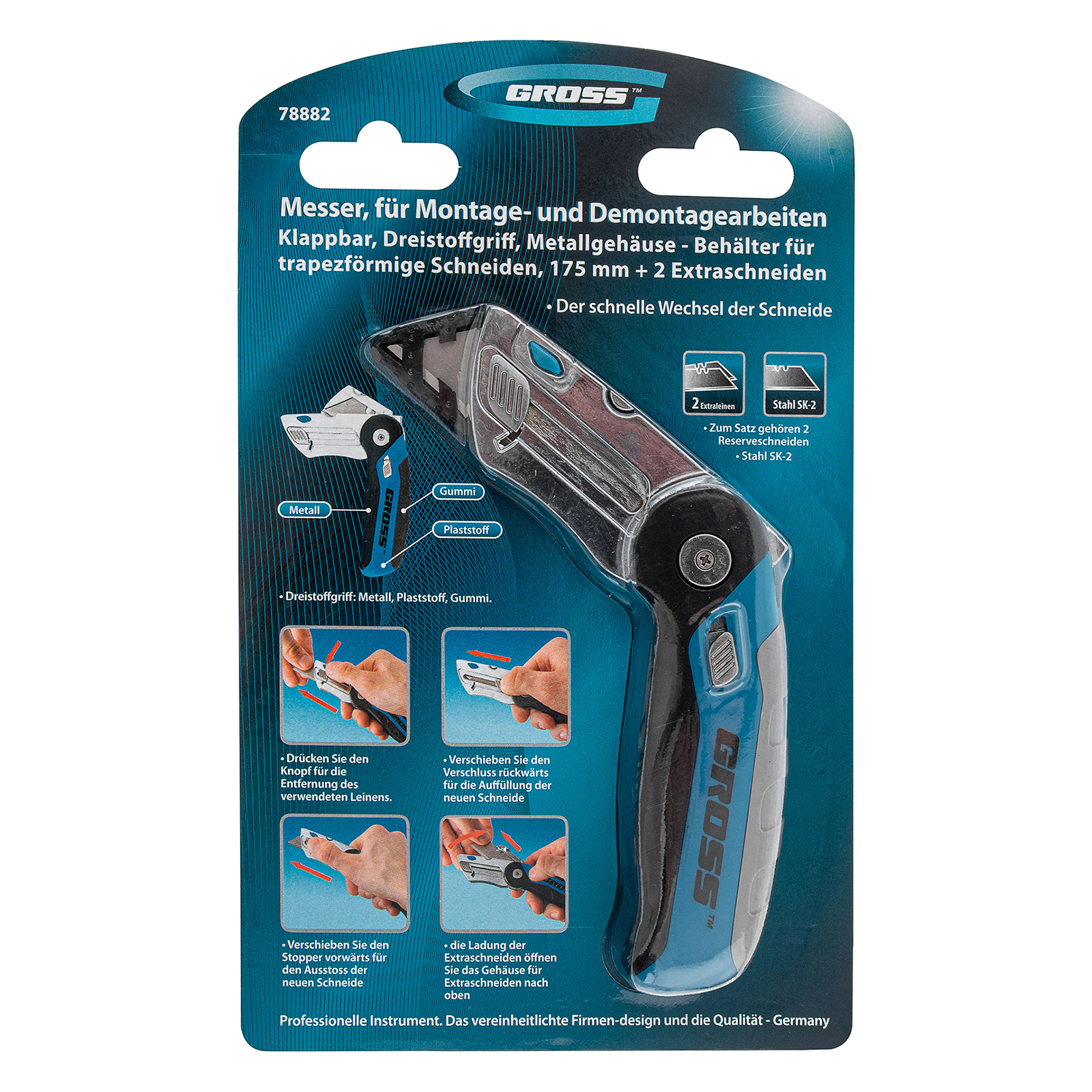 Складной ремонтно-монтажный нож Gross 78882 длиной 175 мм, с трехкомпонентной рукояткой, контейнером-держателем для лезвий и 2 запасными полотнами — режущий инструмент профессионального назначения. Используется для раскройки линолеума и обоев, разрезания картона, гипсокартона, кожи и других материалов. Нож защищен от самопроизвольного раскладывания — на боковой части имеется специальный стопор, фиксирующий держатель лезвия внутри корпуса.