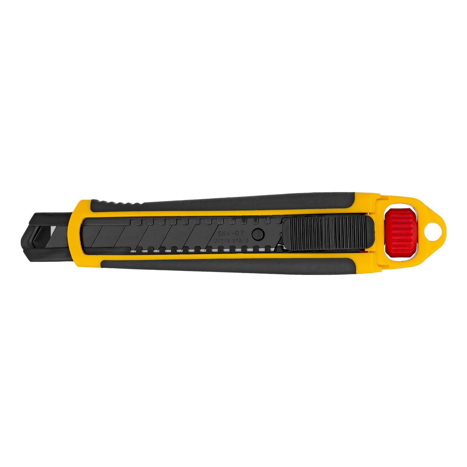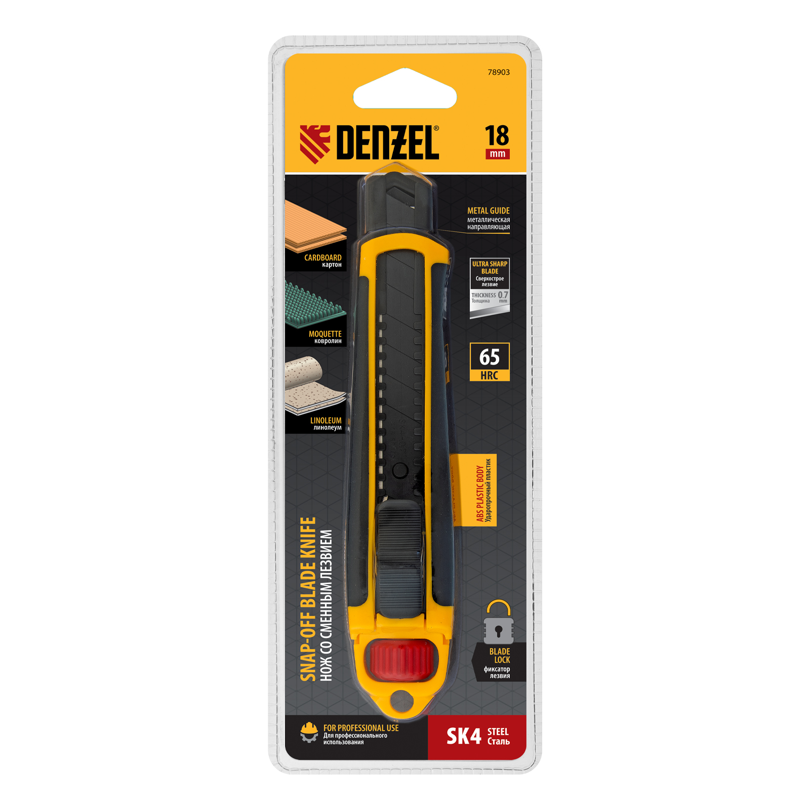 Нож, 18 мм, сменное лезвие, SK4, корпус из ABS + TPR, торцевой зажим Denzel