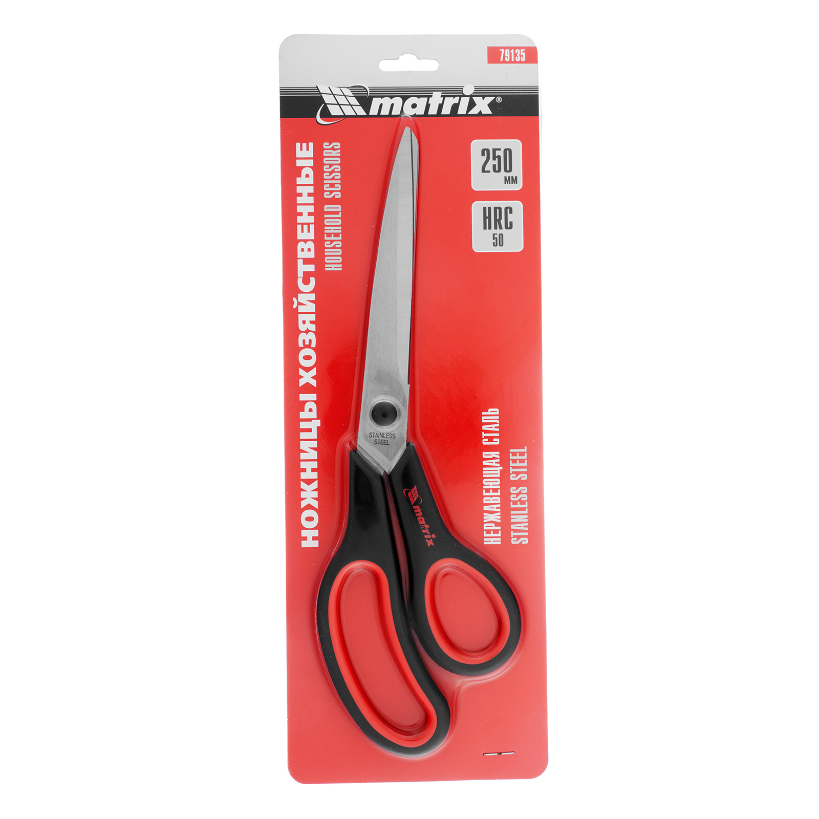 Хозяйственные ножницы Matrix 79135 длиной 250 мм, с двухкомпонентными рукоятками, используются для разрезания бумаги, картона, тканей и других материалов. Изогнутые рукоятки упрощают выполнение длинных продольных разрезов, например, при раскройке обоев. Инструмент применяется в быту.