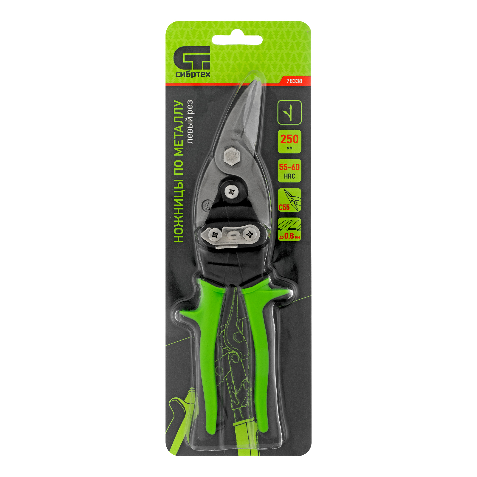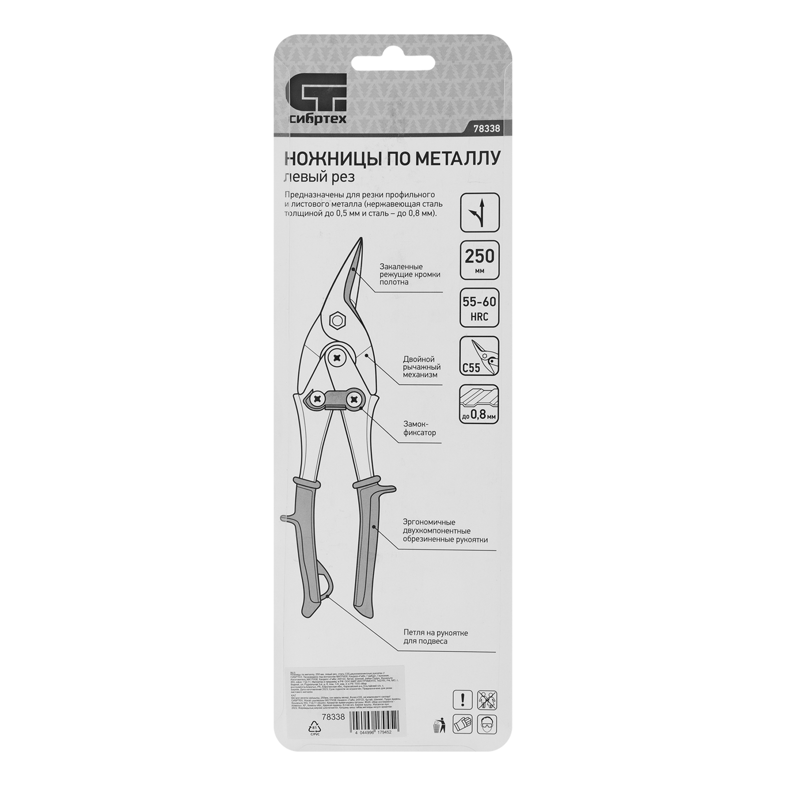 Ножницы Сибртех 78338 длиной 250 мм, из стали С55, с двухкомпонентными рукоятками, используются для левого реза профильного и листового металла. Предназначены для проведения ремонтных и монтажных работ с материалами толщиной до 0,8 мм.