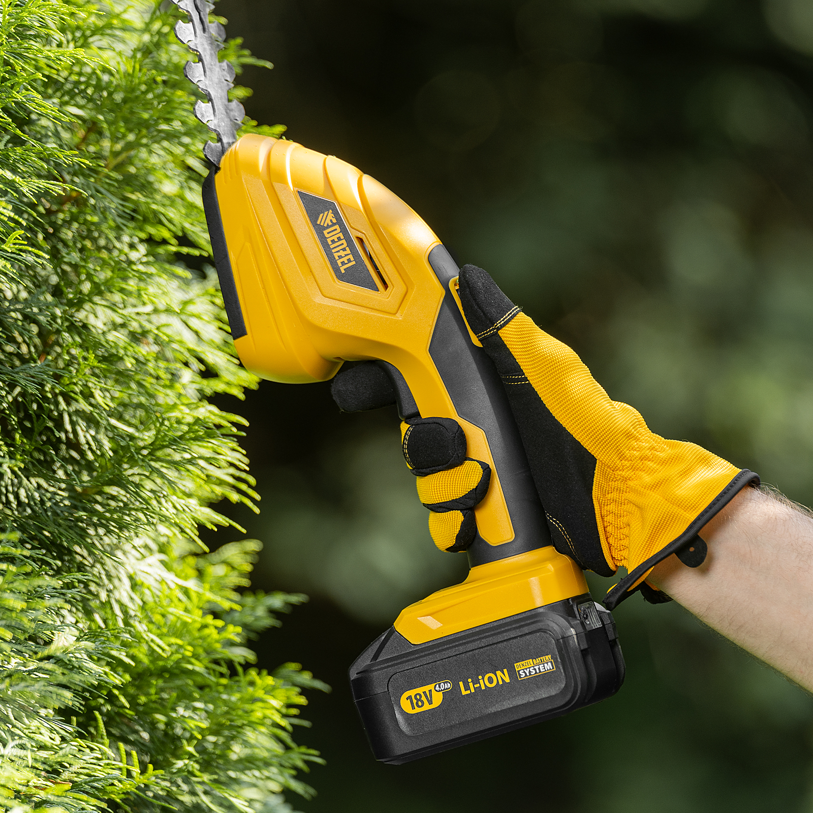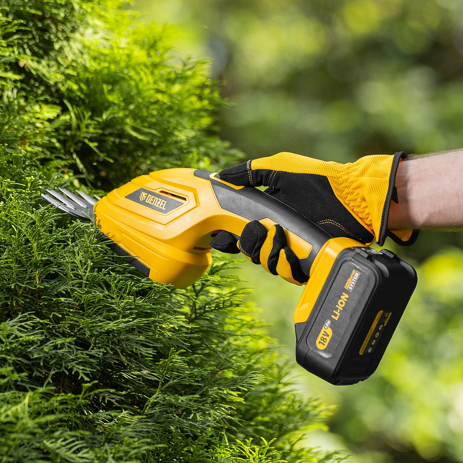 Ножницы-кусторез не зависят от сети электропитания, а значит, использовать их можно в отдаленных участках сада. Инструмент совместим с любым Li-Ion аккумулятором единой платформы Denzel Battery System 18V.