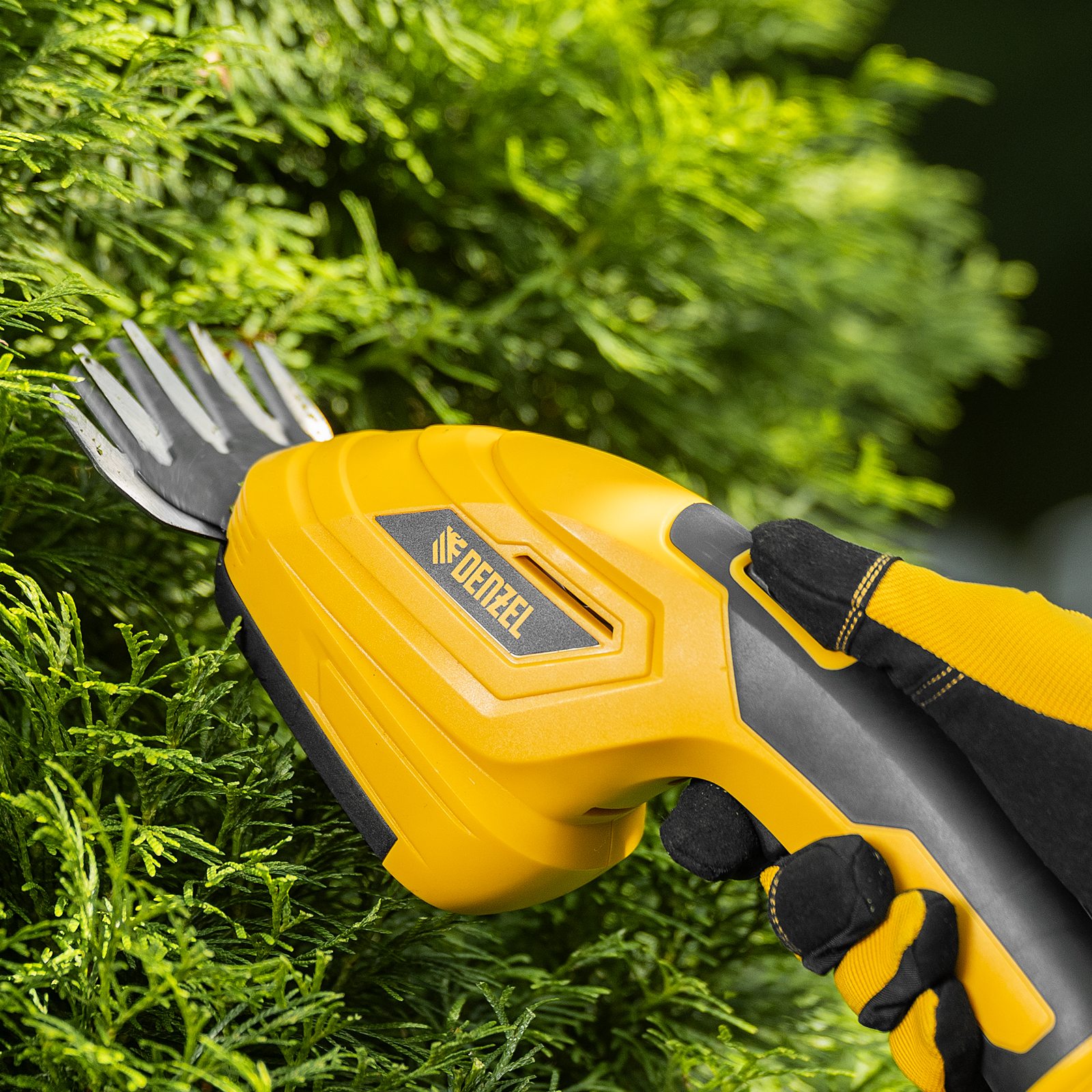 Аккумуляторные ножницы-кусторез Denzel CGS-100-0 59431 работают от батареи 18 В Li-Ion (не входит в комплект поставки) и предназначены для срезания травы, обрезки кустарников, листвы и тонких побегов деревьев диаметром до 8 мм. Инструмент оптимален для создания живой изгороди на дачном участке, создания ландшафтных скульптур из декоративных растений, подравнивания растительности вдоль заборов и бордюров.