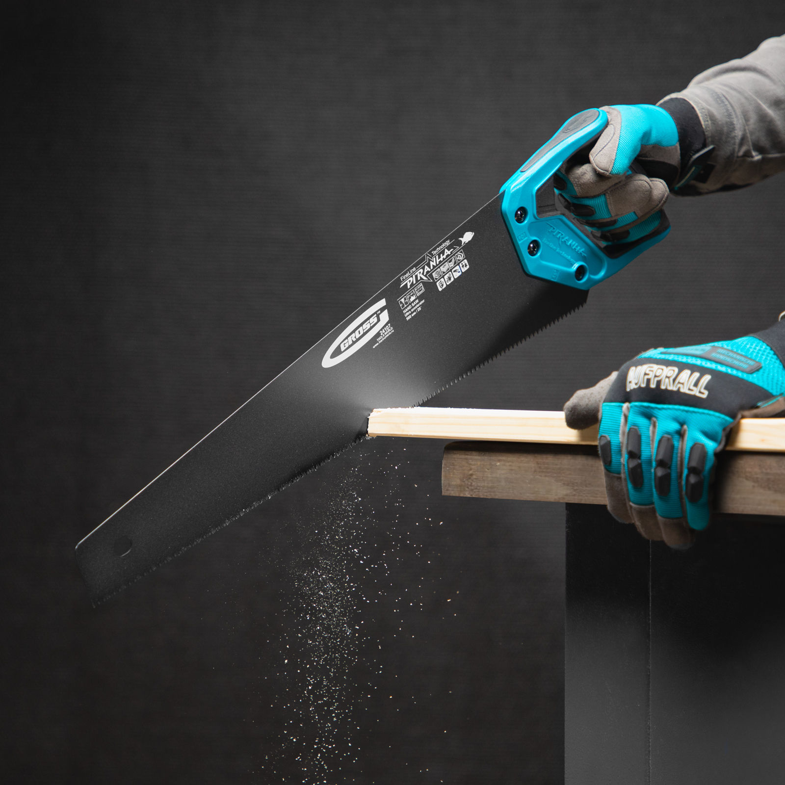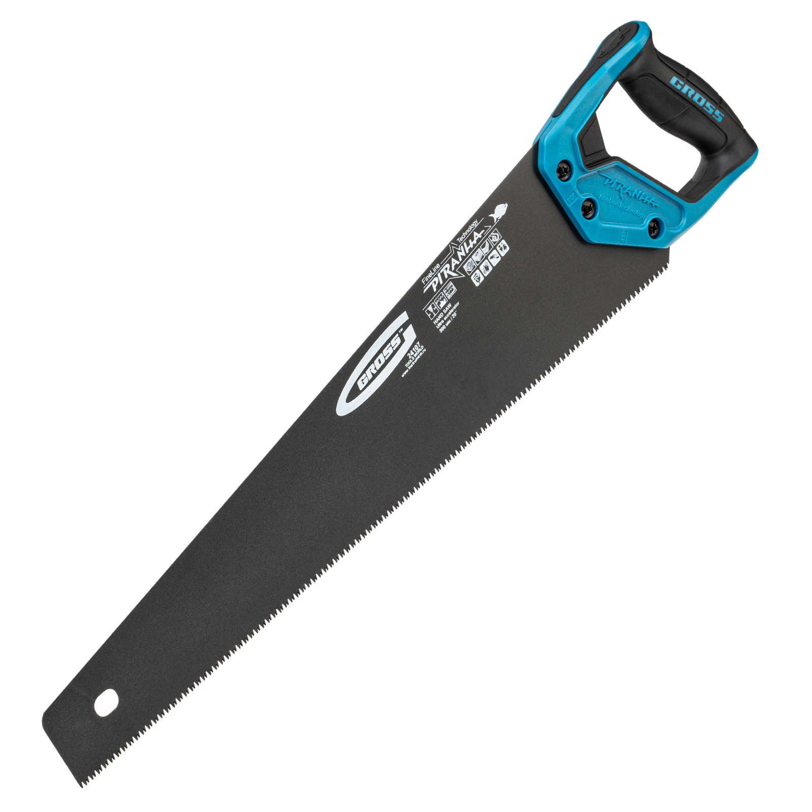 Ножовка по дереву Gross PIRANHA 24107 с полотном длиной 500 мм, калеными зубьями с 3D-заточкой и шагом 11-12 TPI, с тефлоновым покрытием полотна и 2-компонентной рукояткой, используется для продольного и поперечного распиливания древесины различных пород, МДФ, ДСП, ДВП, ламината, а также пенополистирола, полиуретана и других синтетических материалов. Рабочая часть состоит из мелких зубьев с шагом 2-2,3 мм, что позволяет получить ровный и чистый рез. Трехгранная заточка зубьев увеличивает производительность инструмента без потери качества распиловки. Ножовка предназначена для столярных работ.
