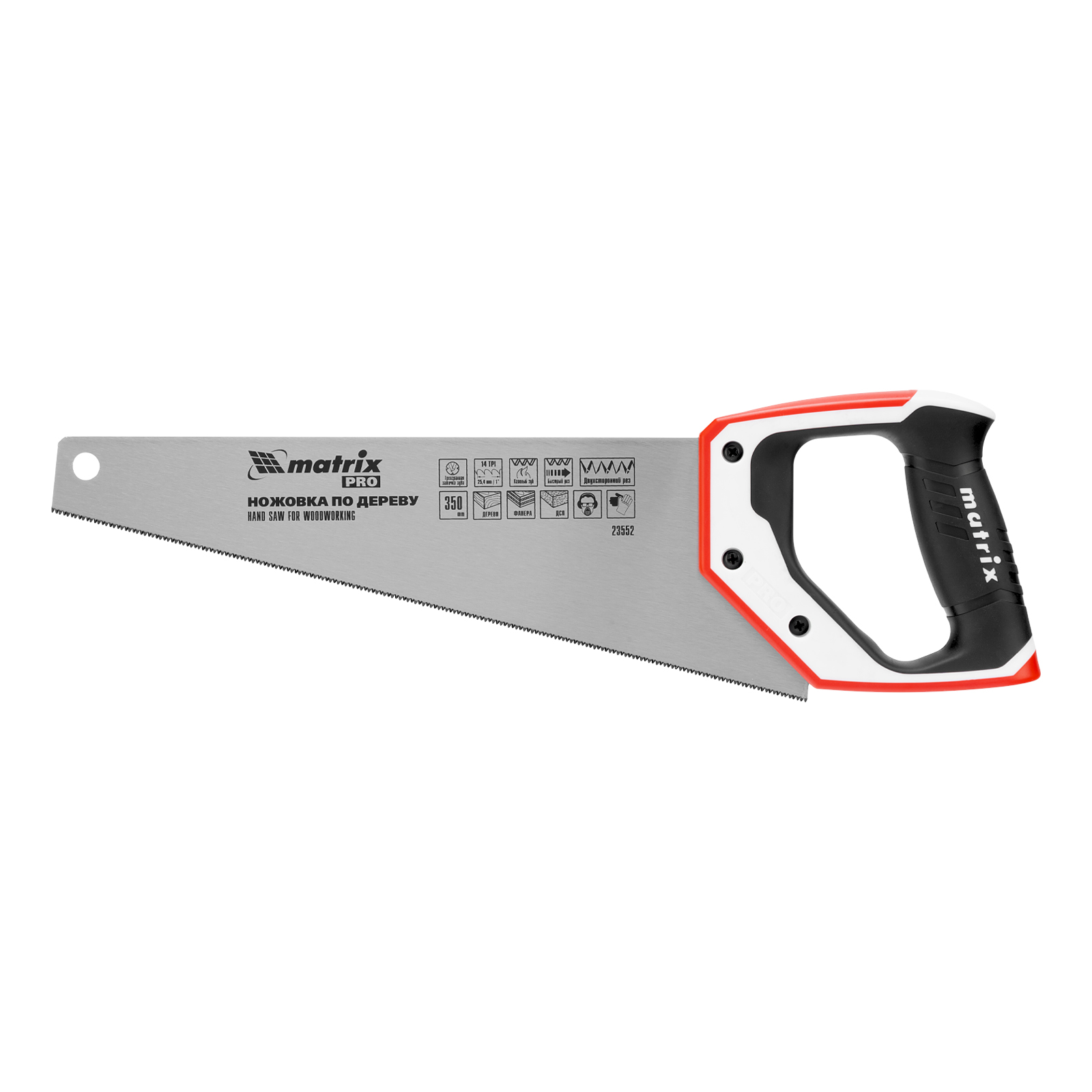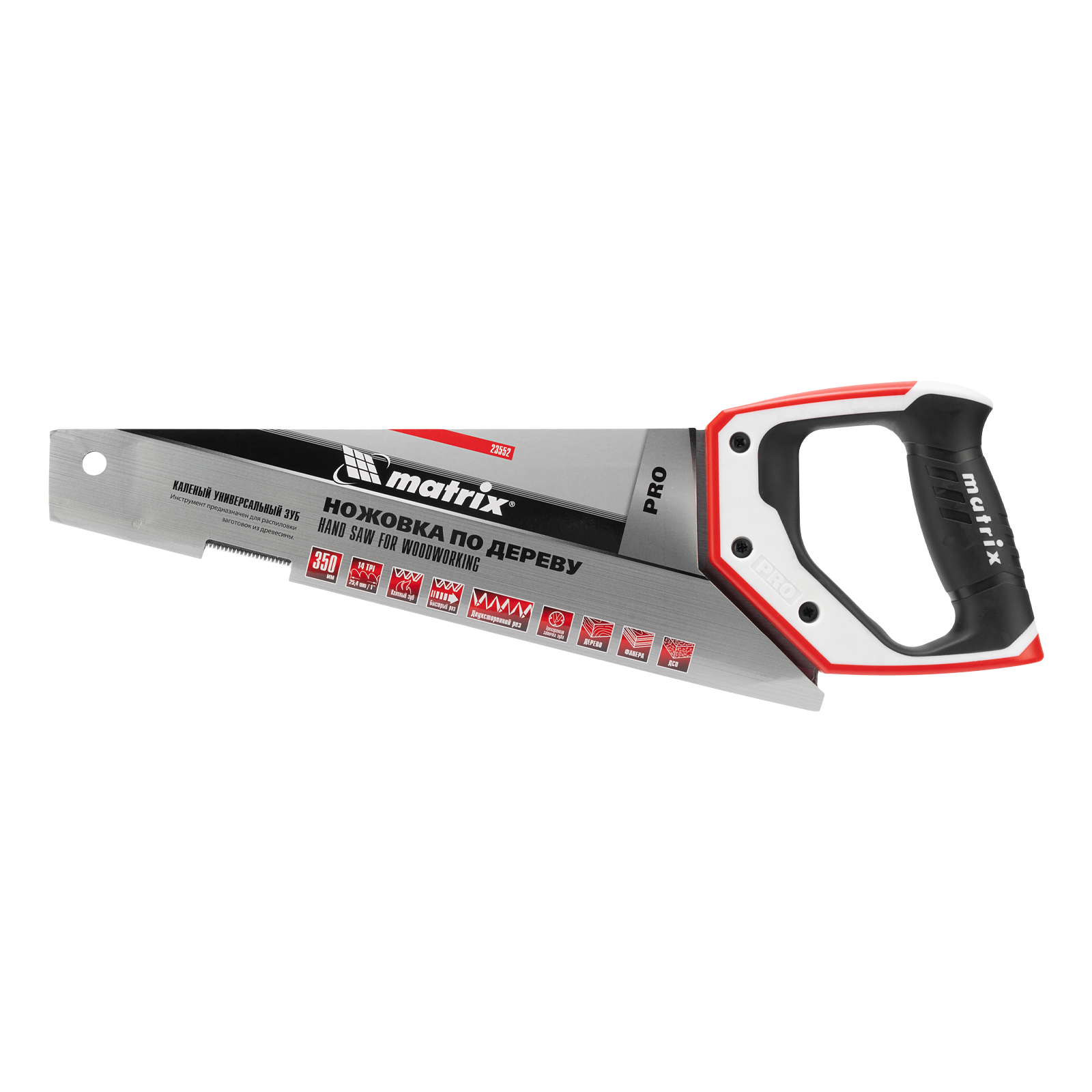 Ножовка по дереву Matrix PRO 23552 с полотном длиной 350 мм, калеными зубьями с шагом 14 TPI и 3D-заточкой, с трехкомпонентной рукояткой, предназначена для точных пильных работ с заготовками из древесины, фанеры и ДСП. Подходит для продольного и поперечного пиления. Шаг зубьев составляет 14 TPI, что обеспечивает точность реза. 3D-заточка зубьев увеличивает производительность ножовки. Инструмент будет полезен в столярной мастерской, а также пригодится в быту.